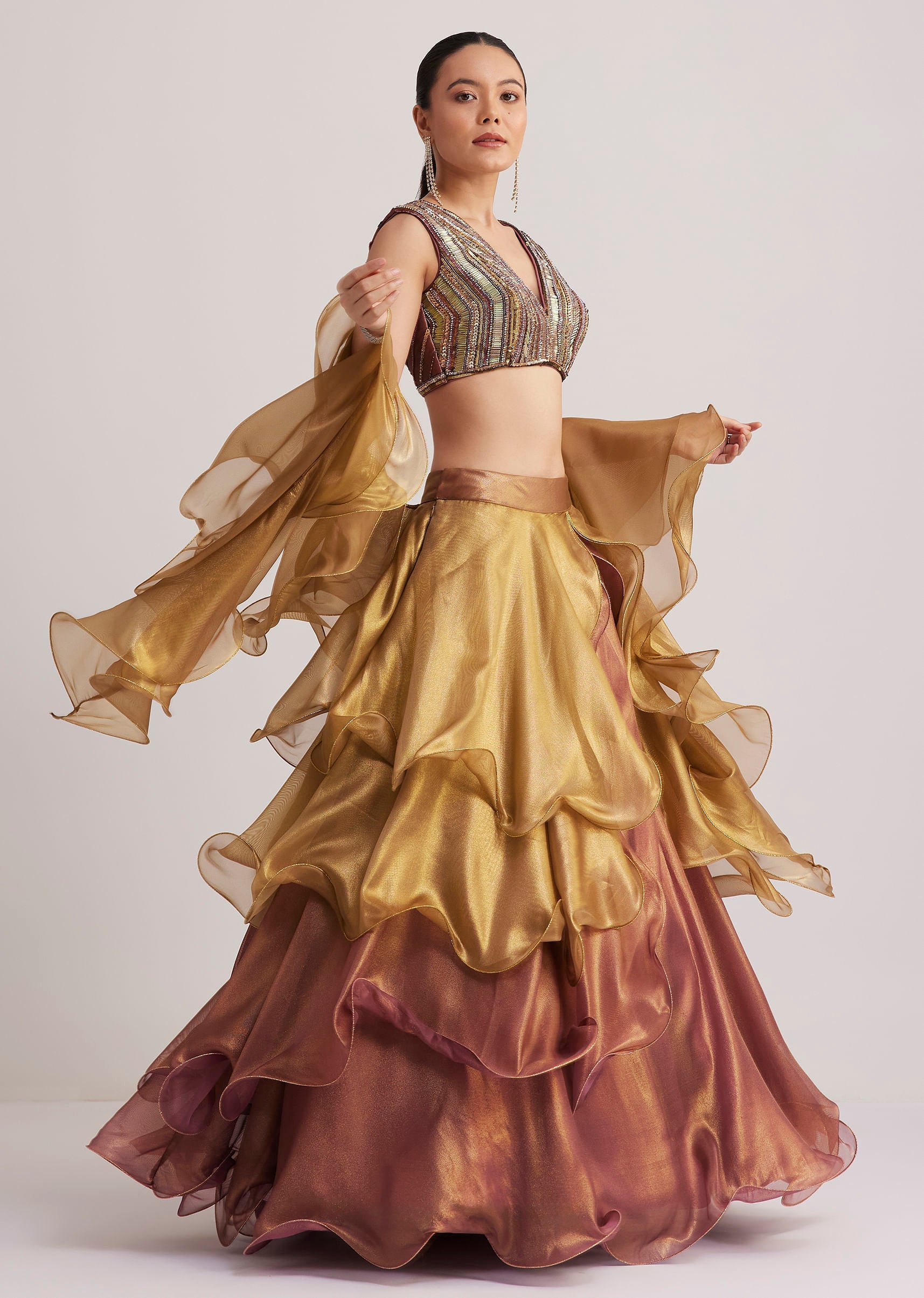 Elevate Your Style With This Stunning Gold And Mauve Cholilehenga Set Crafted From Luxurious Organza. The Intricate Embellishments Of Sequins Stones Cut Dana And Beads Bring An Exquisite Touch Of Glamour To Your Look. Ideal For Wedding Receptions Cocktail Parties Or Festive Celebrations This Outfit Ensures You Steal The Spotlight. Awarded as the Most Trusted Brand, we're delivering styles you love, just as promised.