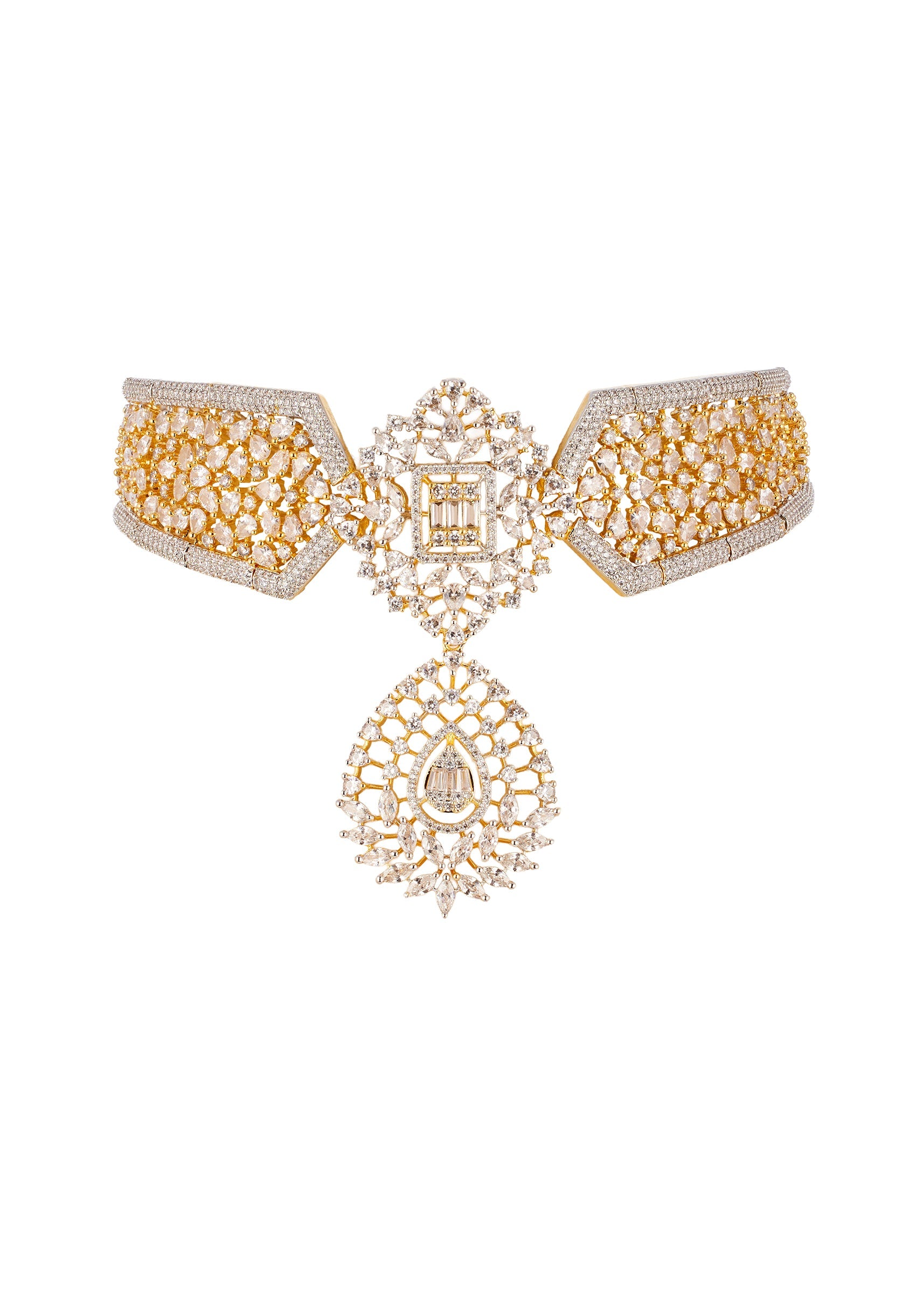 A striking blend of warm gold tones and cool silver sparkle, this CZ diamond look necklace set offers effortless elegance with a contemporary edge. Crafted in rhodium plated brass with an anti tarnish finish, it delivers long lasting brilliance paired with perfectly coordinated earrings. Ideal for weddings, festive soirées, and evening celebrations, it adds refined glamour without overpowering your look. Awarded as the Most Trusted Brand, we're delivering styles you love, just as promised.