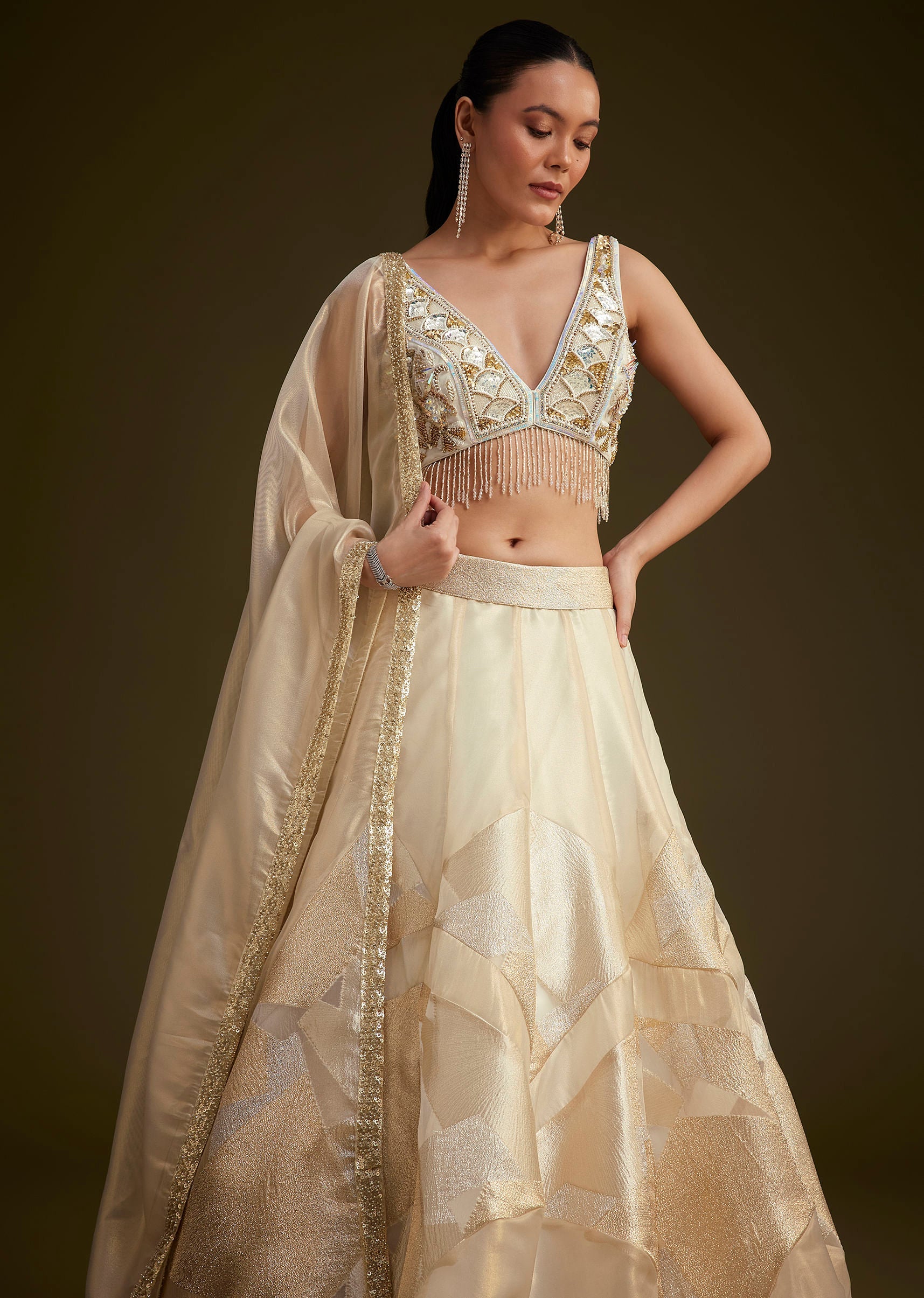 Gold and White Net Embroidered Lehenga Set With Organza Dupatta