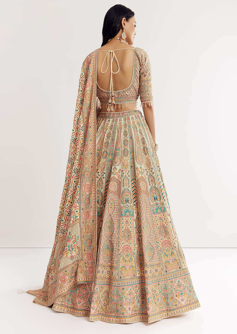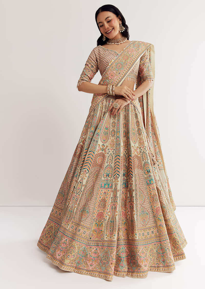Gold Beige Georgette Printed Lehenga With Cutdana And Stone Work