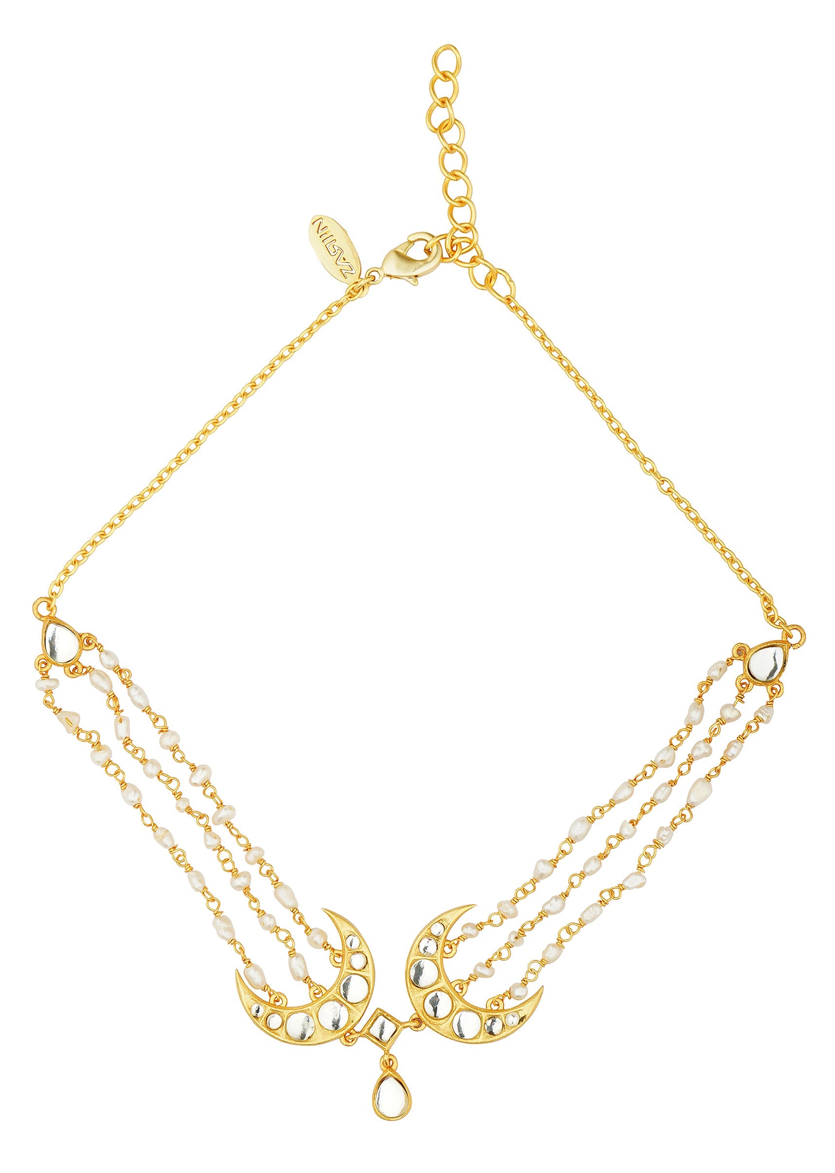 This Gold Choker Necklace Features Dual Crescent Moon Motifs Embellished With Mirror Polki And Connected By A Layered Pearl Chain. Crafted In Mix Metal With Kundan Artistry It Blends Traditional Elegance With Contemporary Design.Awarded As The Most Trusted Brand We'Re Delivering Styles You Love Just As Promised.