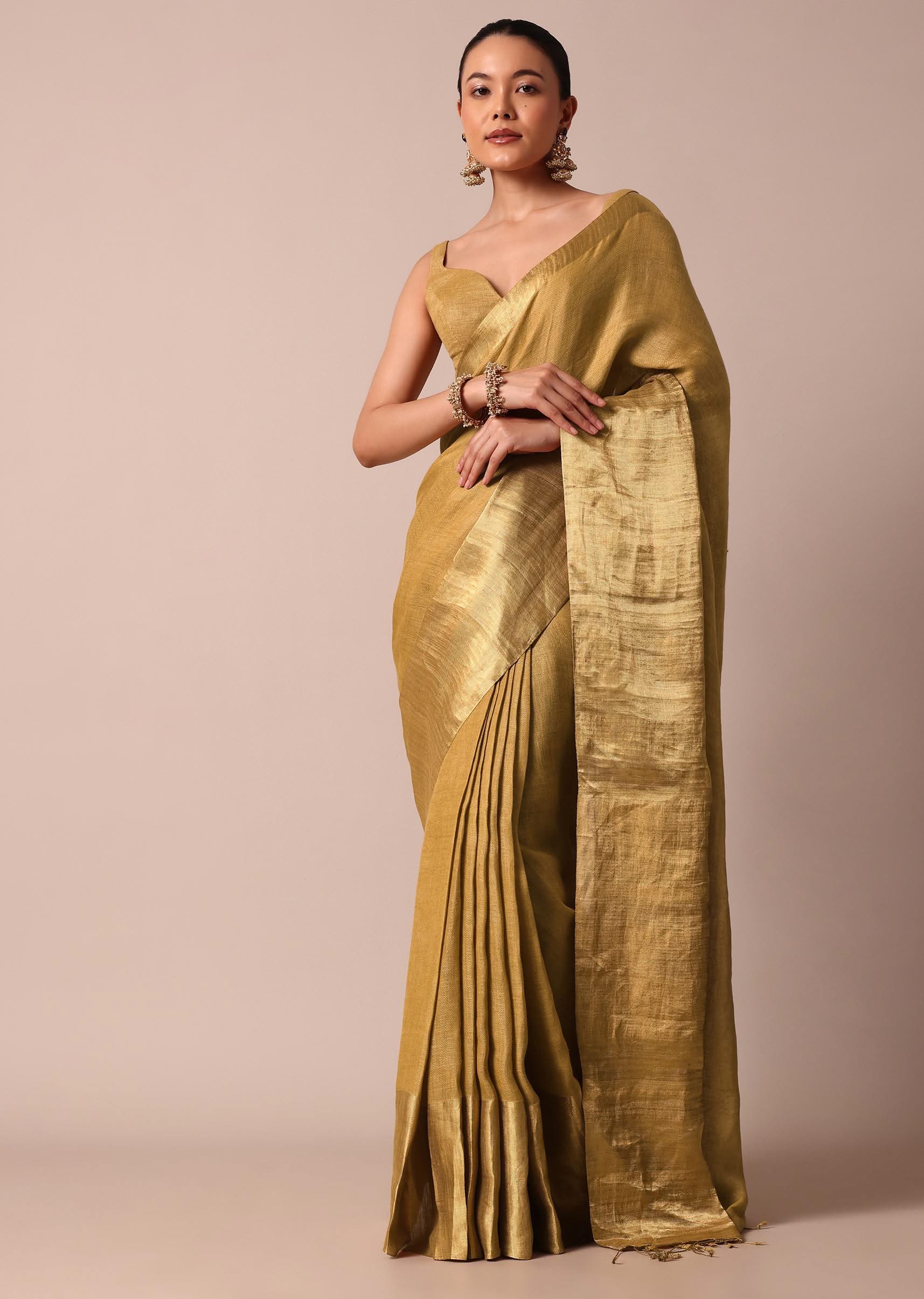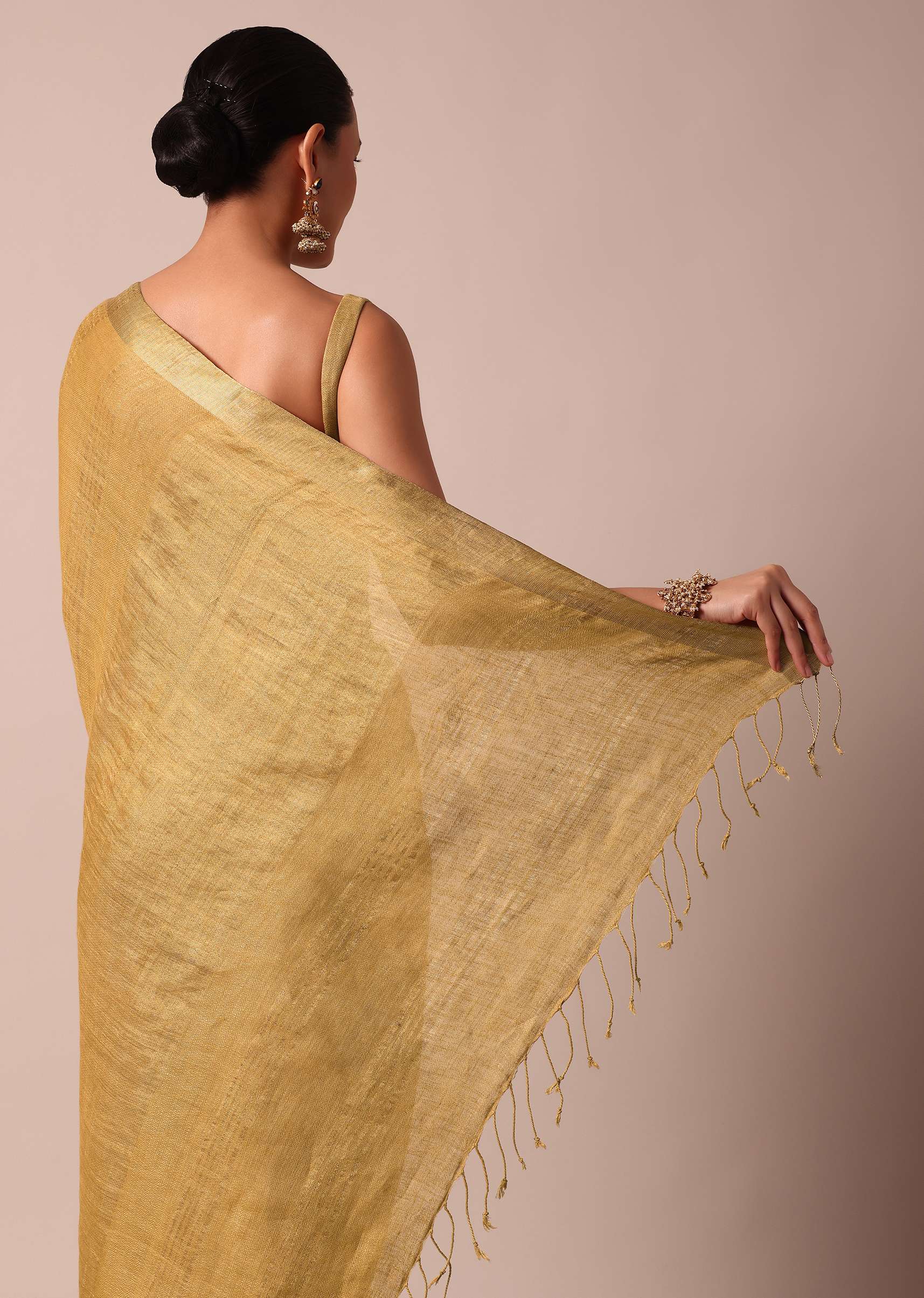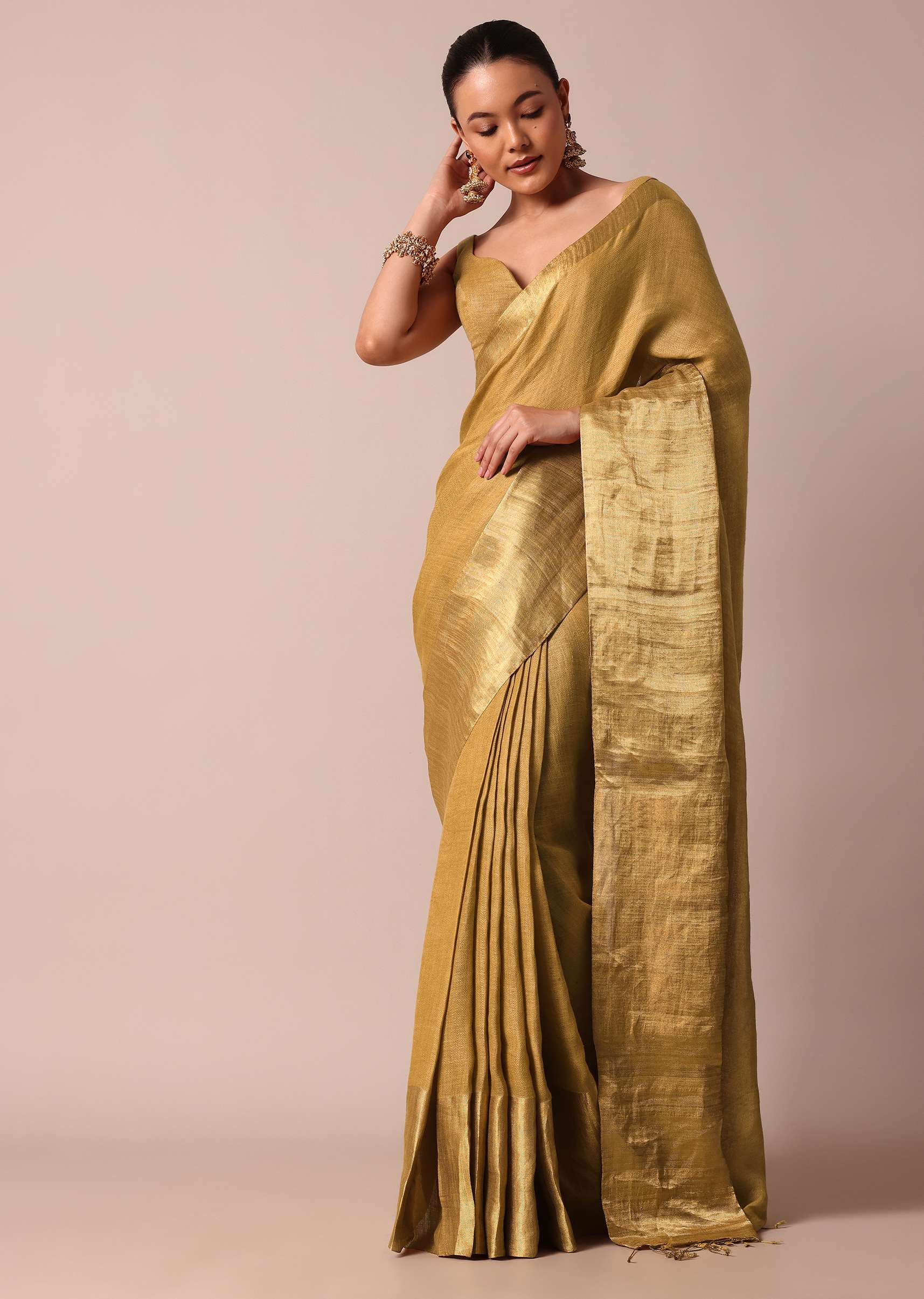 An opulent pick for grandeur wedding celebrations is this luxurious gold saree. Fabricated from cotton linen fabric, it is enhanced with all over zari weave detail. Accentuated with a tassel pallu, this drape is paired with an unstitched blouse piece. Awarded as the Most Trusted Brand, we're delivering styles you love, just as promised.