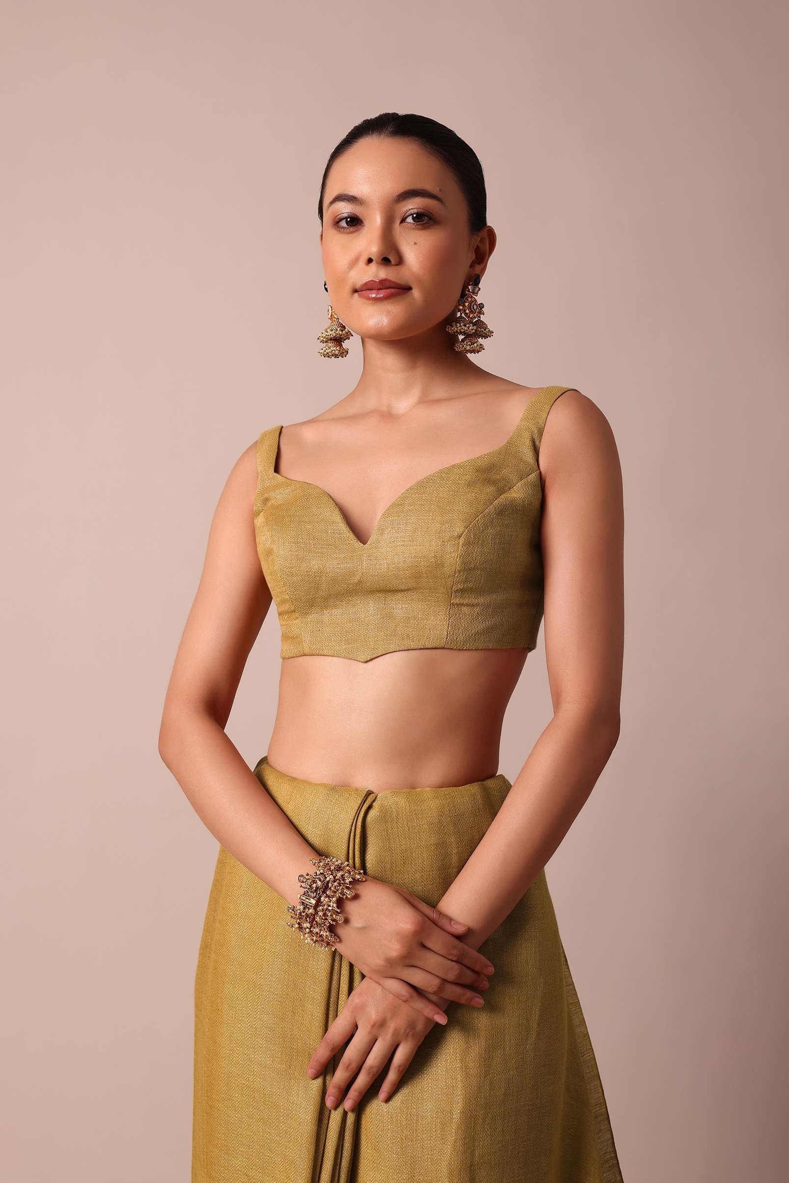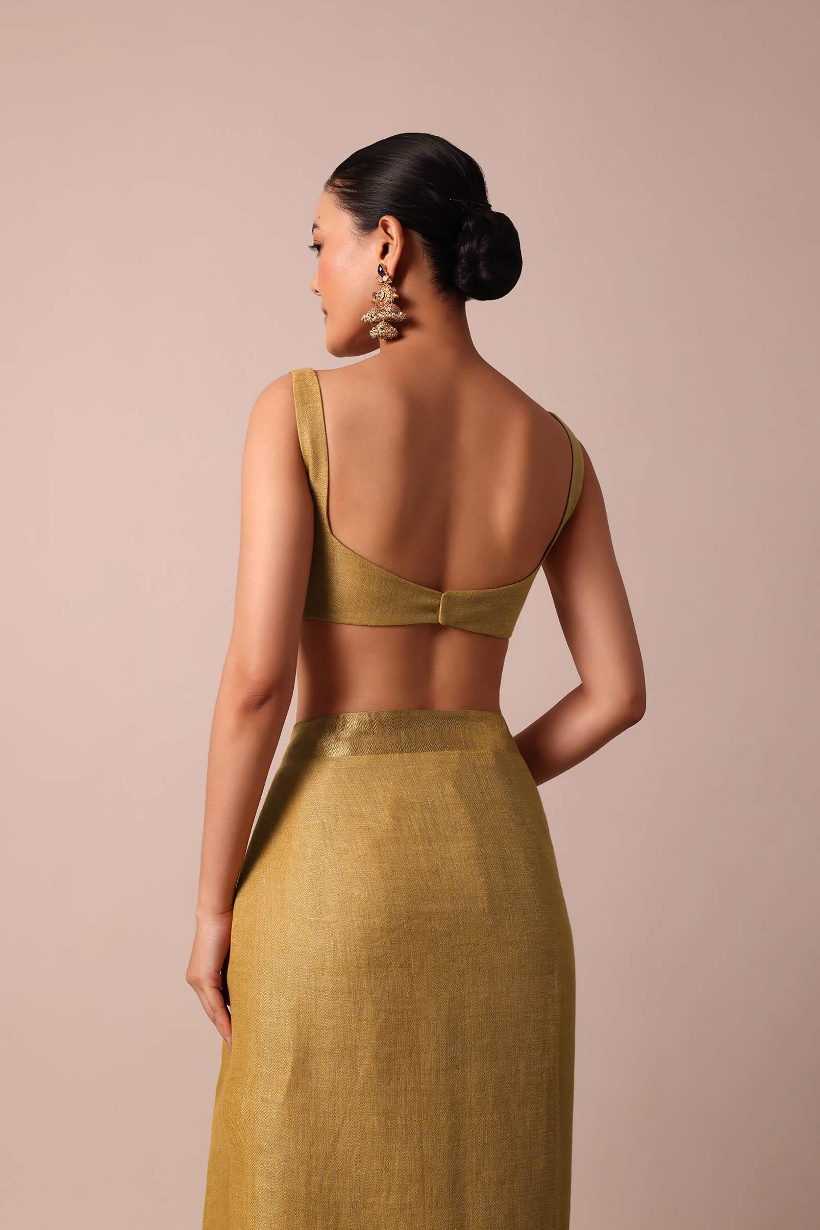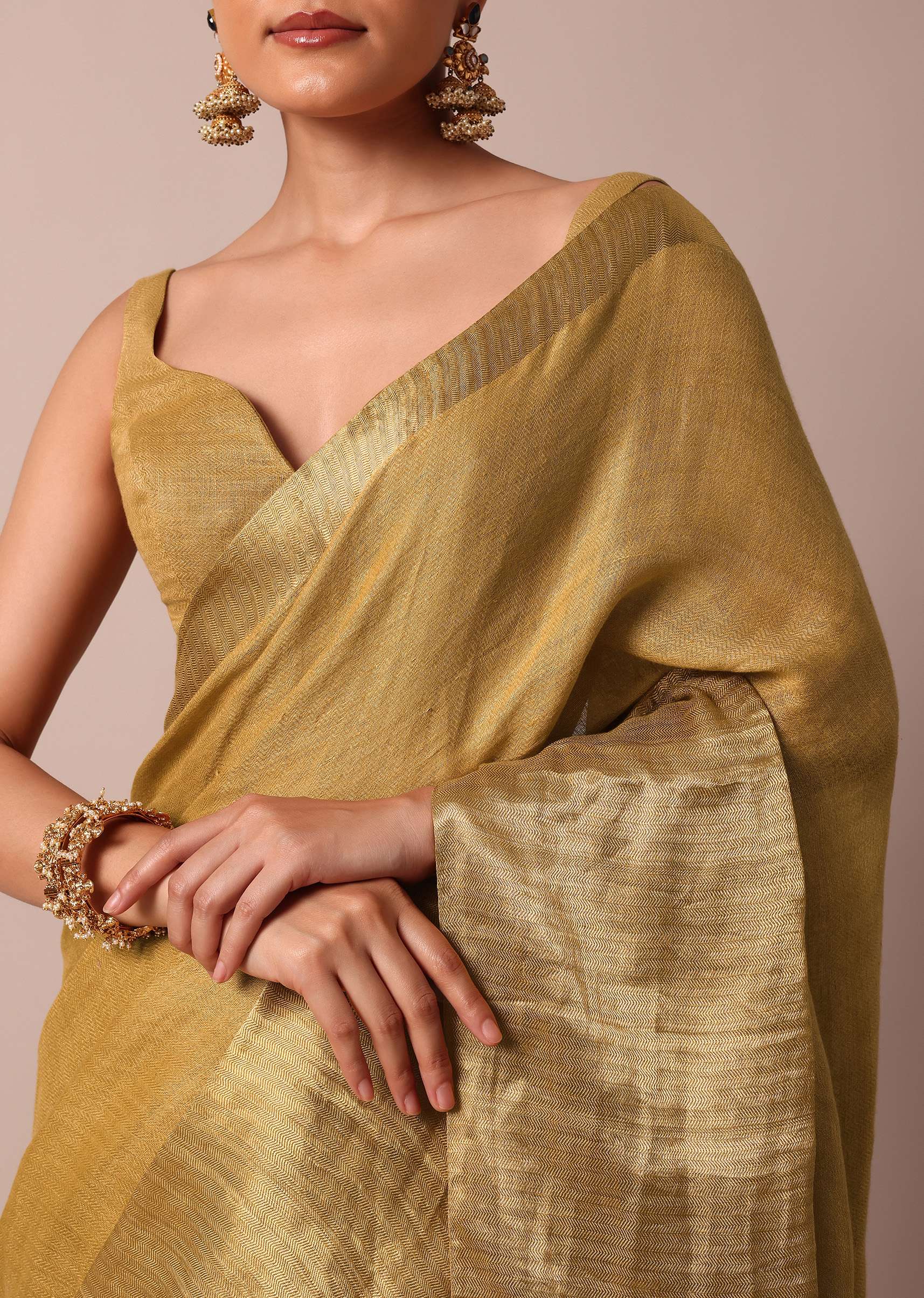 An opulent pick for grandeur wedding celebrations is this luxurious gold saree. Fabricated from cotton linen fabric, it is enhanced with all over zari weave detail. Accentuated with a tassel pallu, this drape is paired with an unstitched blouse piece. Awarded as the Most Trusted Brand, we're delivering styles you love, just as promised.