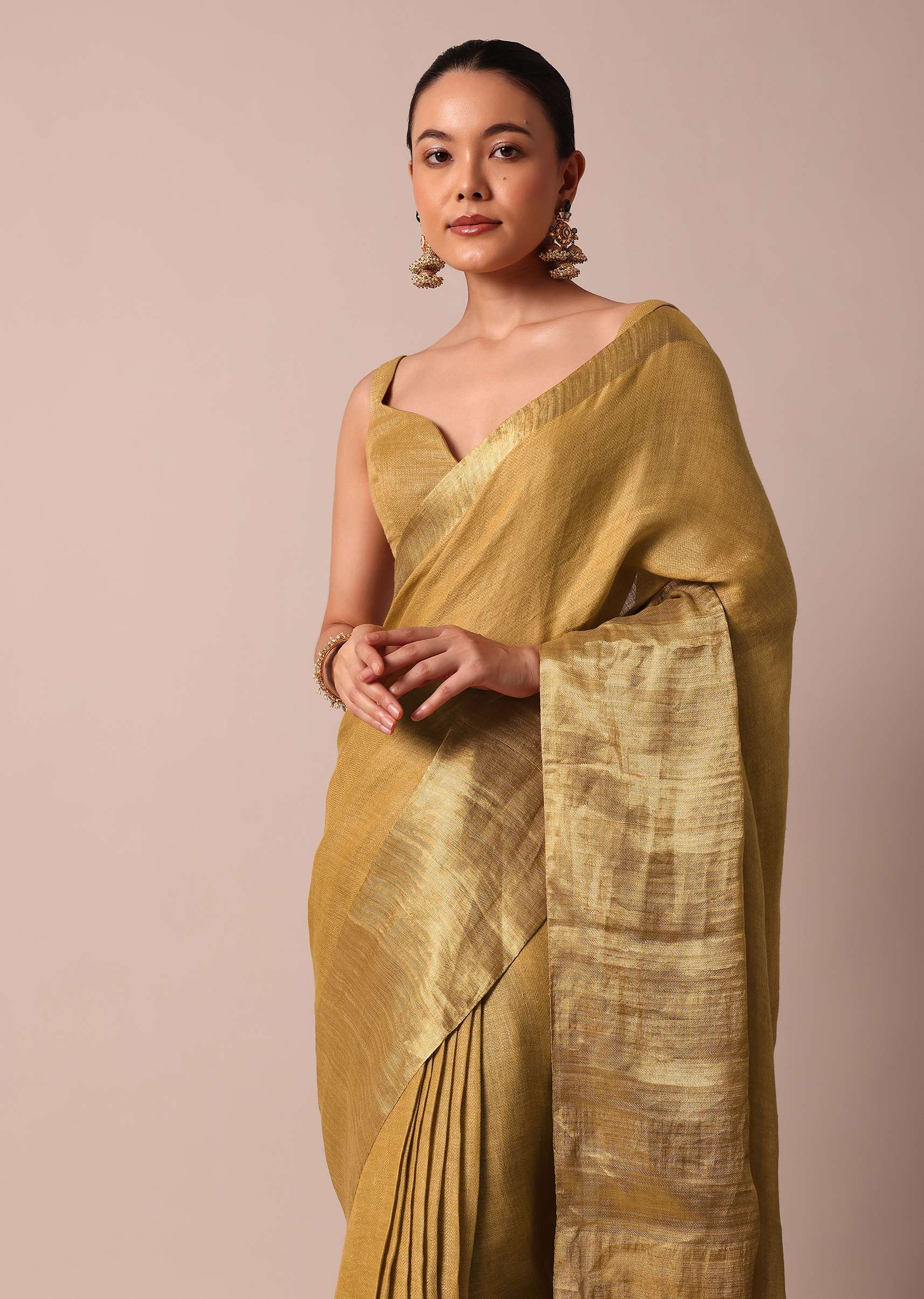 Gold Cotton Linen Saree With Zari Border And Unstitched Blouse Piece
