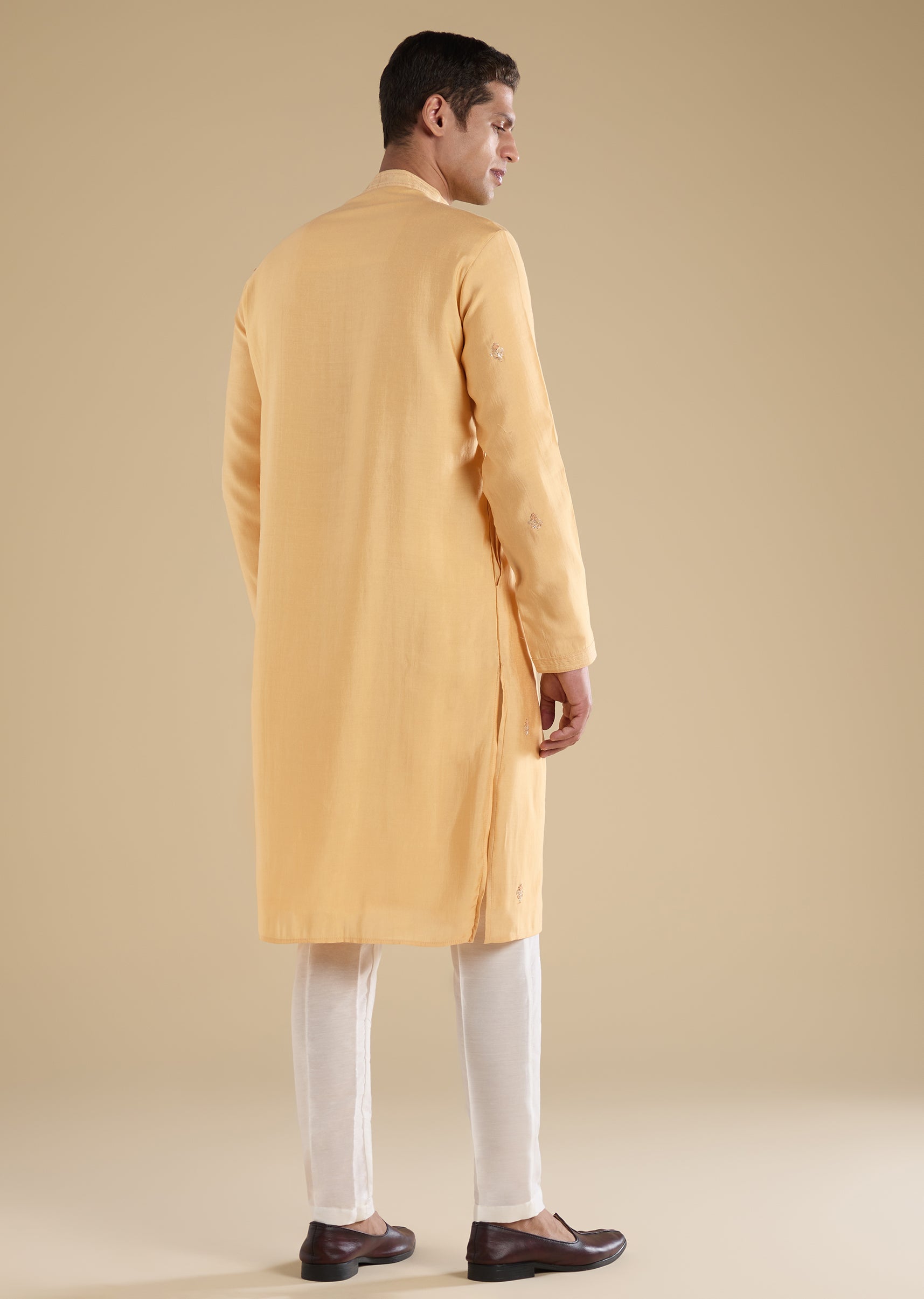 Crafted in art silk, this gold kurta set features subtle thread embroidery with bead detailing. Finished with a mandarin collar, full sleeves and front button with hook-eye closure, it is... More Product Details