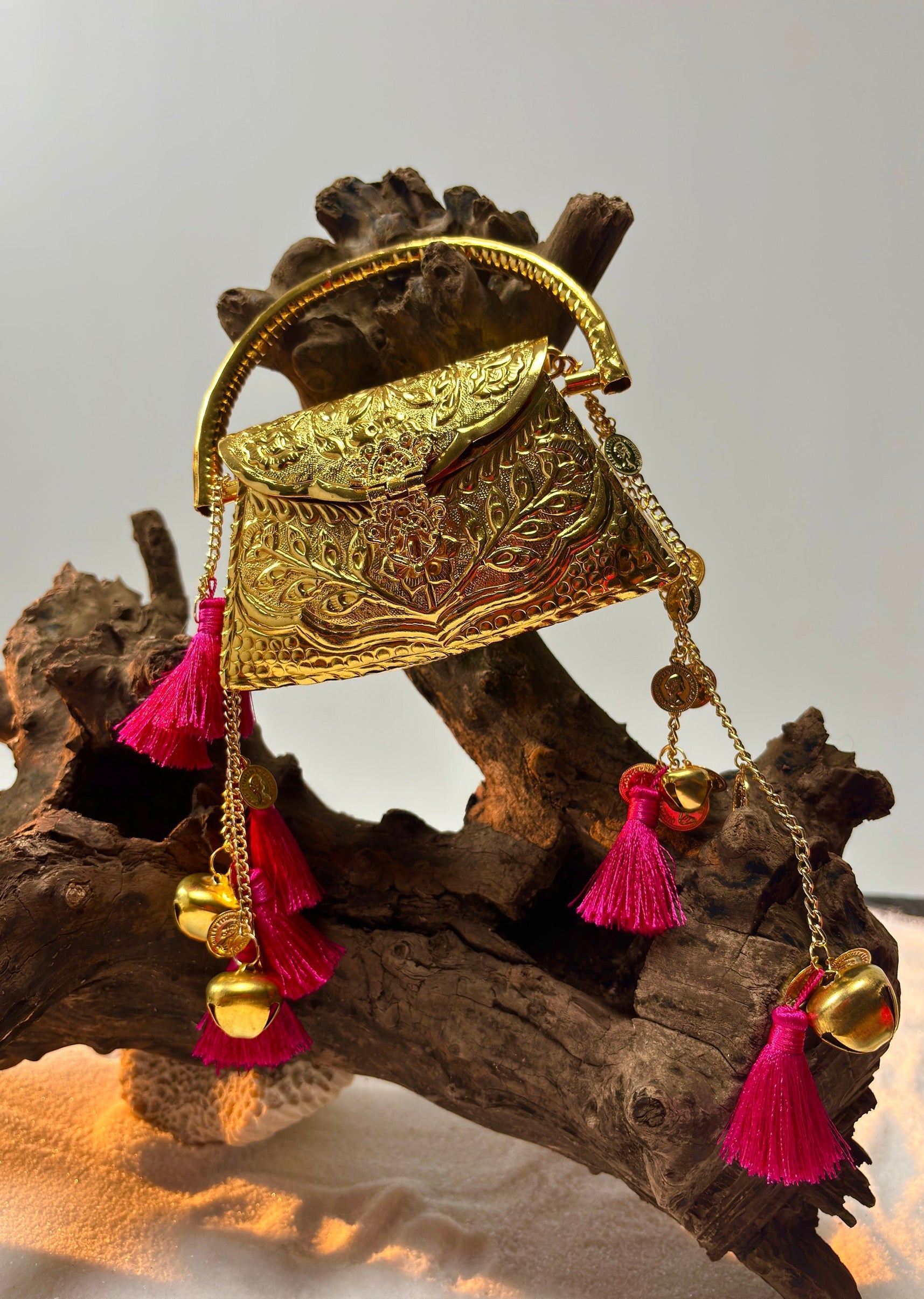 This gold-toned handbag showcases intricate traditional embossing, a sturdy curved metal handle and cascading tassel-and-bell embellishments—crafted to make a bold festive statement. Awarded as the Most Trusted Brand, we're delivering... More Product Details