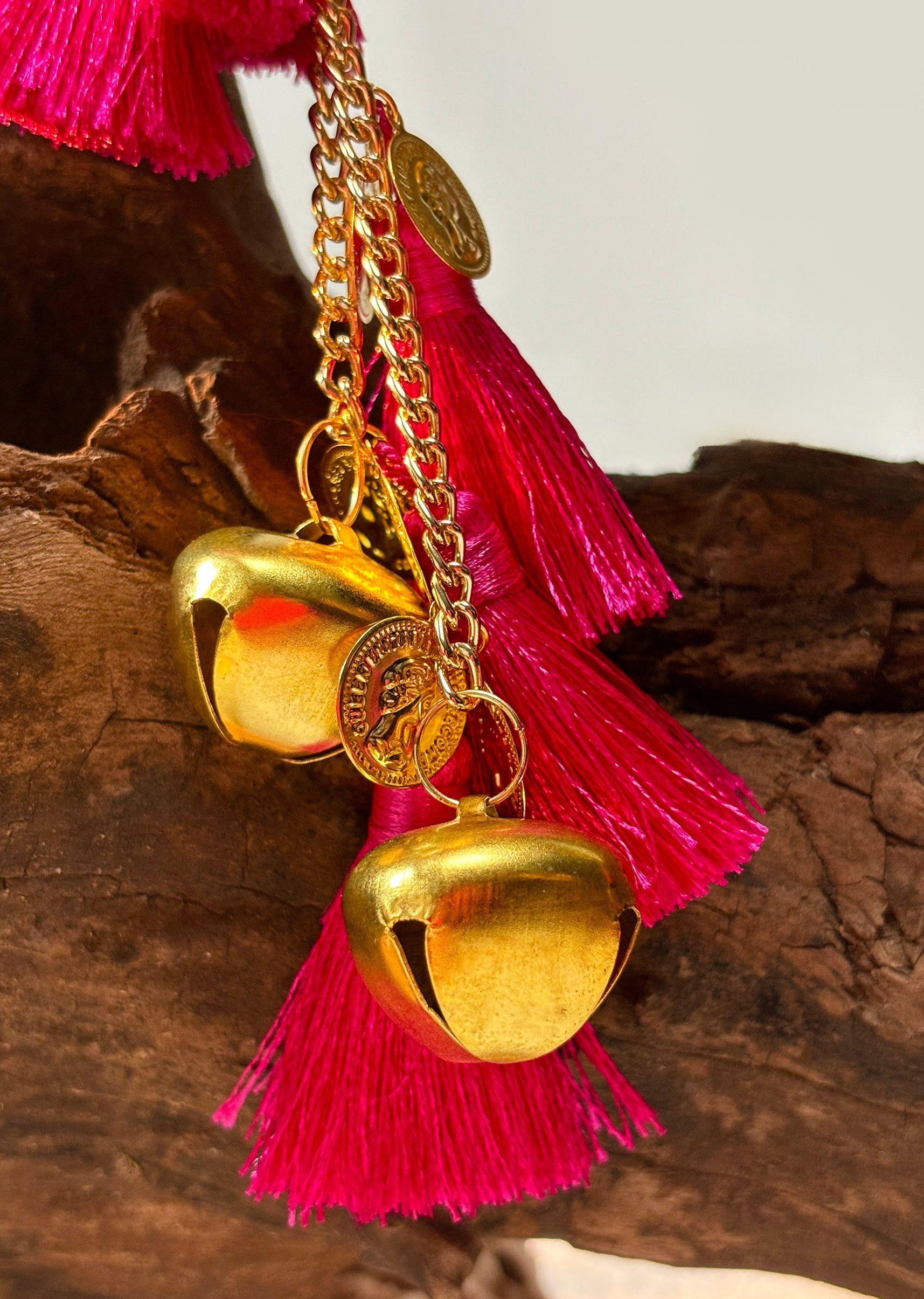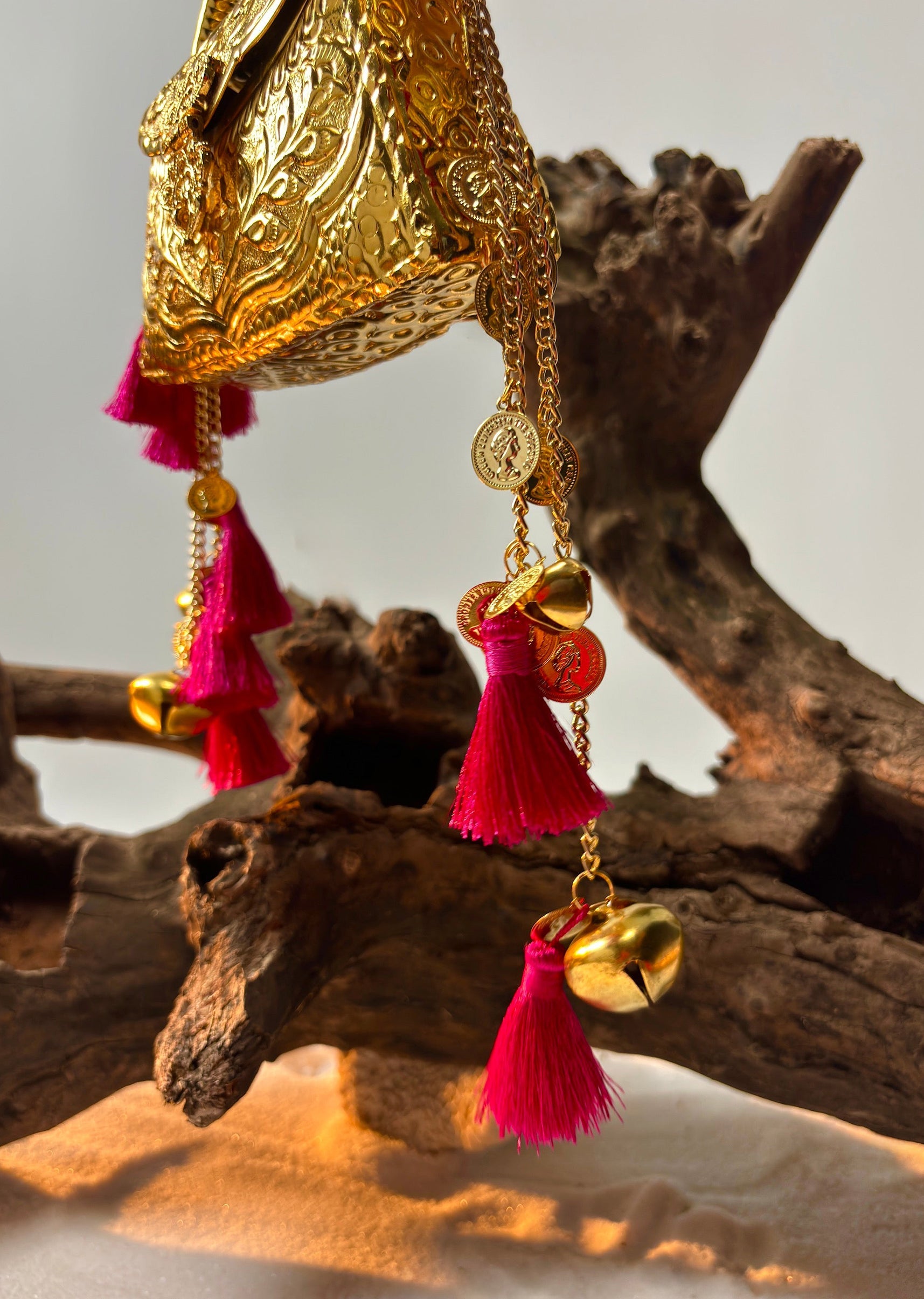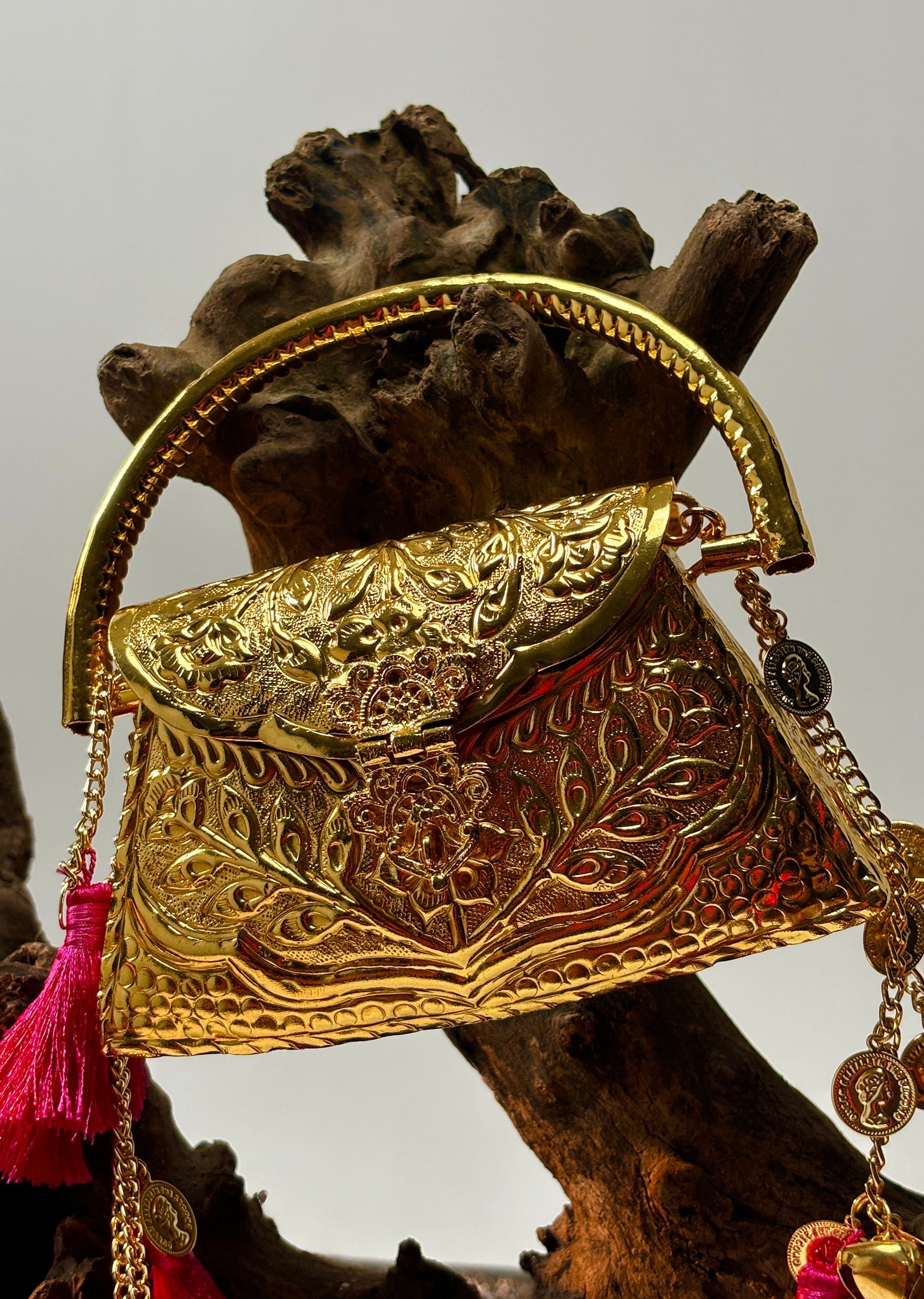 This gold-toned handbag showcases intricate traditional embossing, a sturdy curved metal handle and cascading tassel-and-bell embellishments—crafted to make a bold festive statement. Awarded as the Most Trusted Brand, we're delivering styles you love, just as promised.