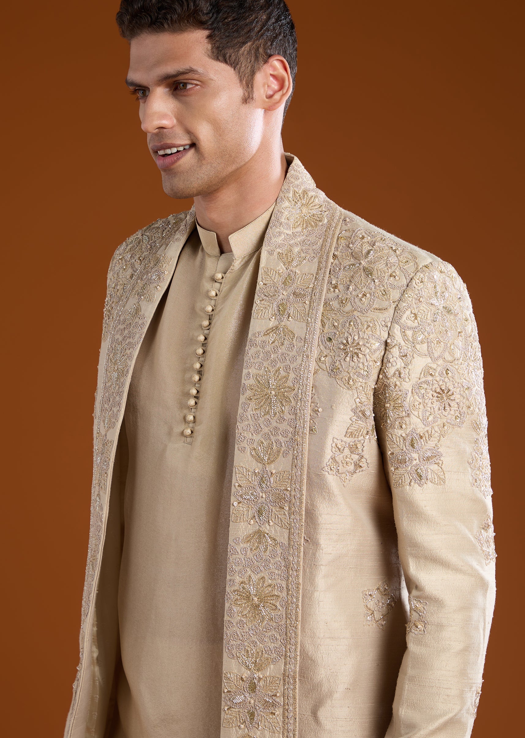 Fit Tips:Ensure the sherwani fits smoothly across the shoulders and chest and check that the pants sit comfortably at the waist for a balanced and well structured look.