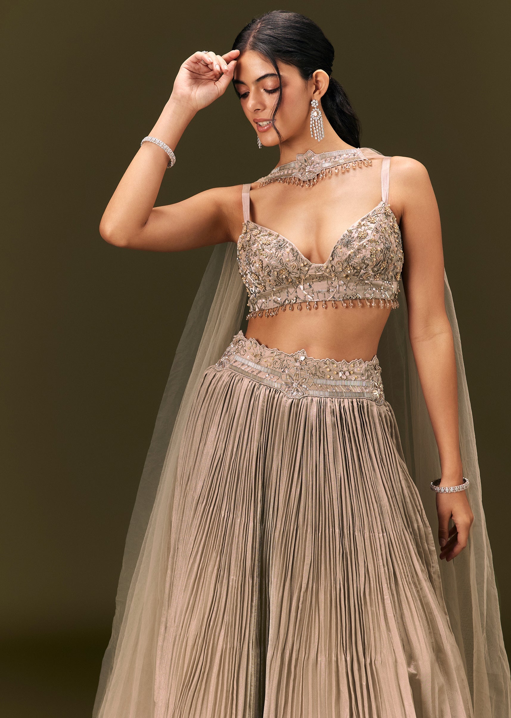 Gold Embroidered Sweetheart Neck Blouse With Lehenga And Choker Dupatta