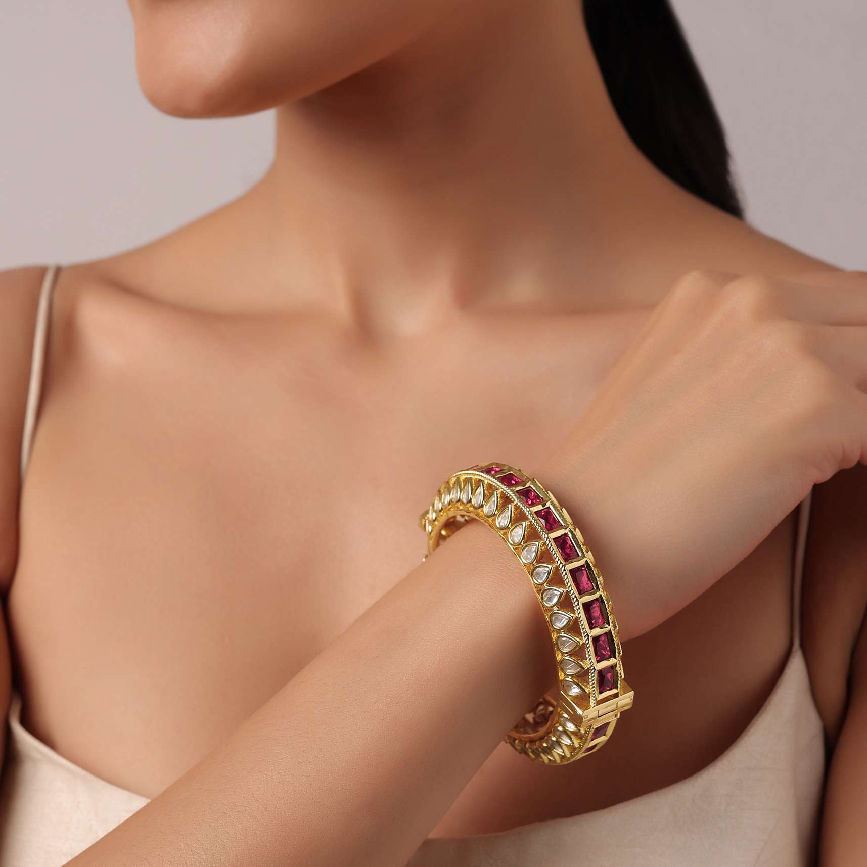 Adding a stylish flair to your ethnic outfits is this stunning kada bangle. Adorned with red Meenakari work it is set is glistening gold finish. Cut from high quality mix... More Product Details