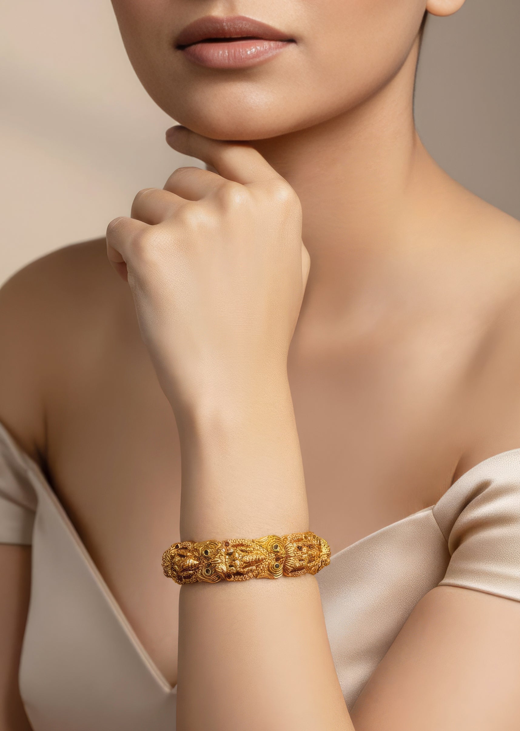 A striking bangle in a radiant gold finish featuring finely detailed temple motifs highlighted with green and pink simulated stones. The colourful accents create a lively and festive appeal, perfect for adding a touch of elegance to wedding or celebratory ensembles.