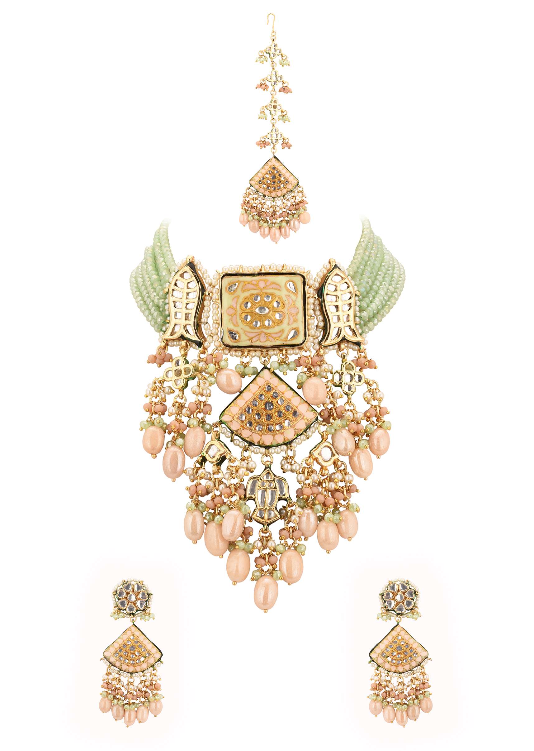 Introducing our bridal choker necklace, earring, and maang teeka set, a stunning and elegant piece of jewelry perfect for a bride on her special day. Crafted from mixed metal and coated with a gold finish, this choker necklace set features intricate kundan work, colorful meenakari work, and delicate beadwork that is arranged to create a mesmerizing design. EVENT - Perfect accessory for a traditional Indian bridal look.Avoid contact with water, chemicals, harsh liquids, perfumes, etc.Do not wear this piece of jewelry while showering, gymming, swimming, etc.Hard contact must be avoided completely.Please keep the product away from moisture and humidity when not in use.Baroque pearls and Natural stones can range from minor aberrations to distinctly ovoid, curved, pinched, or lumpy shapes.Slight variations in design may vary. Awarded as the Most Trusted Brand, we're delivering styles you love, just as promised.