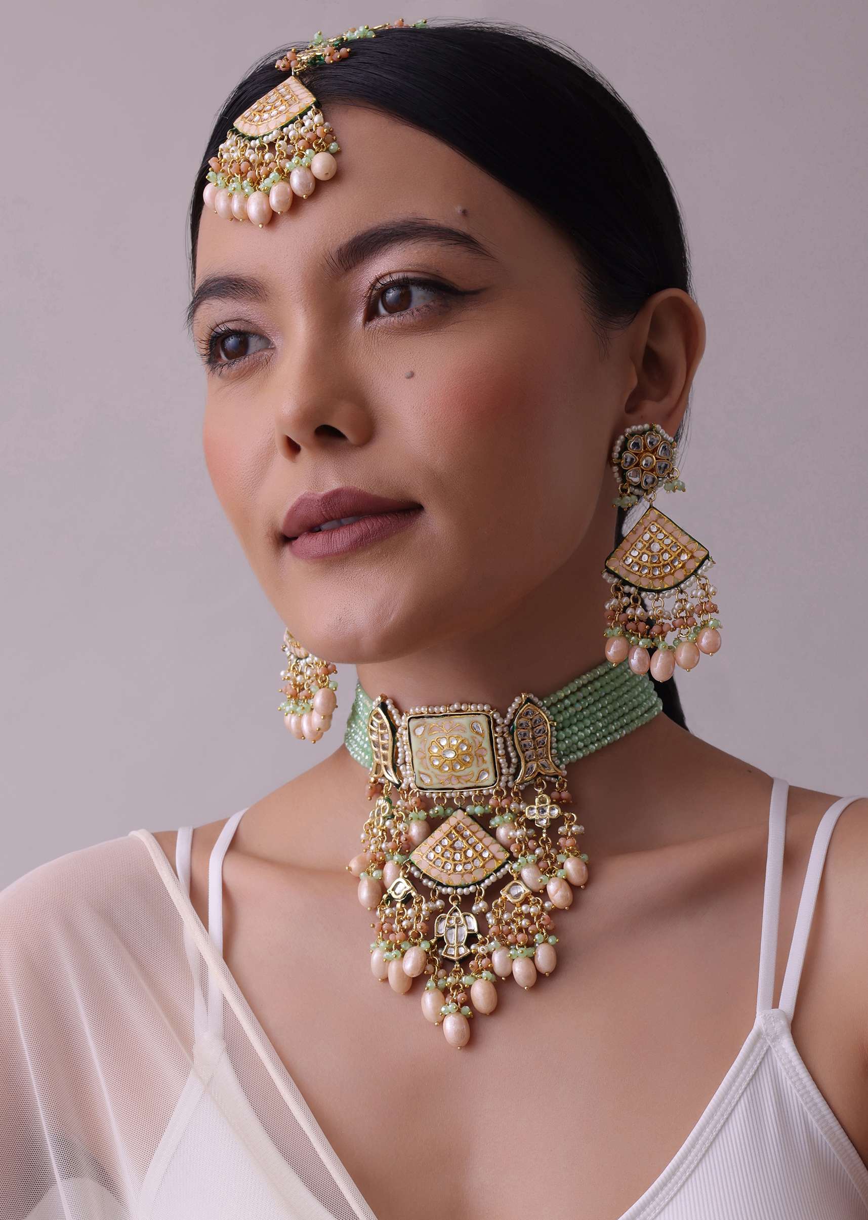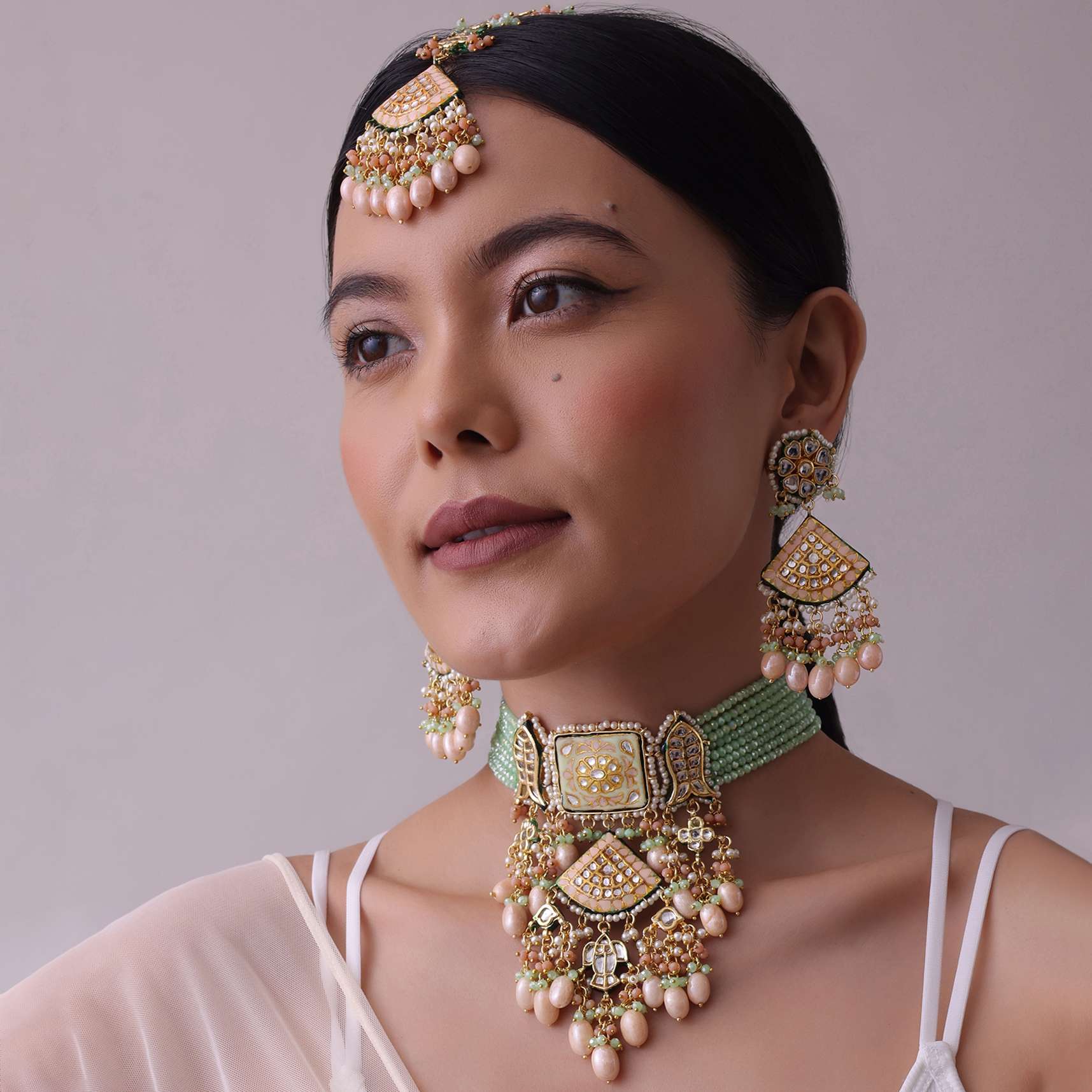 Pair this set with a simple saree or lehenga in a complementary color to make the green tone and intricate detailing pop.