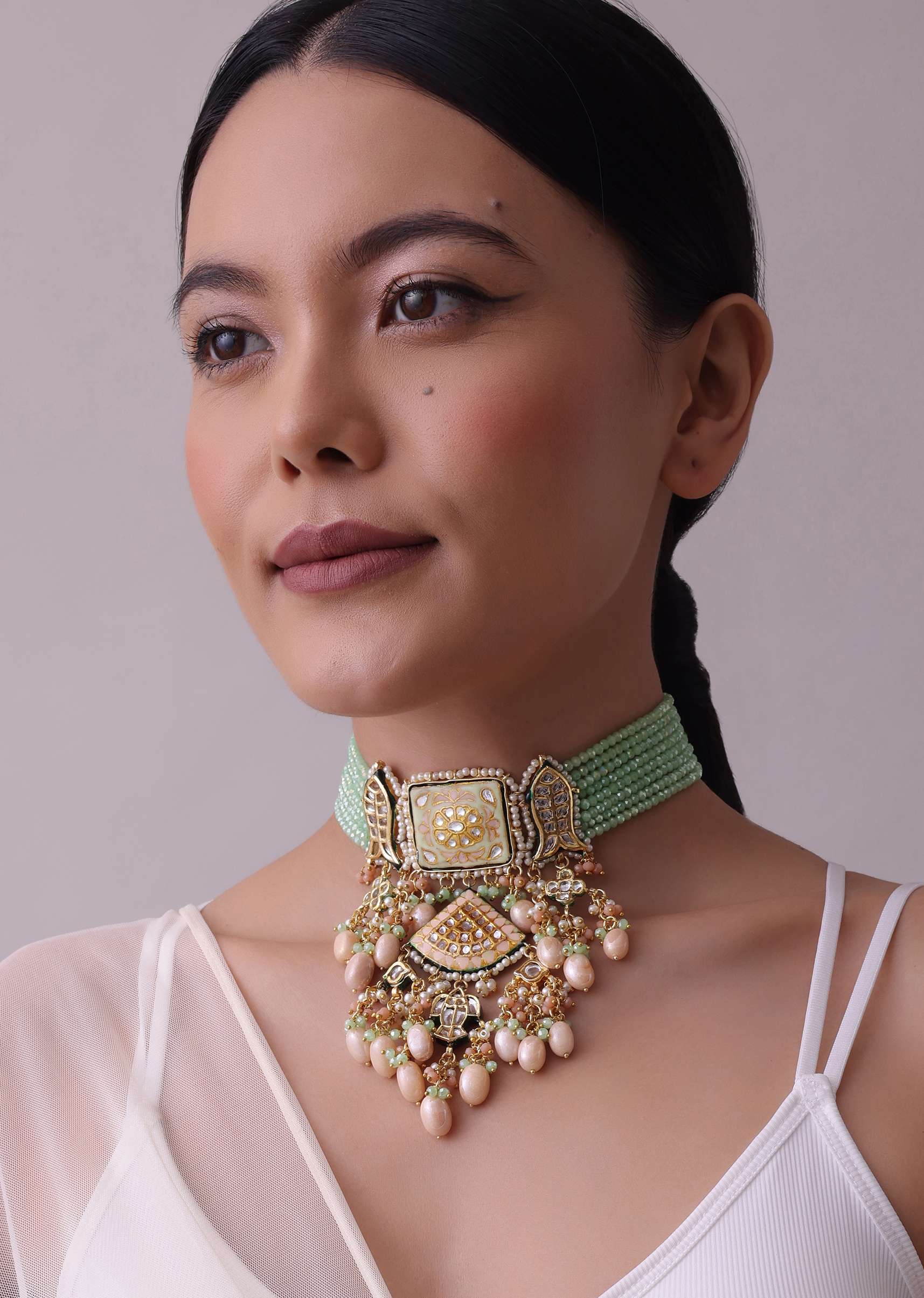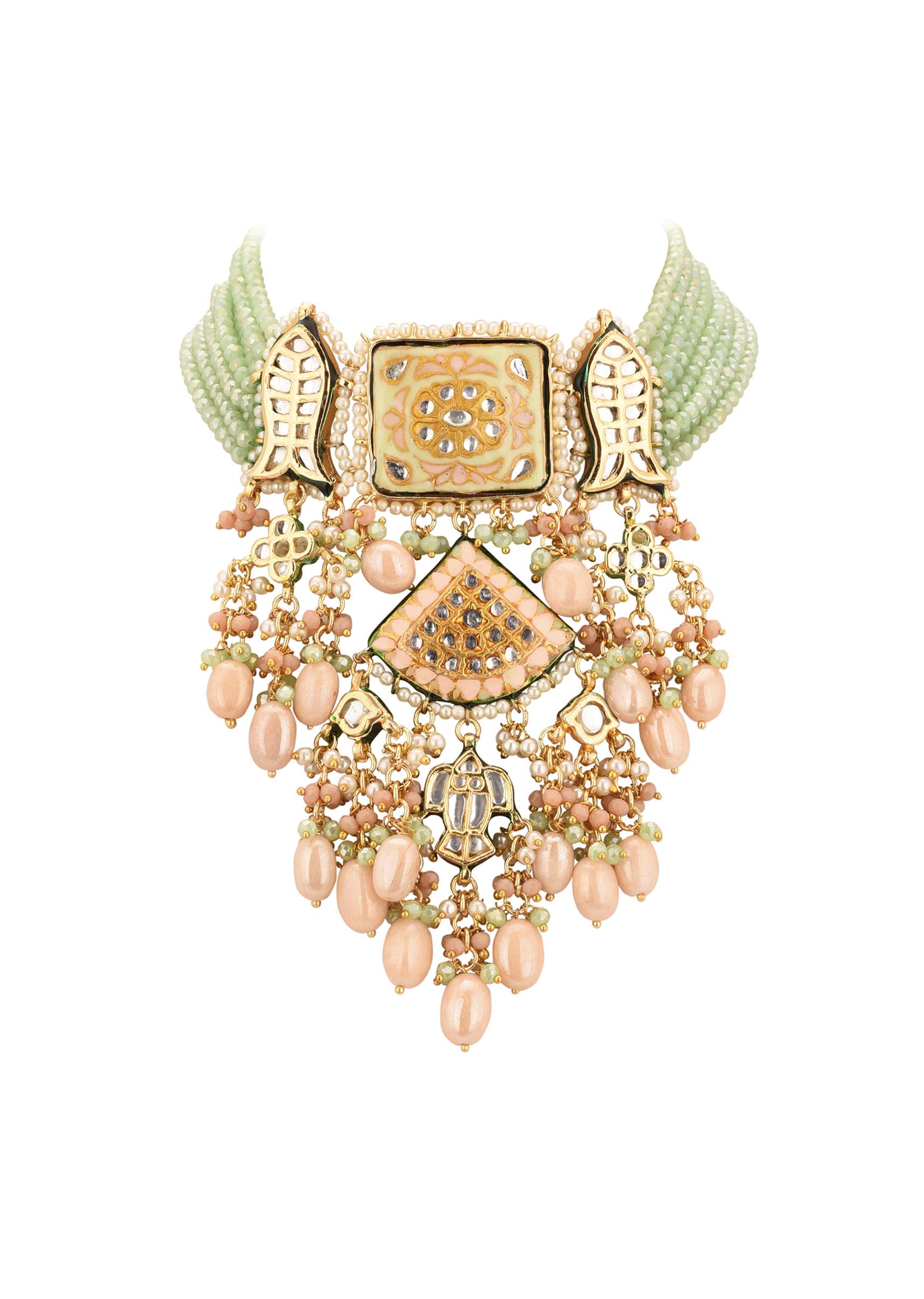 Gold-Finish Bridal Kundan Chokar Necklace Set With Beads And Multicolor Meenakari In Mix Metal