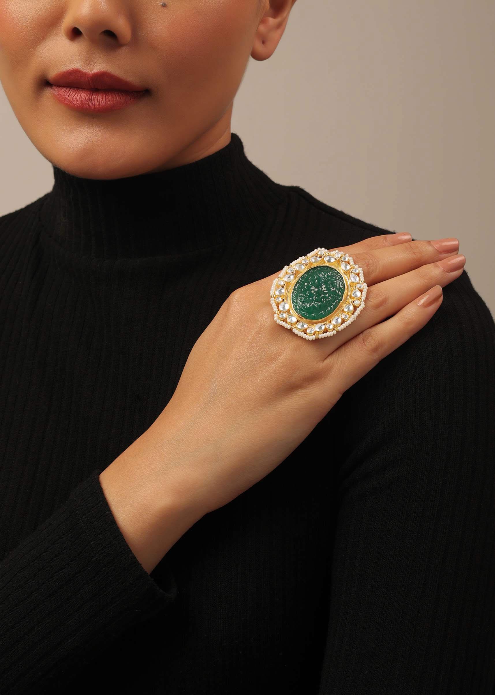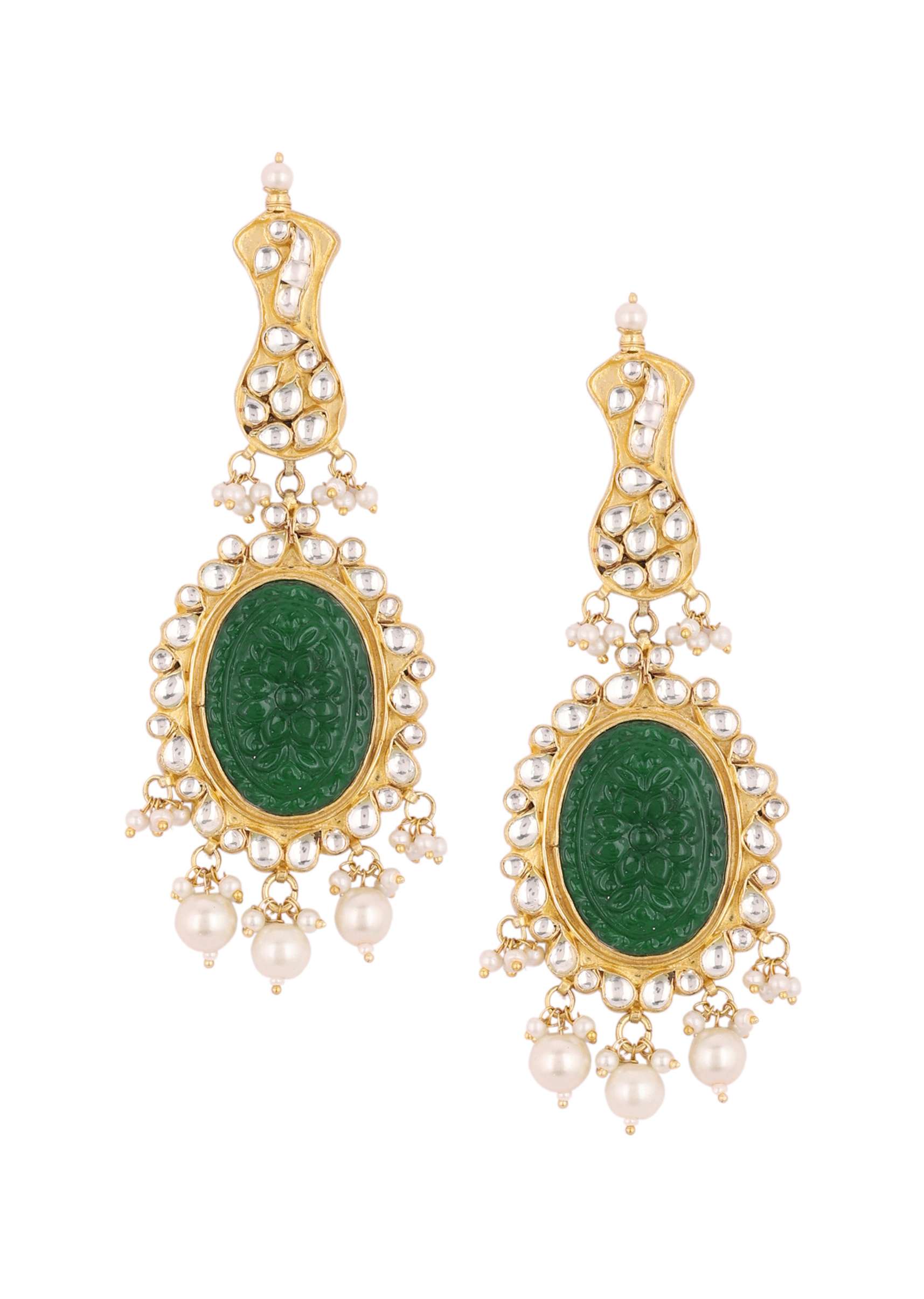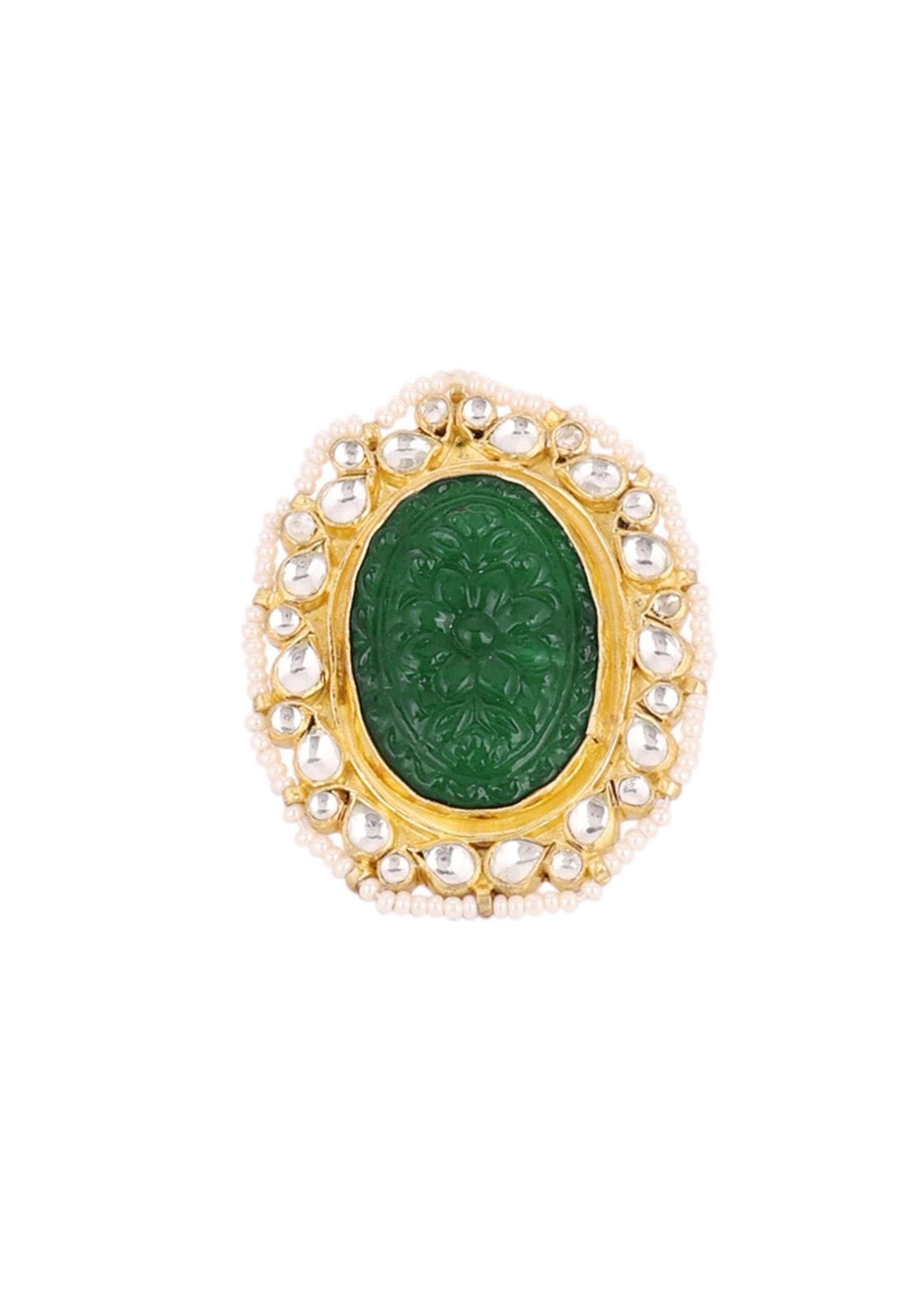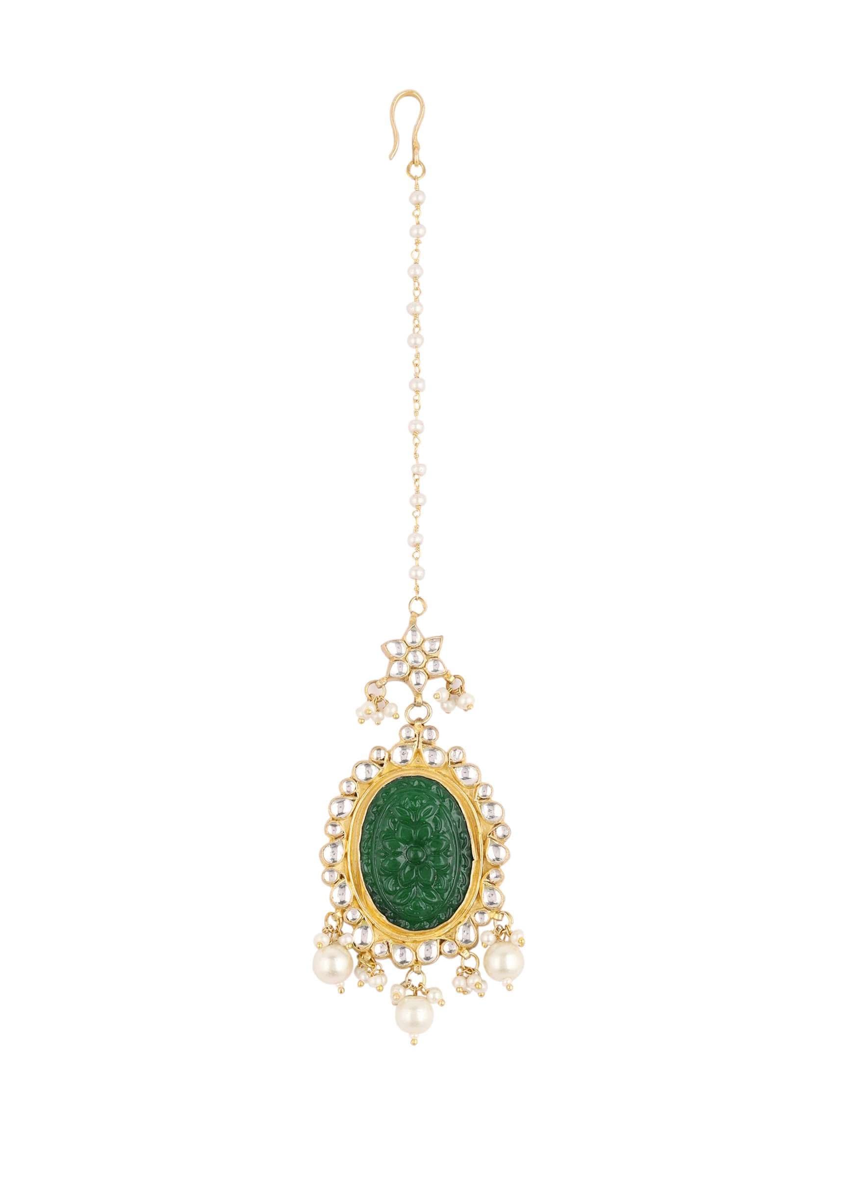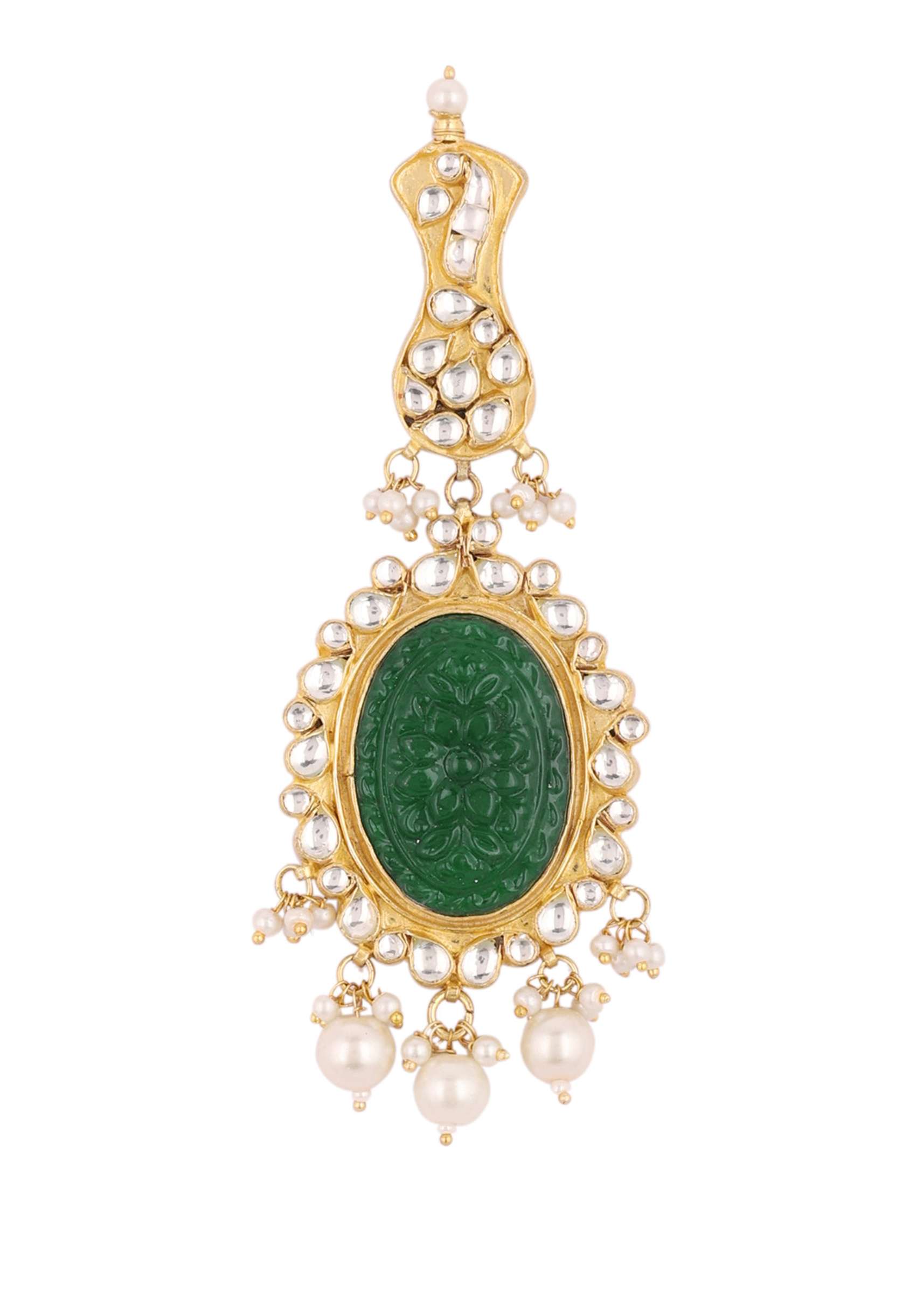 Introducing a one of a kind carved emerald kundan polki choker set in a gold finish, the perfect accessory for any bride to be. This stunning choker set features a beautiful floral design that is intricately carved to perfection.The choker is made with high-quality emerald kundan polki stones that are carefully set in a gold finish for a regal and timeless look. The matching earrings and mang tikka complement the choker perfectly, making it a complete set that is sure to turn heads. The jewelry set is polished and anti-tarnish.Avoid contact with water, chemicals, harsh liquids, perfumes, etc.Do not wear this piece of jewelry while showering, gymming, swimming, etc.Hard contact must be avoided completely.Please keep the product away from moisture and humidity when not in use.Baroque pearls and Natural stones can range from minor aberrations to distinctly ovoid, curved, pinched, or lumpy shapes.Slight variations in design may vary. Awarded as the Most Trusted Brand, we're delivering styles you love, just as promised.
