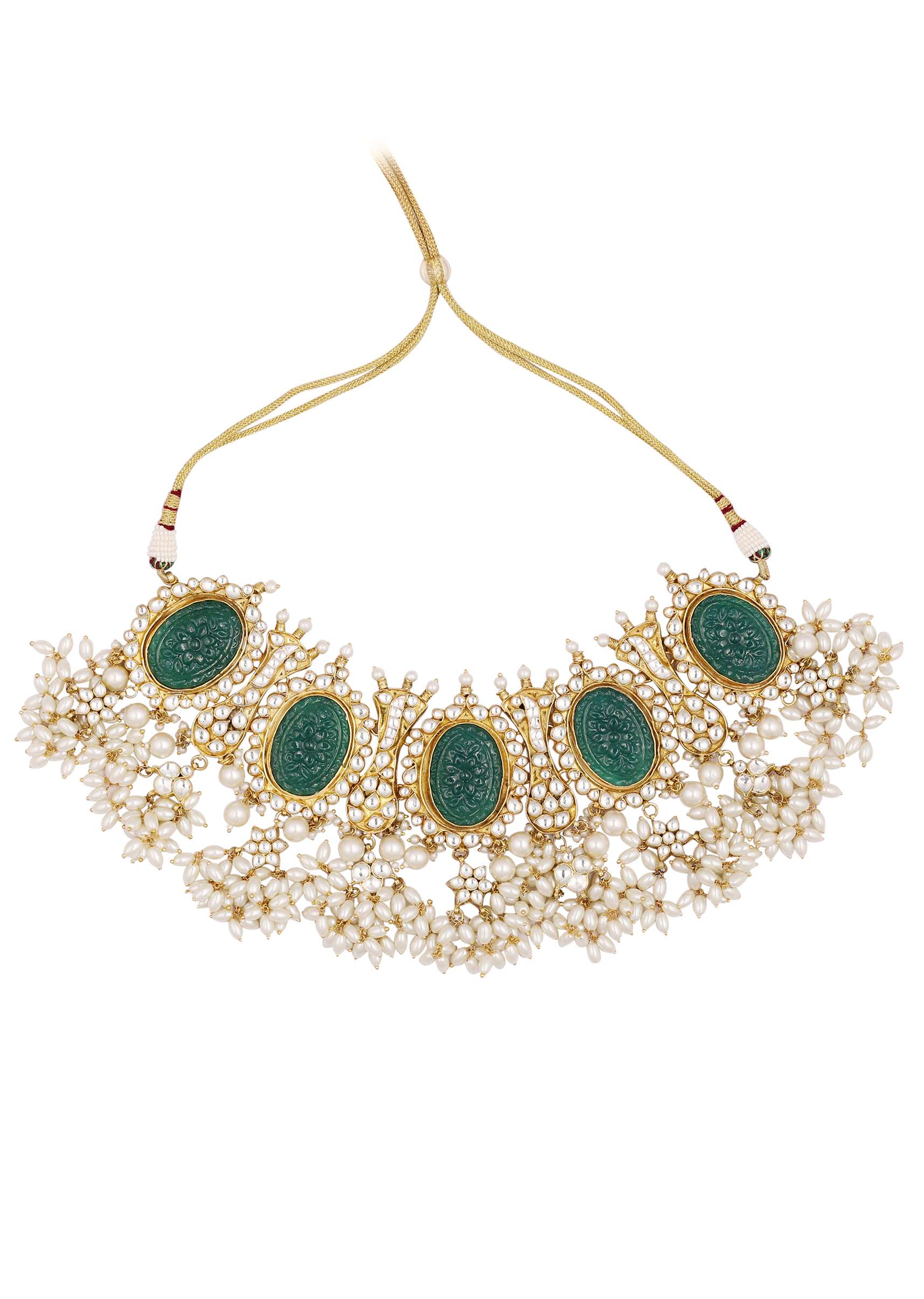 Gold Finish Carved Emerald Green Kundan Polki Bridal Choker Set