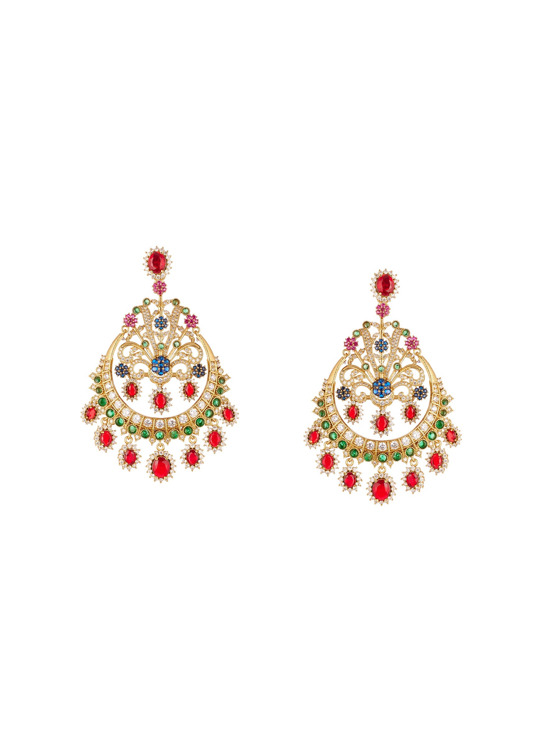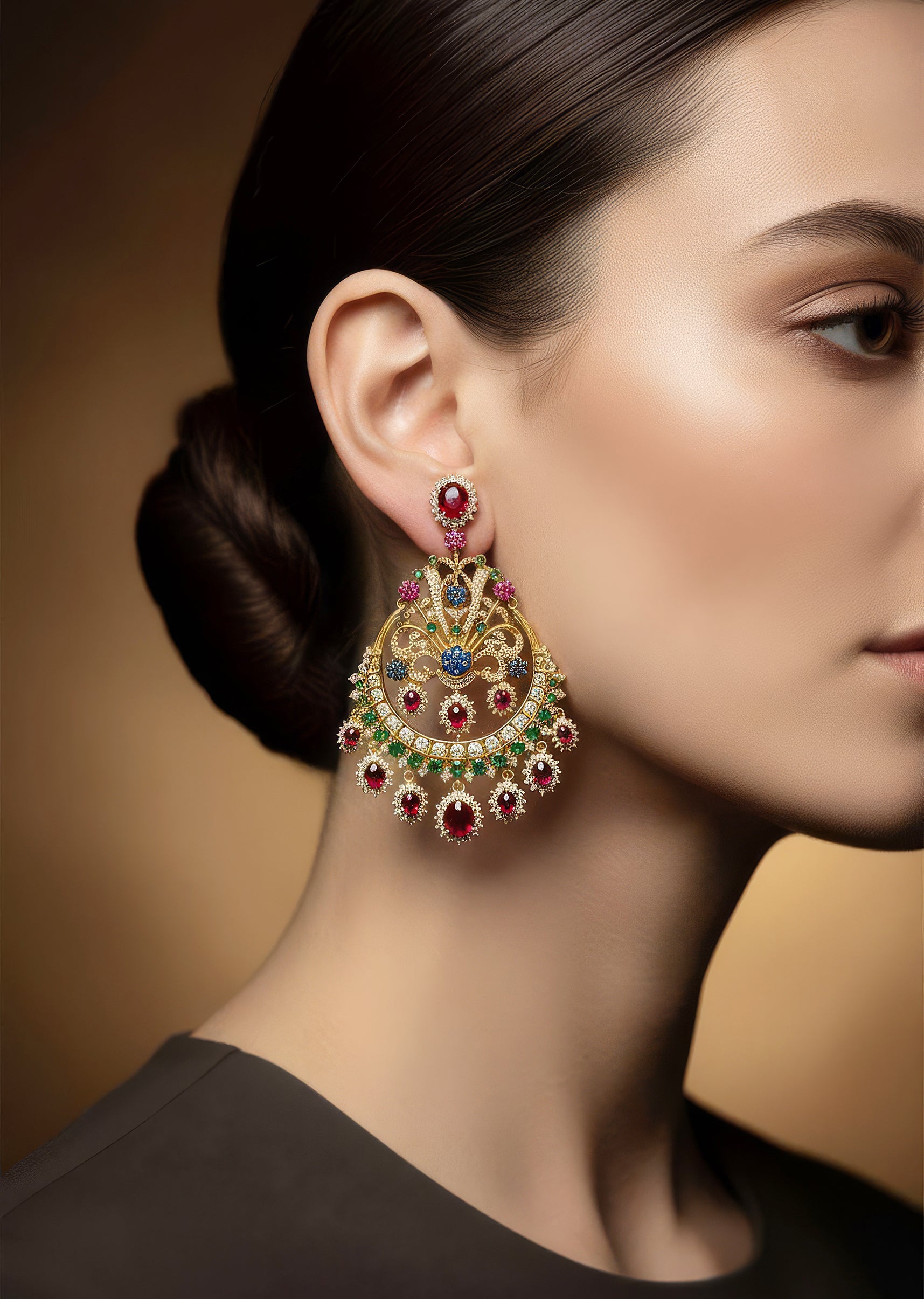 A stunning pair of traditional chandbali earrings crafted in a radiant gold finish featuring intricate pendant motifs accented with red, blue, and green simulated stones. The vibrant colour combination adds a festive and elegant touch, perfect for weddings, haldi, mehendi, and celebratory occasions.