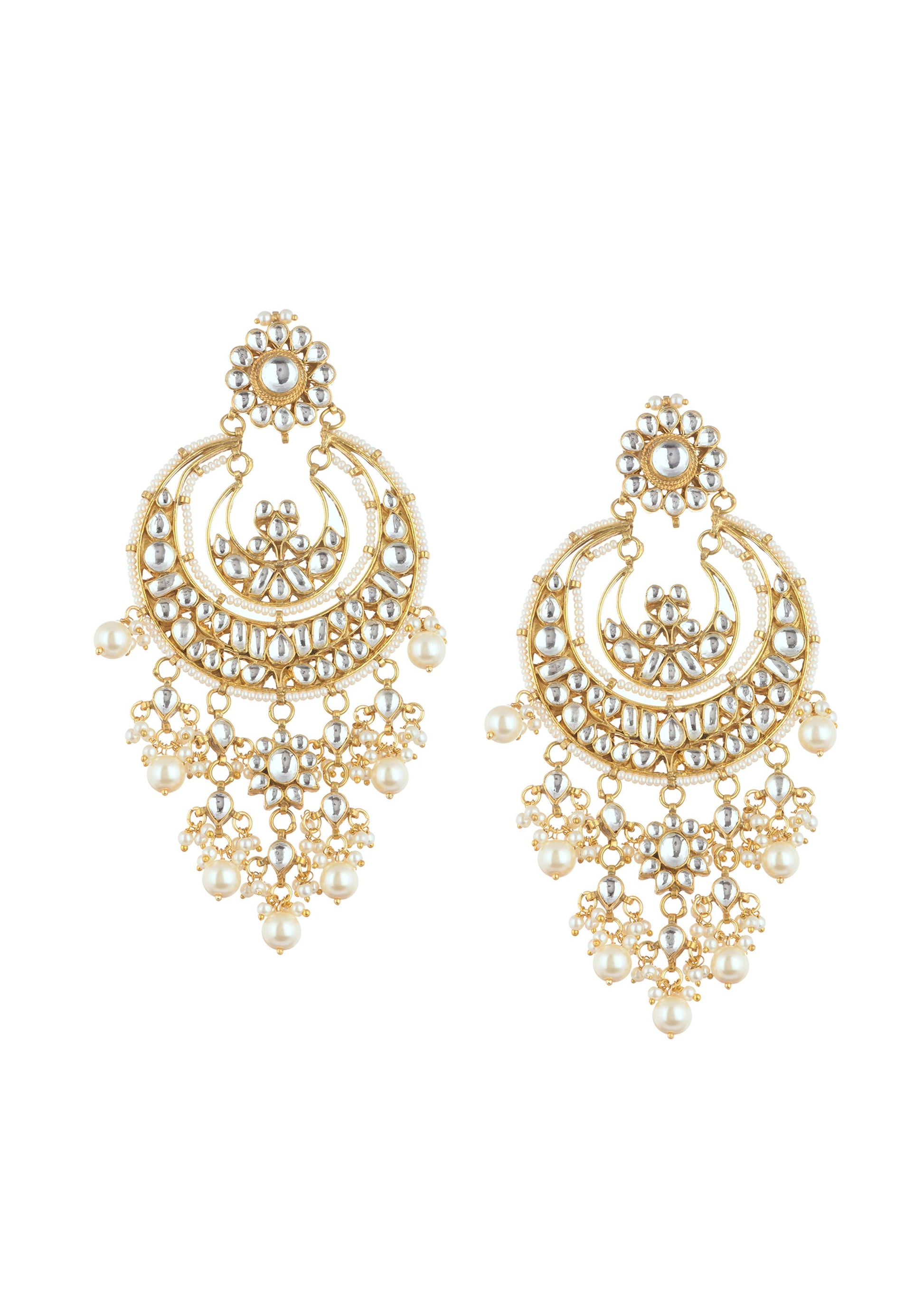 Step into a world of grandeur with our gold finish chandbalis in mix metal.These captivating chandbalis are adorned with intricate white kundan work accentuating their regal charm. The addition of lustrous pearls further enhances their allure making these earrings a cherished piece of jewelry.EVENT - Perfect for weddings formal events and festive celebrations.Store in a dust bag. Keep away from moisture perfume alcohol and harsh chemicals. Spot clean only. Keep away from sharp objects. Actual color may slightly vary due to photographic lighting sources and device screen settings. Awarded as the Most Trusted Brand, we're delivering styles you love, just as promised.