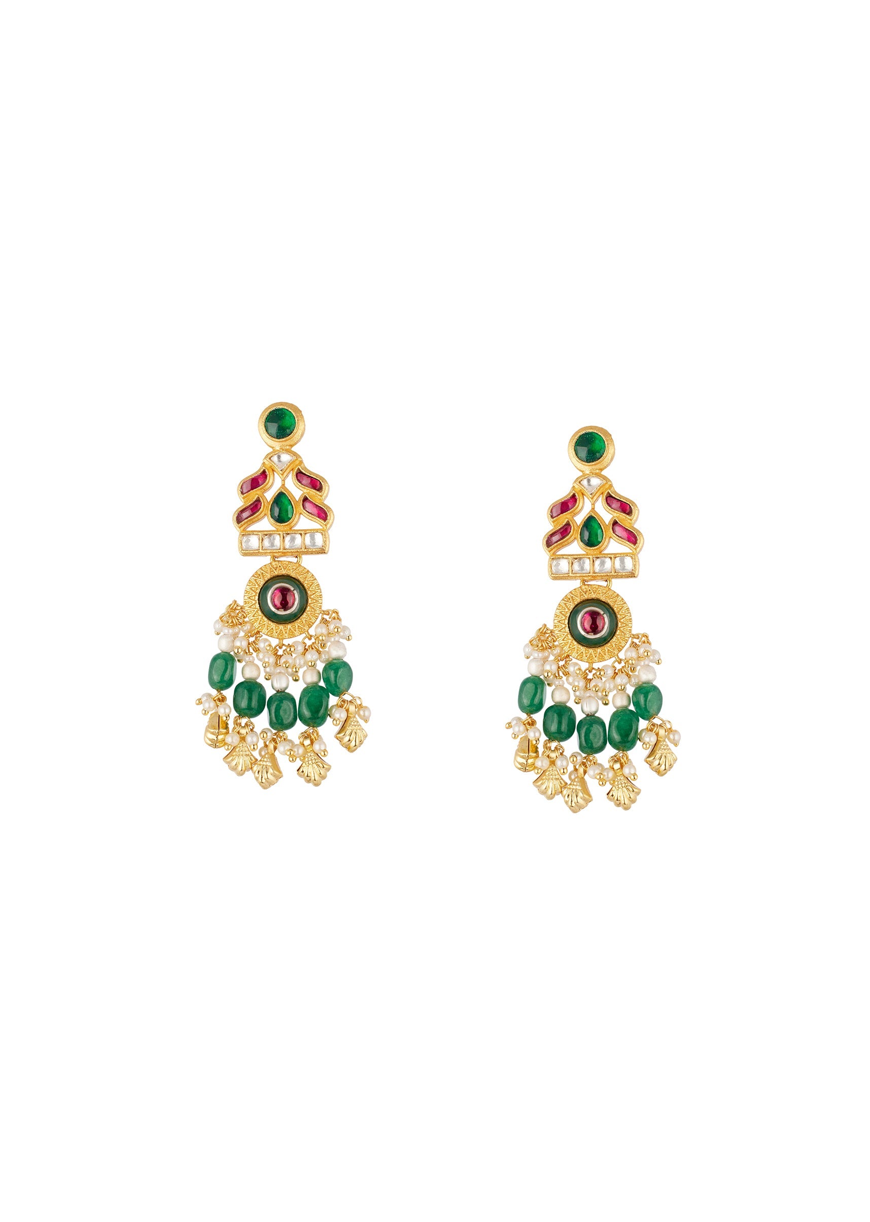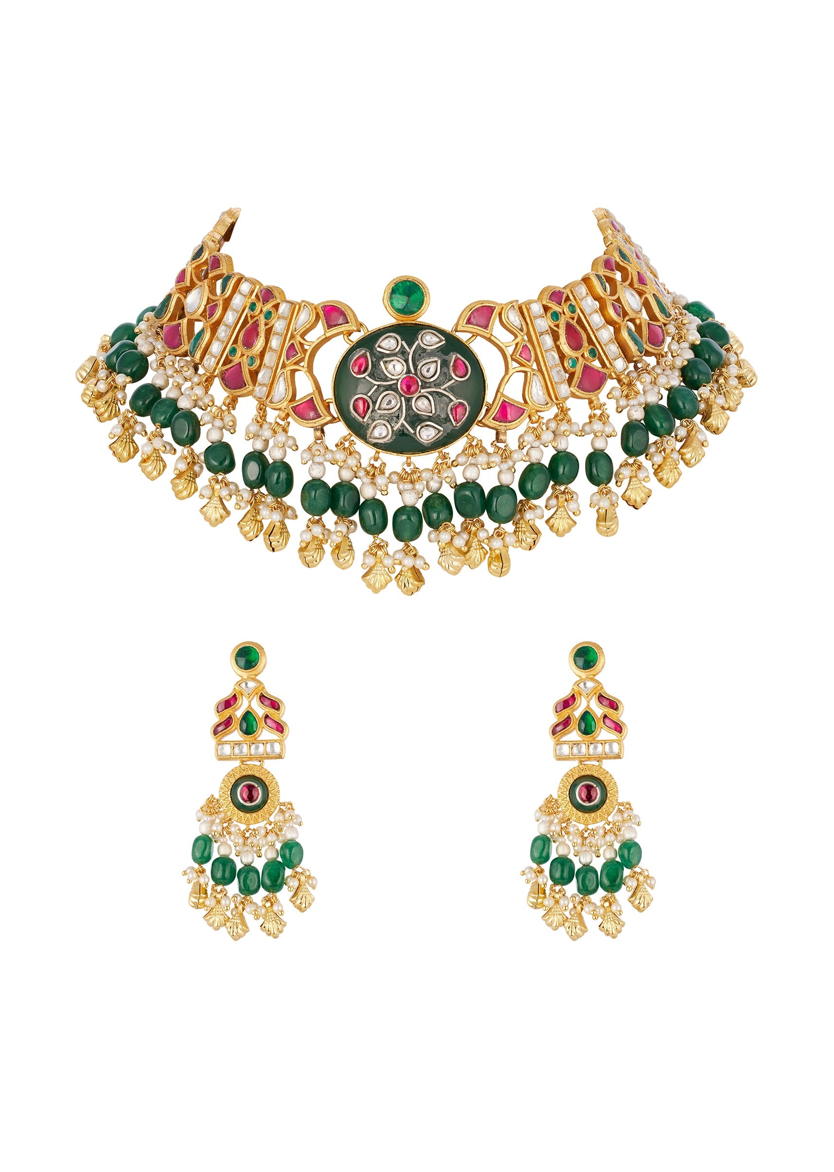 This traditional gold finish choker necklace set is crafted in mix metal and features a kundan style design with intricate filigree detailing. Accented with red green and white simulated stones and highlighted by a green enamel centerpiece, the necklace is finished with an emerald style bead fringe that adds richness and movement, making it a striking choice for wedding and festive occasions.