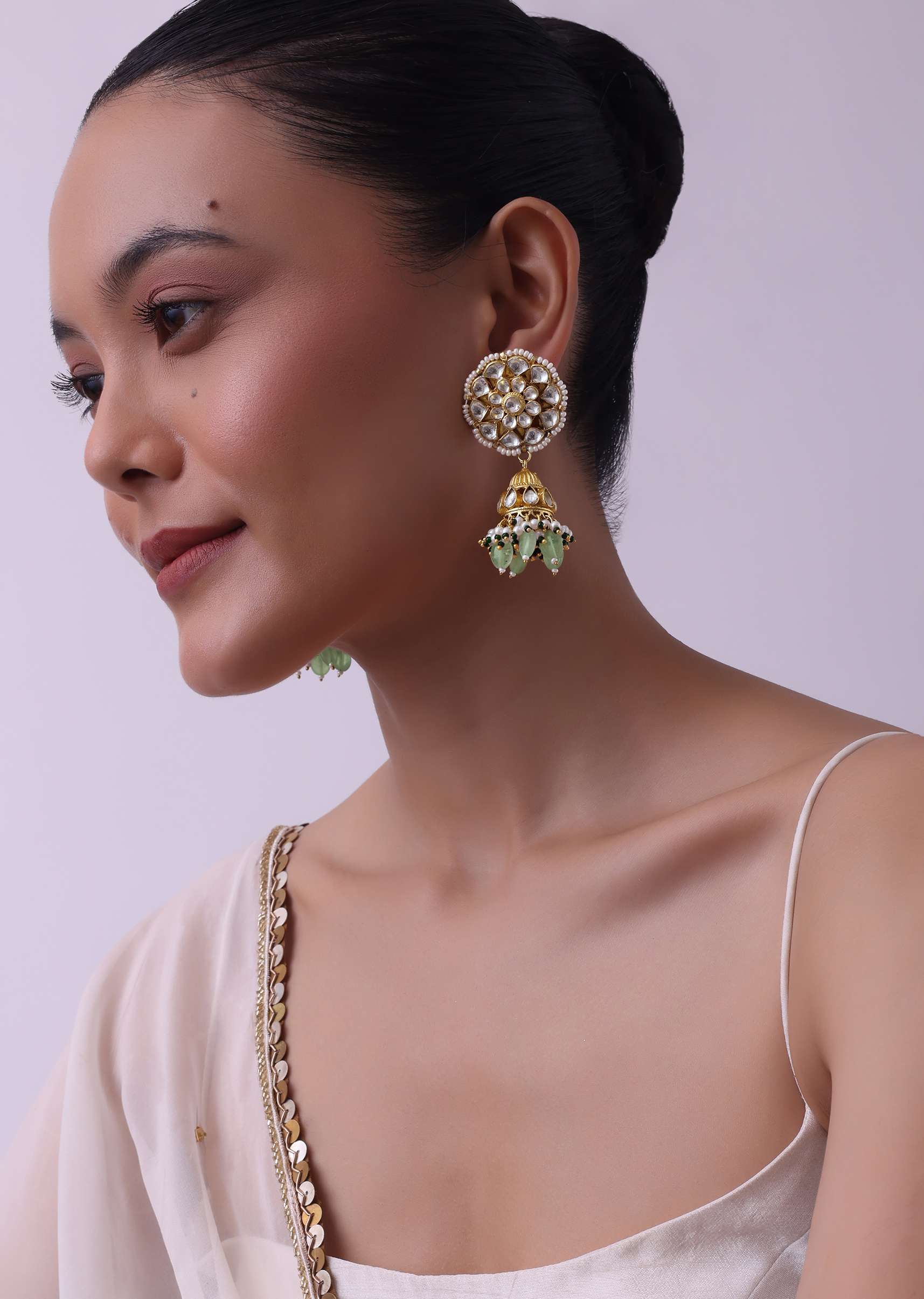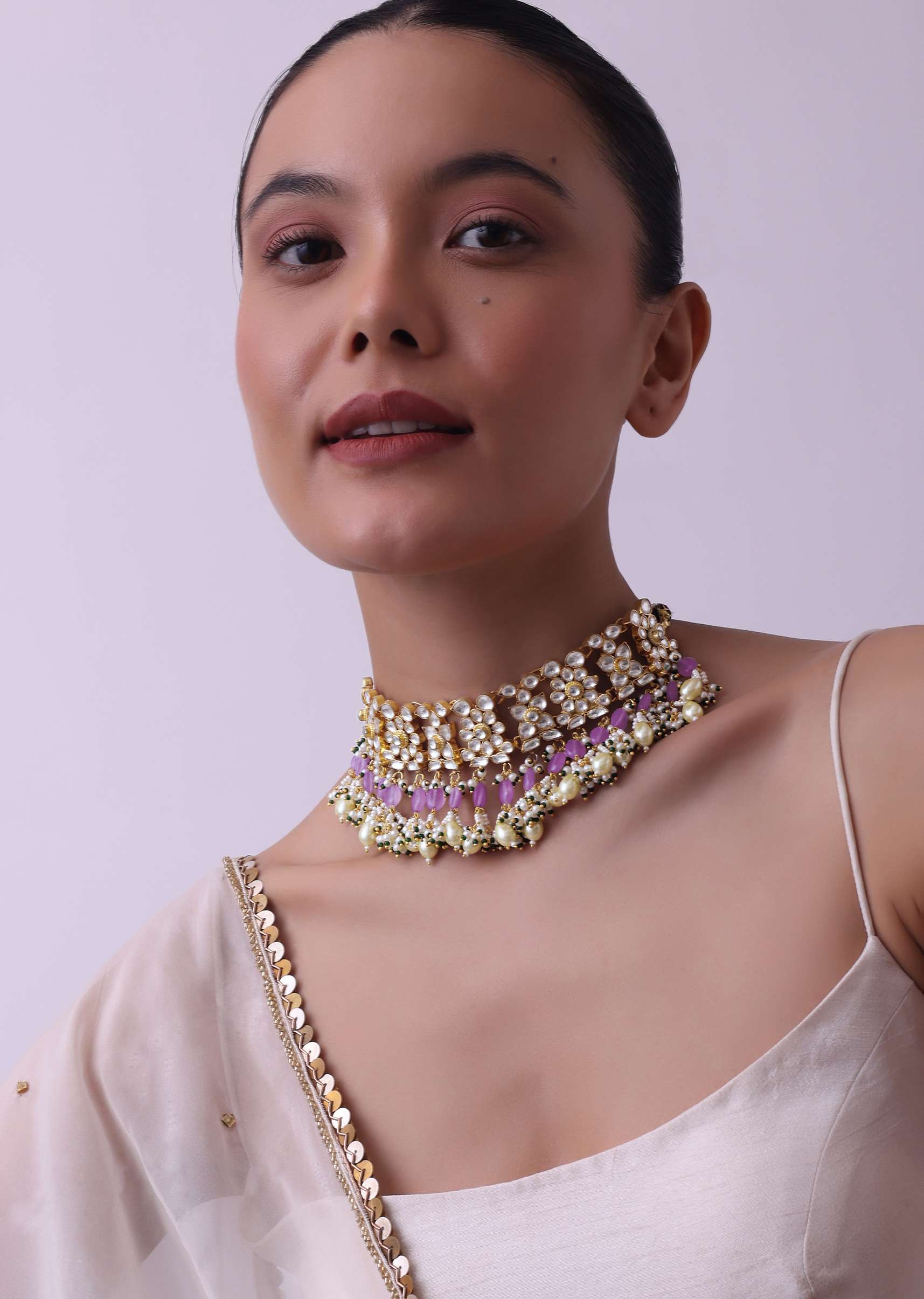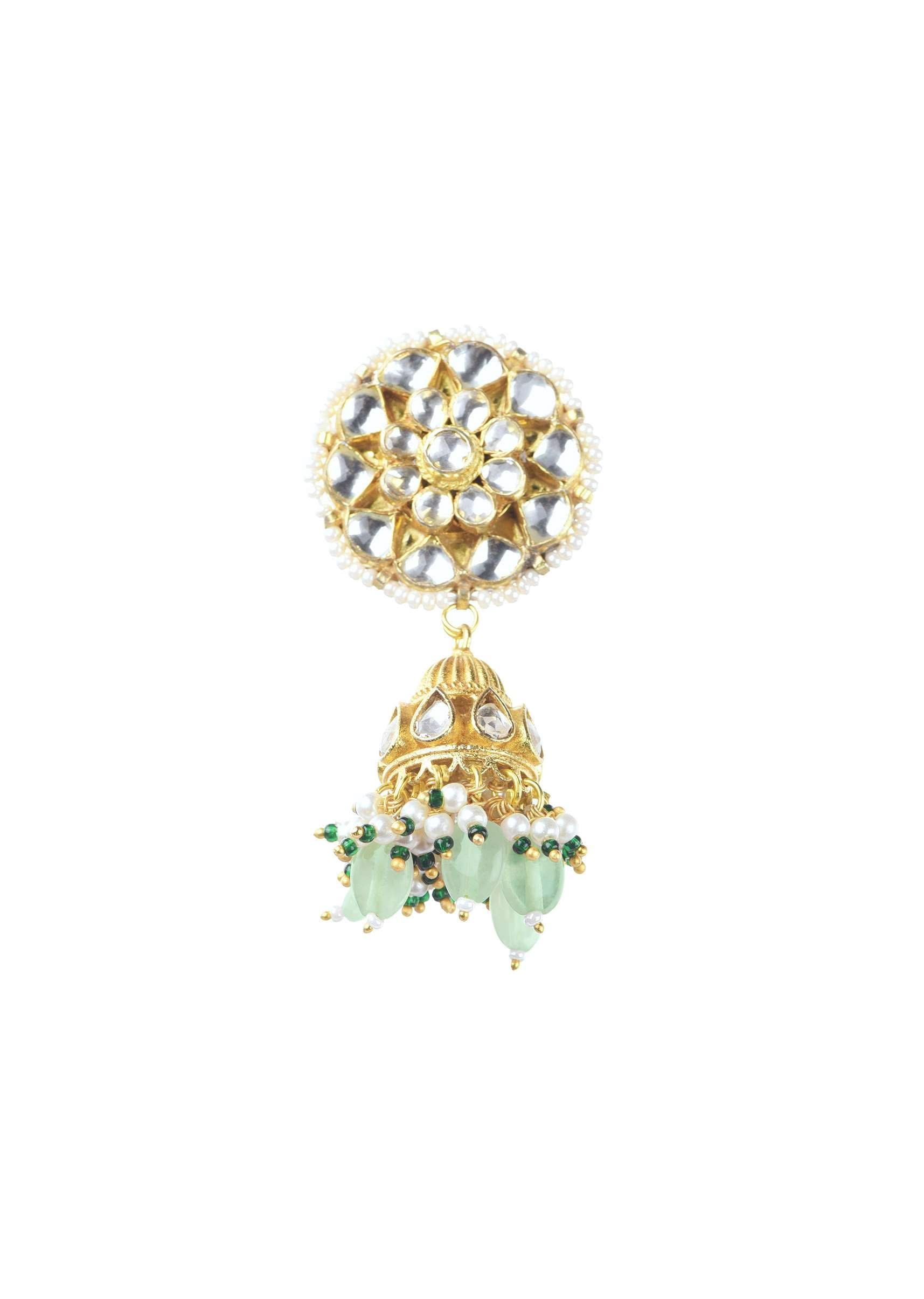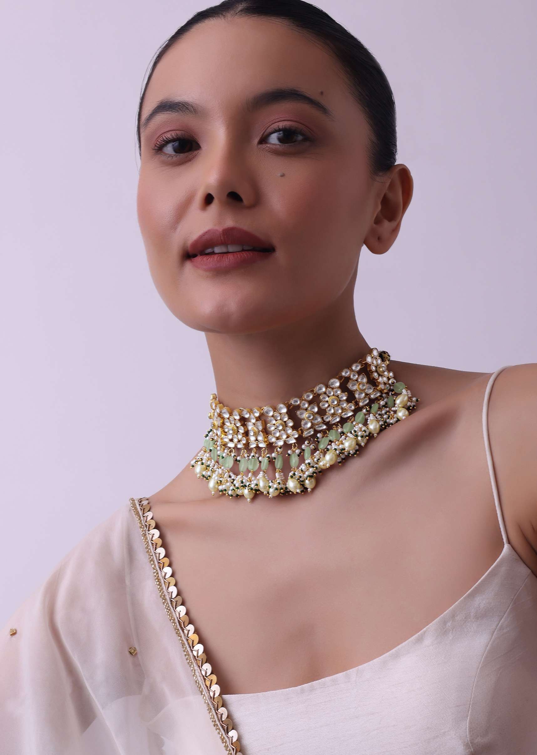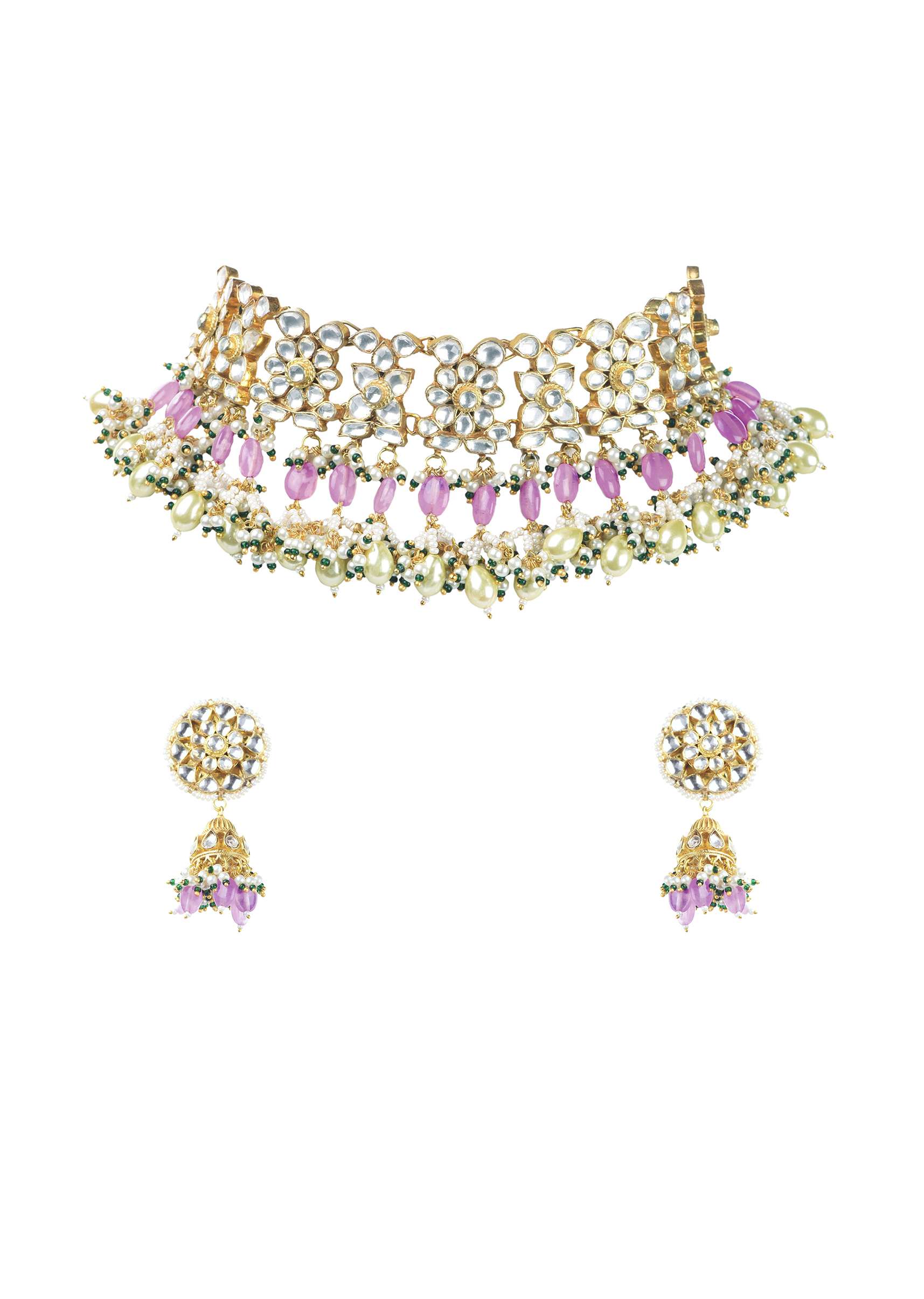 Introducing our grand gold finish choker adorned with pearls and green beads, accompanied by a pair of matching earrings. This exquisite kundan choker set combines traditional craftsmanship with contemporary design, creating a timeless accessory that exudes grace. EVENT - Perfect for festive and formal events. Avoid contact with water, chemicals, harsh liquids, perfumes, etc. Do not wear this piece of jewelry while showering, gym, swimming, etc. Please keep the product away from moisture and humidity when not in use. Slight variations in design may vary. Being rewarded as the most trusted brand, our customers believe we deliver the same styles as promised on the website. Awarded As The Most Trusted Brand We'Re Delivering Styles You Love Just As Promised.