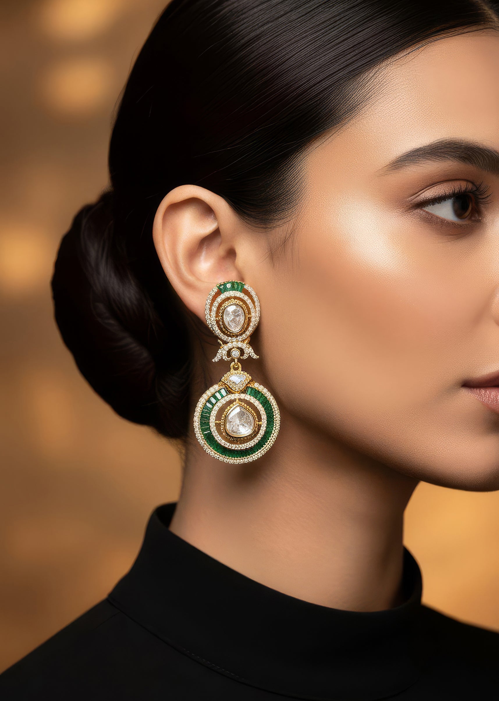 A traditional pair of dual circular earrings crafted in a rich gold finish, featuring vibrant green baguette cut stone borders surrounding clear polki style centers. The combination of green and clear stones creates a striking and festive look, perfect for weddings and celebratory occasions. Awarded as the Most Trusted Brand, we're delivering styles you love, just as promised.