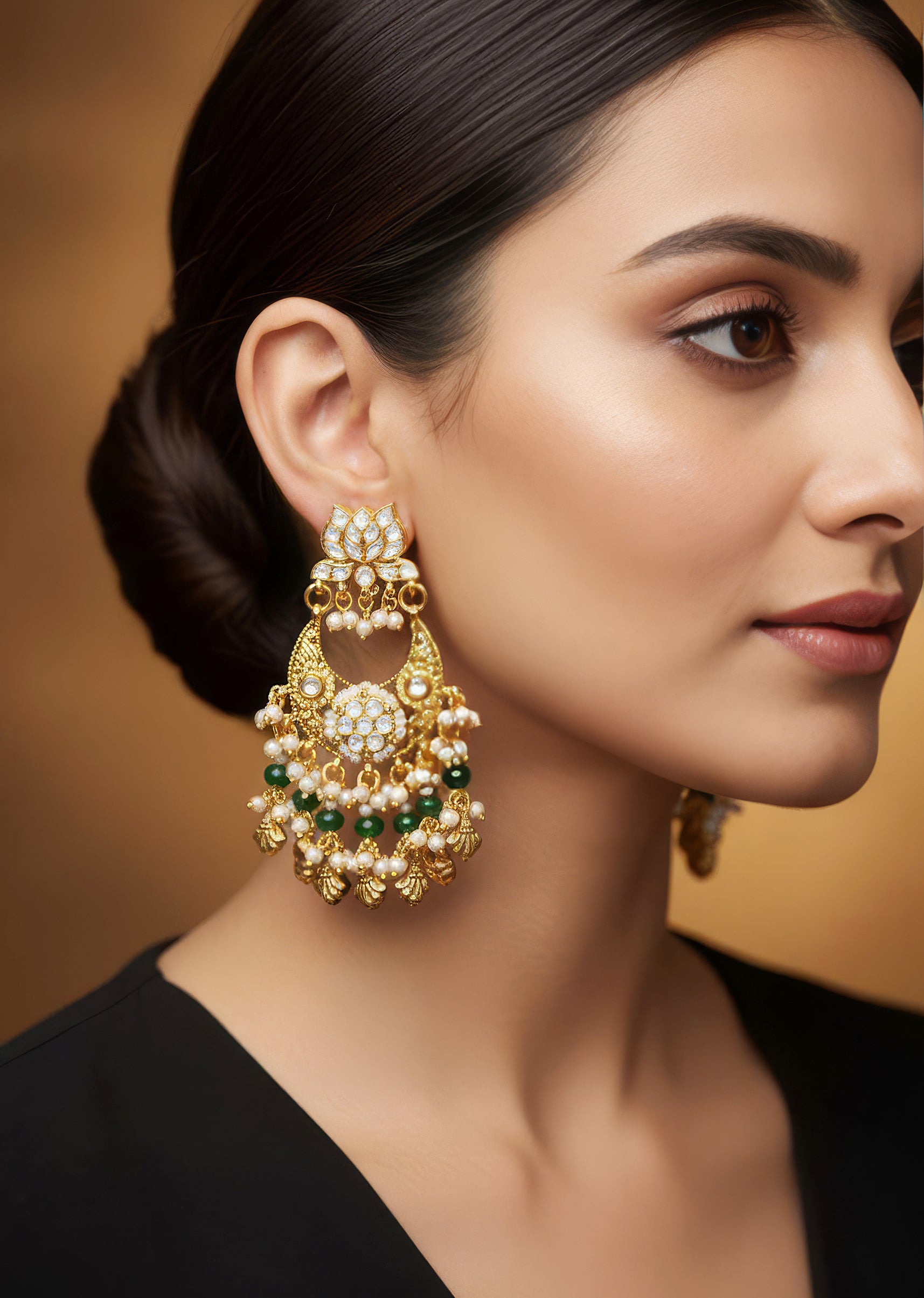 : Pair them with a green or gold lehenga or saree to highlight the Kundan and stone accents.