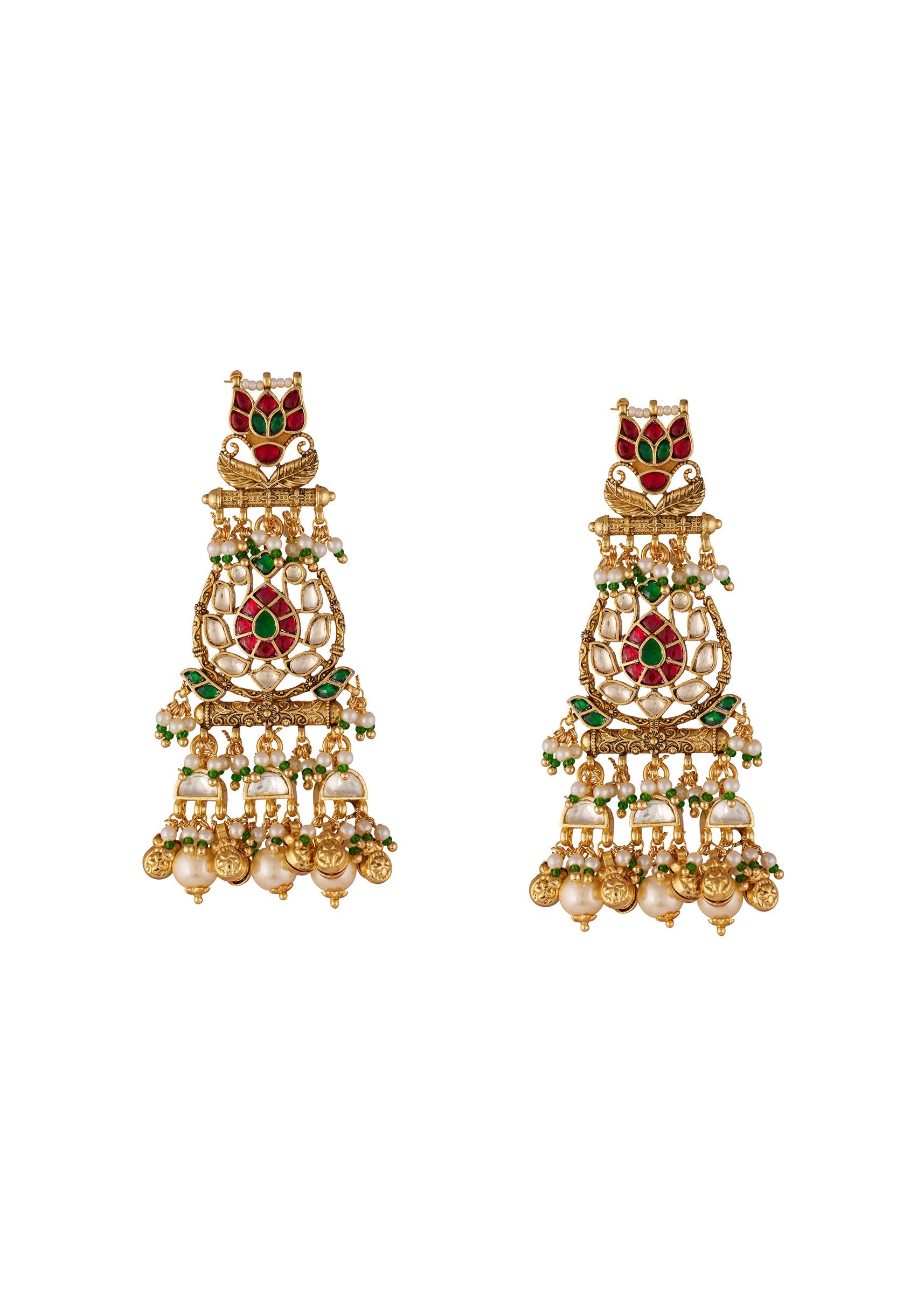 : Pair these earrings with a red or green lehenga or an embellished saree to enhance the multicolored stones and pearl accents.