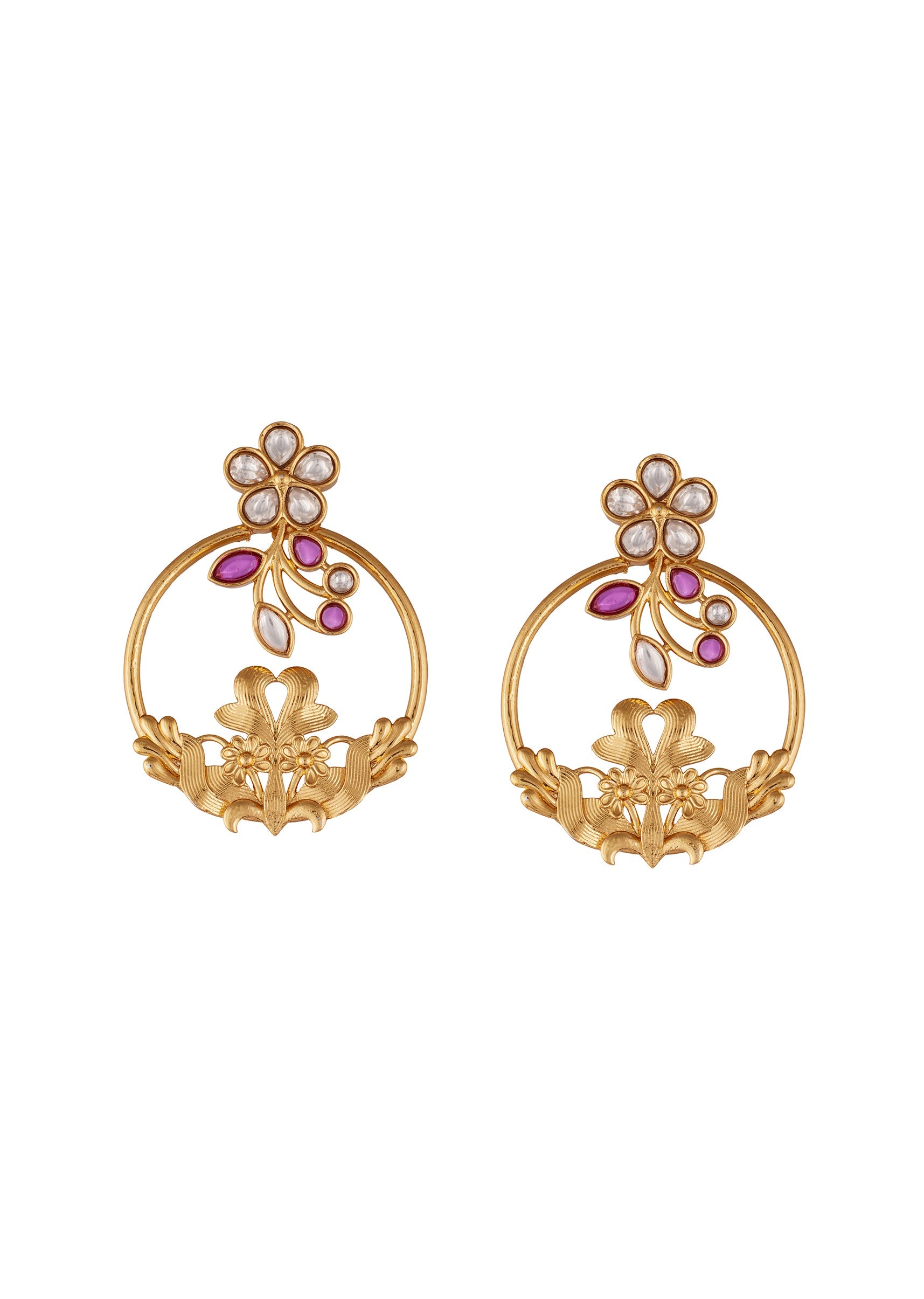 A gold finish hoop earring featuring a floral vine motif set with large white Kundan stones and faceted pink stones with intricate filigree work at the base. Handcrafted with precision, these earrings combine traditional artistry with vibrant gemstone accents for a striking festive and wedding ready look. Perfect for weddings, festive occasions, or celebration wear, they add a regal and elegant touch to any outfit. Awarded as the Most Trusted Brand, we're delivering styles you love, just as promised.