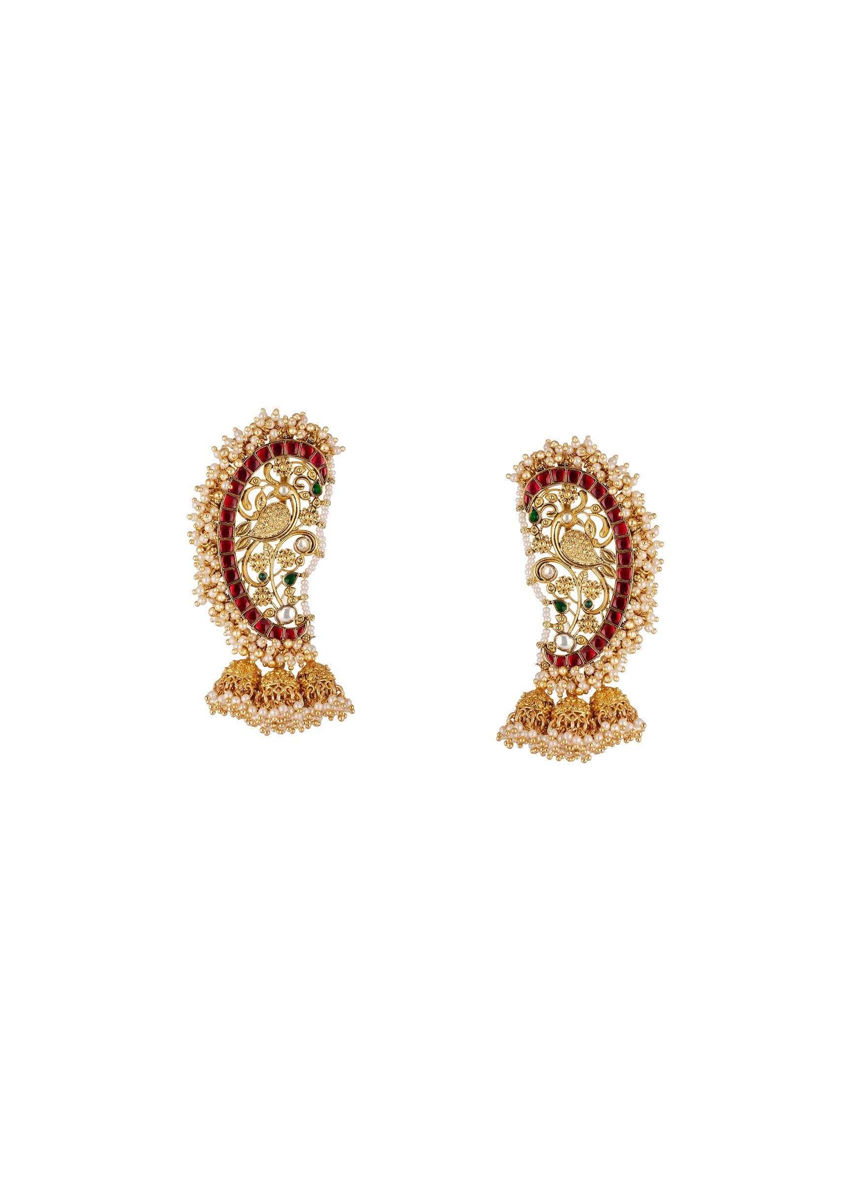 A traditional gold finish Kaanphool style earring featuring a filigree peacock motif, a border of red stones, multiple dangling jhumka bells, and intricate pearl beadwork. Handcrafted with precision, these earrings bring a regal and festive charm to any ensemble. Perfect for weddings, festive occasions, or celebration wear, they combine heritage inspired design with playful elegance.