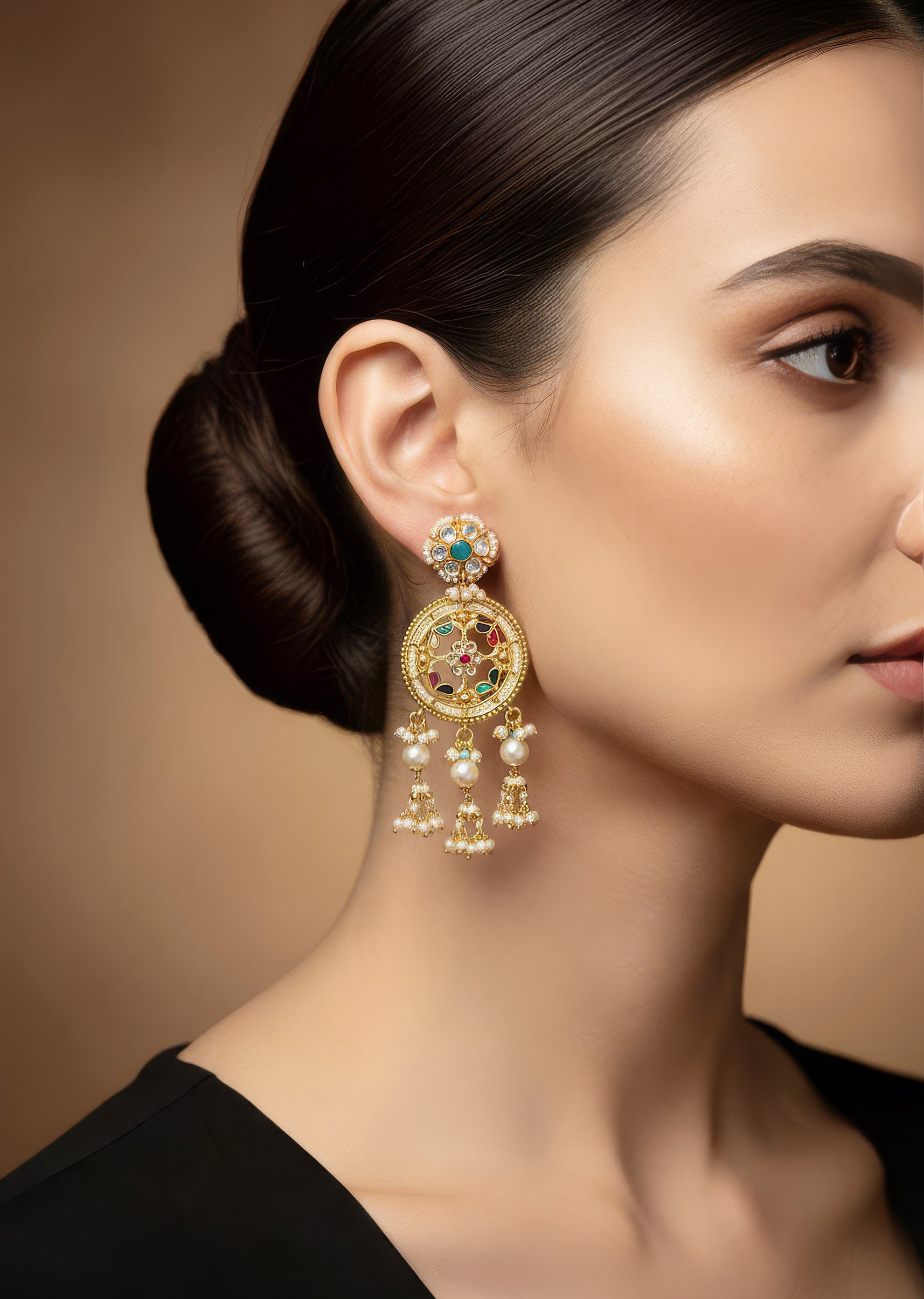 Gold Finish Earrings With Traditional Temple Motifs And Green Purple Red Yellow and Blue Simulated Stones And Faux Pearls.