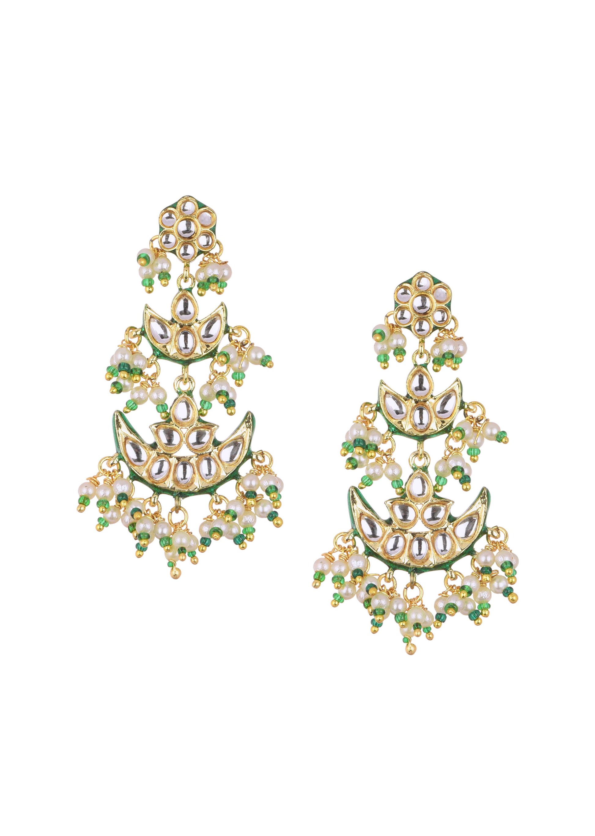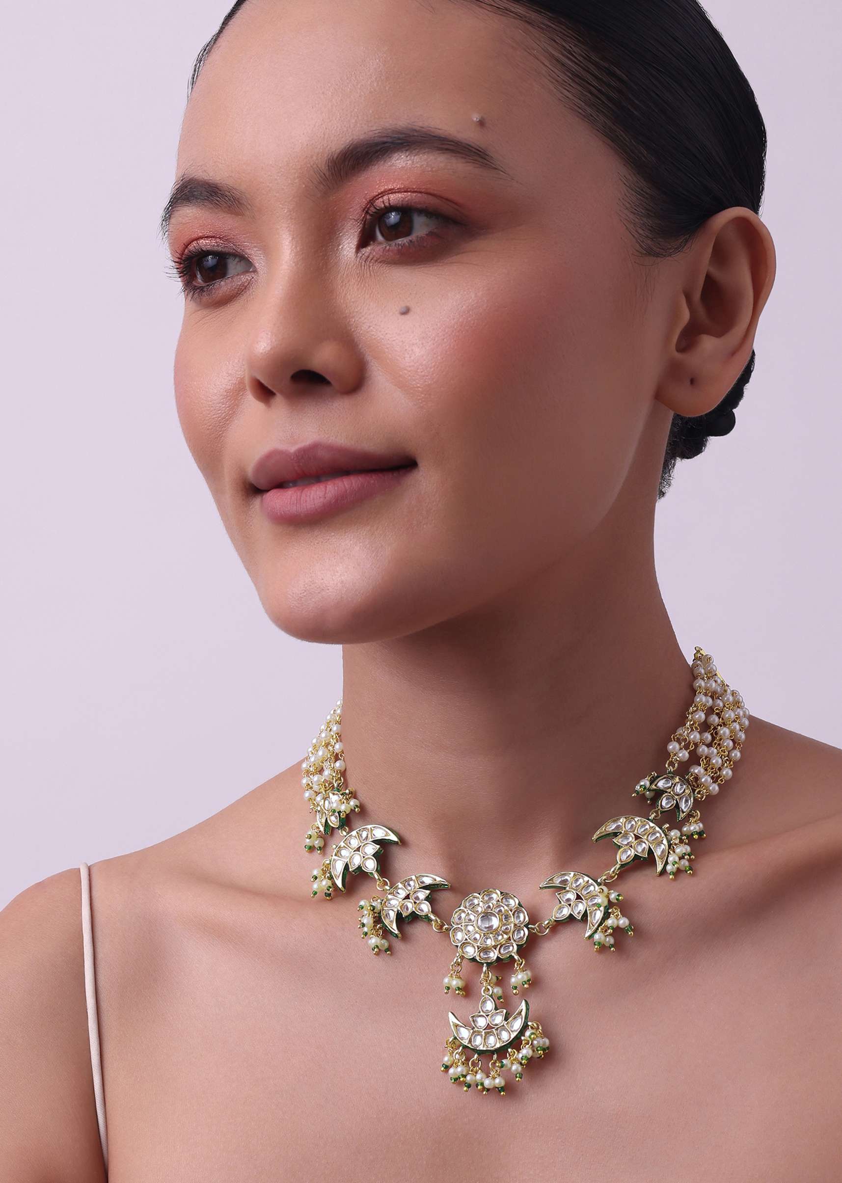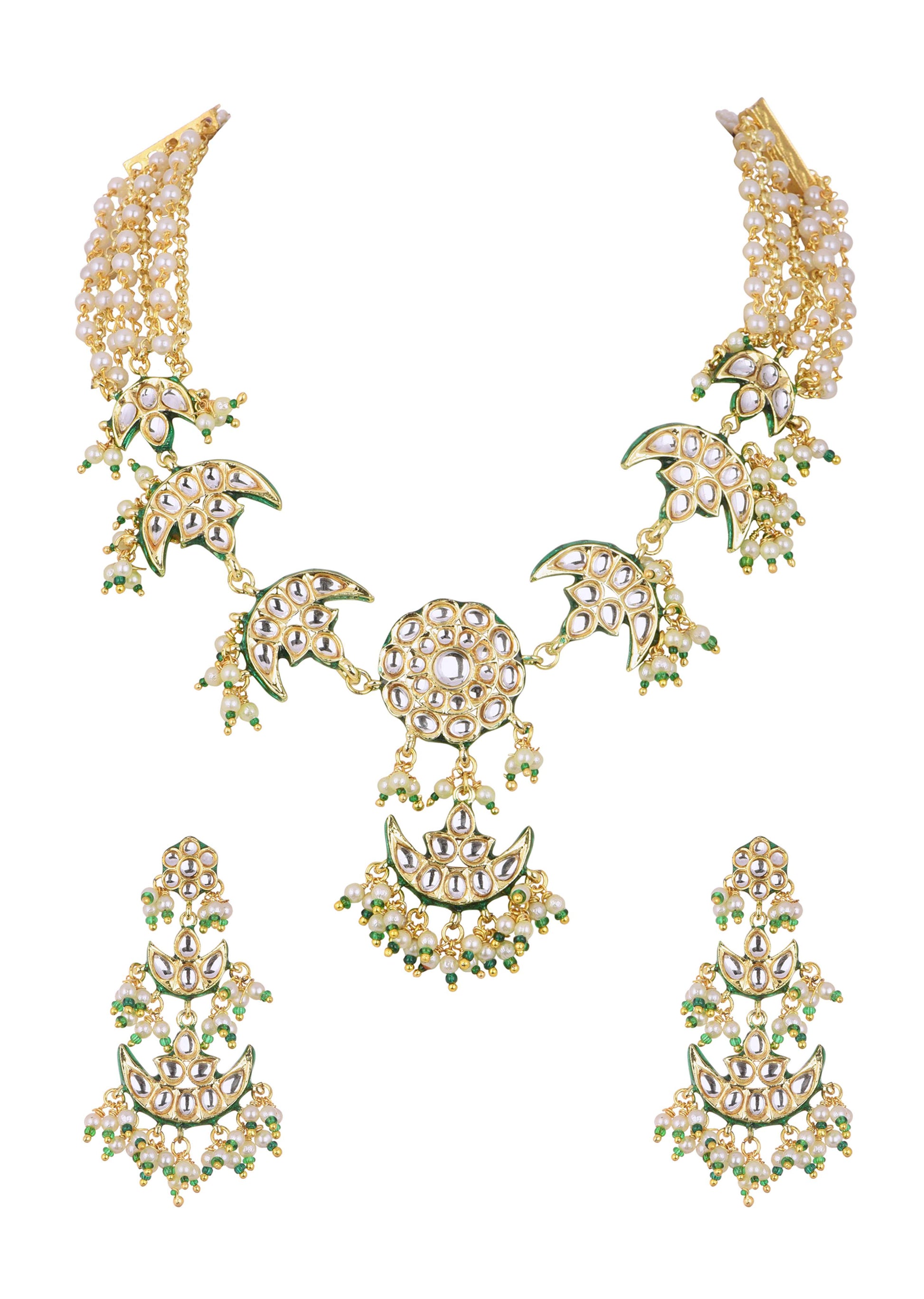 Step into a world of enchantment with our gold finish green kundan necklace set in mix metal a true testament to timeless beauty. The matching danglers complement the necklace adding a touch of intricate artistry. The set is adorned with exquisite beads and pearls. EVENT - Perfect for all festive occasions.Store in a dust bag. Keep away from moisture perfume alcohol and harsh chemicals. Spot clean only. Keep away from sharp objects. Actual color may slightly vary due to photographic lighting sources and device screen settings. Awarded as the Most Trusted Brand, we're delivering styles you love, just as promised.