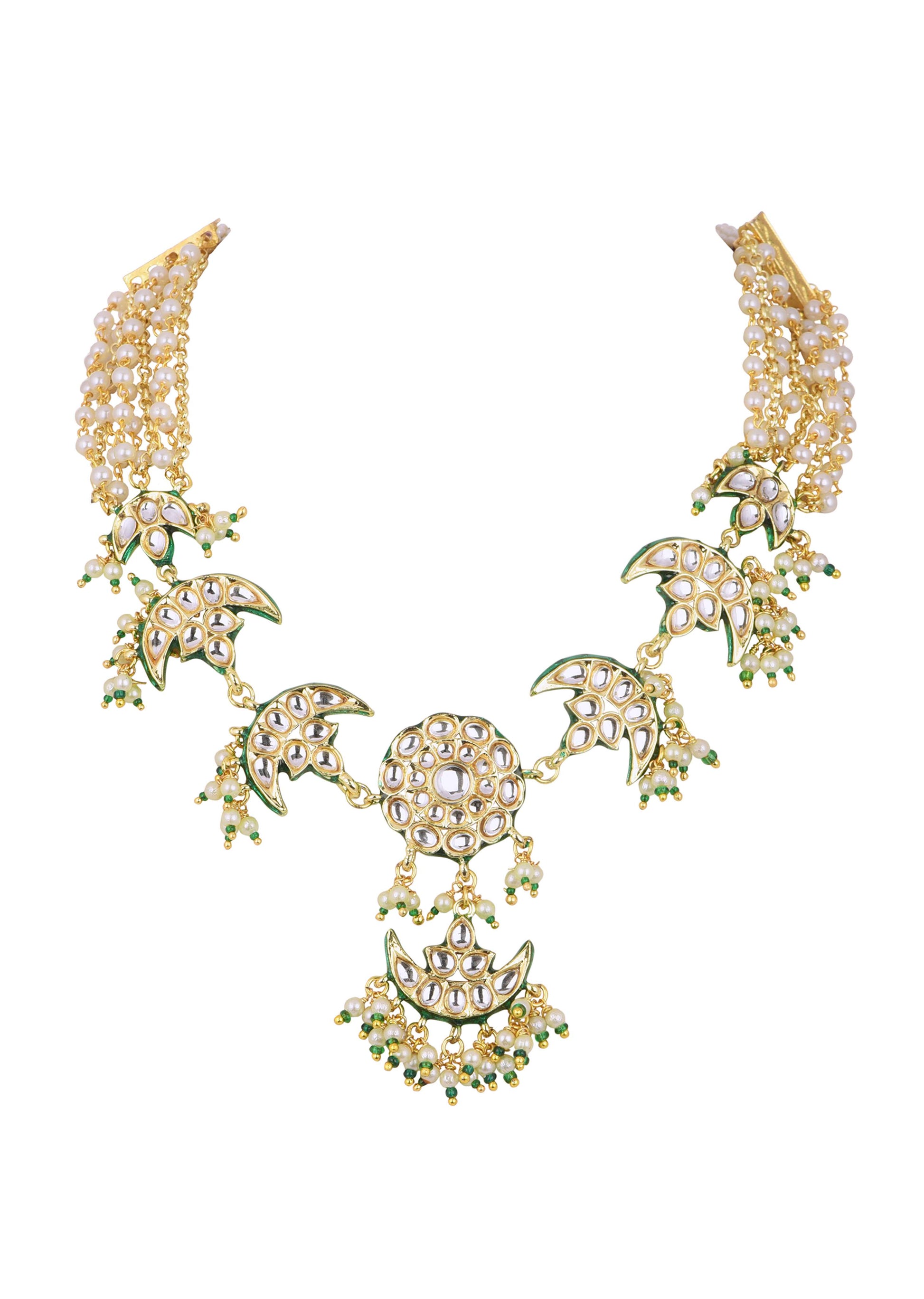 Gold Finish Green Kundan Necklace Set With Beads And Pearls