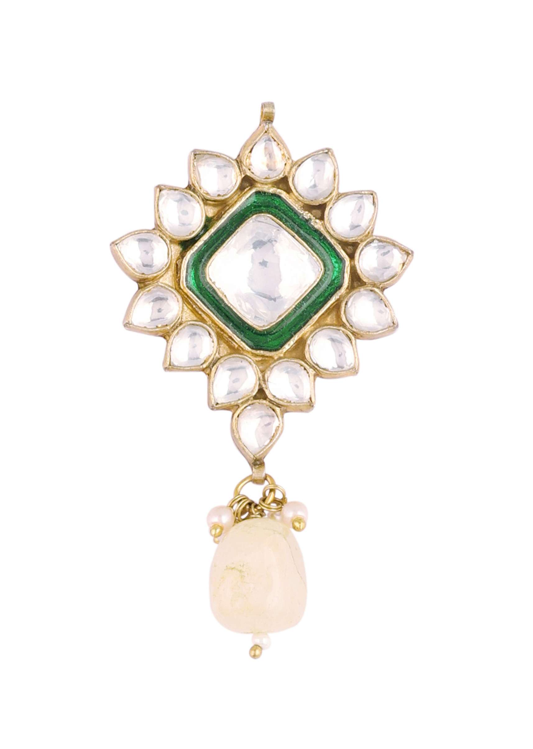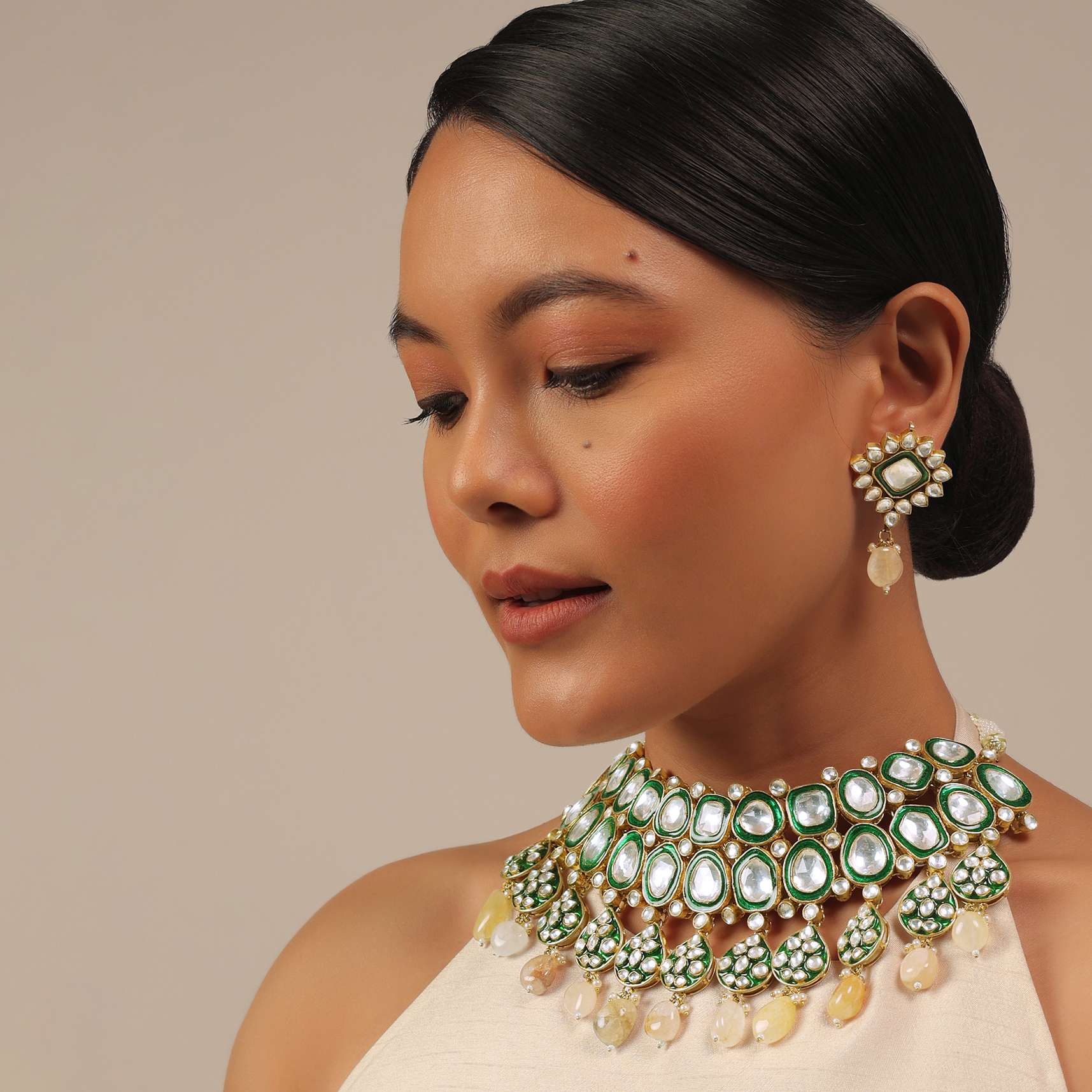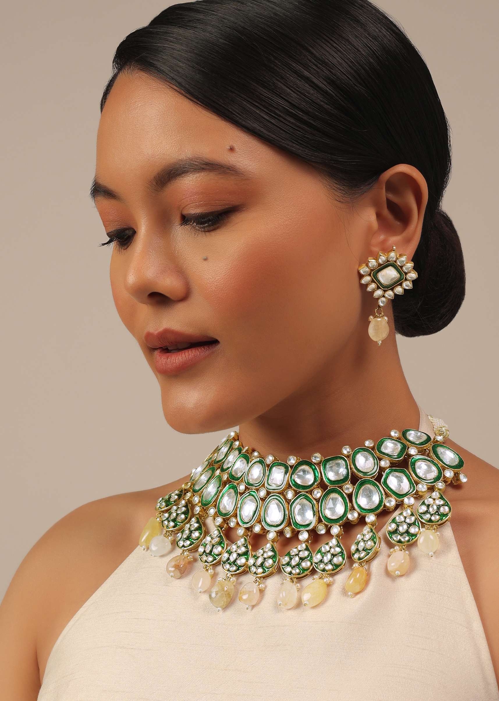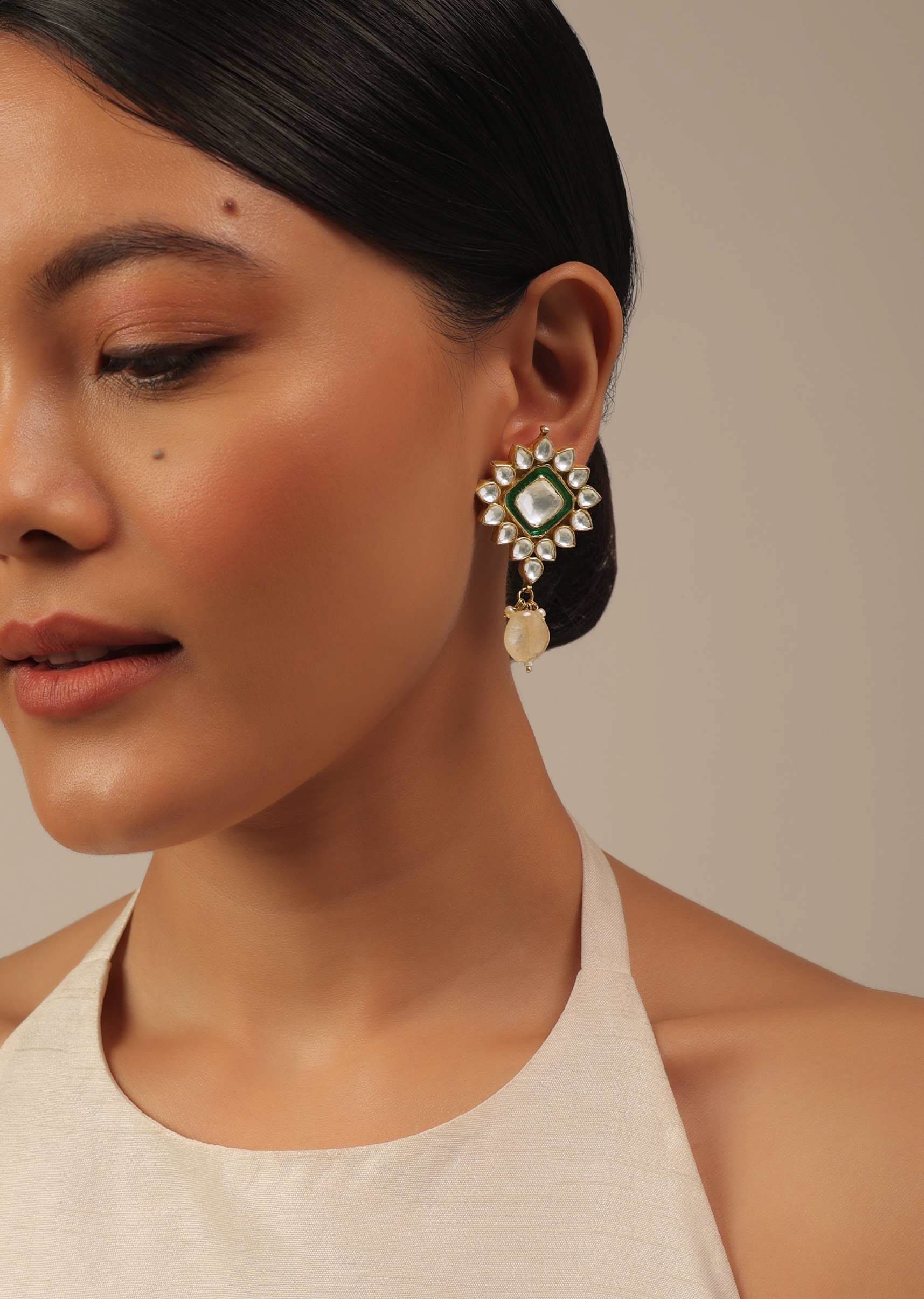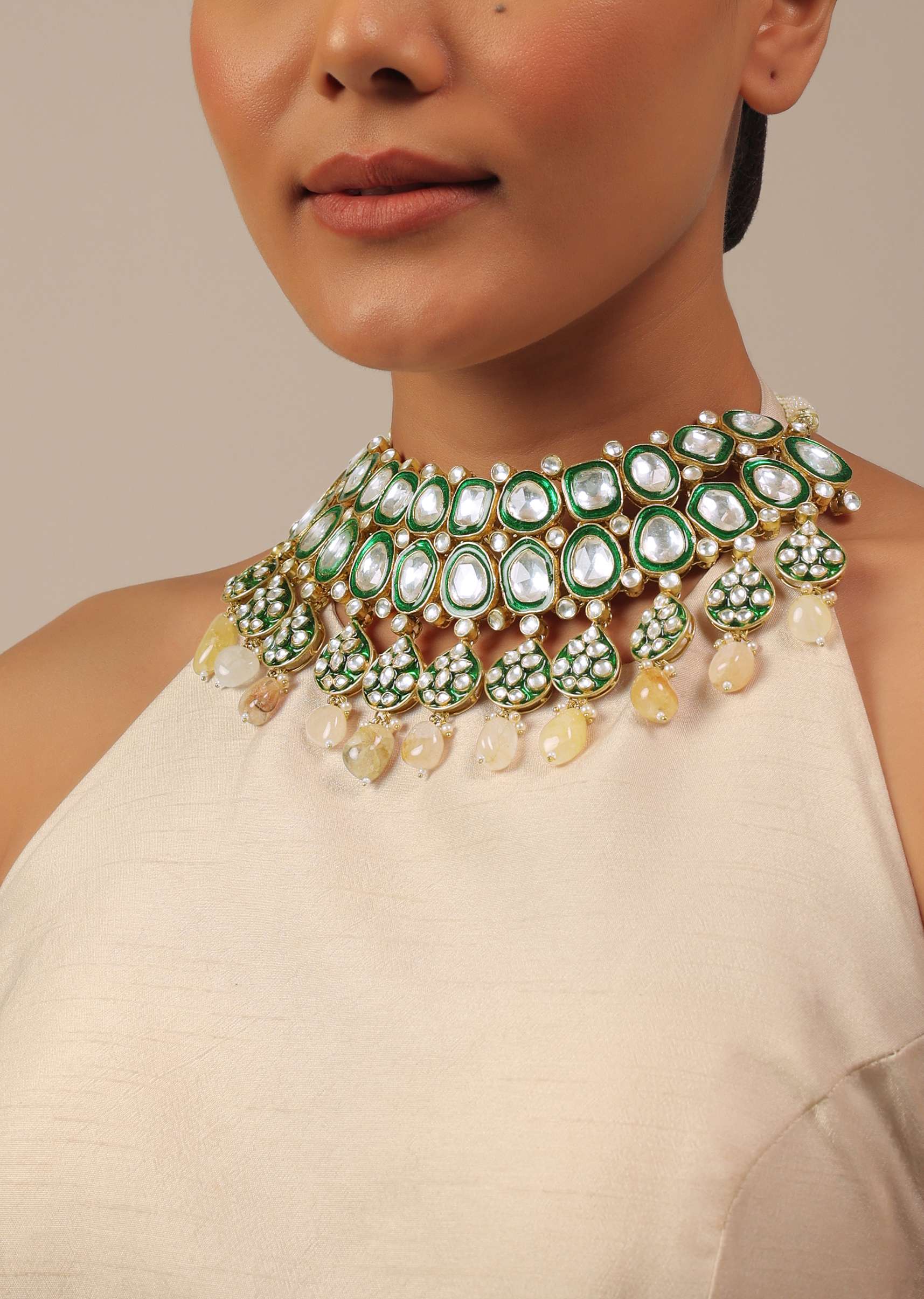 This luxurious gold finish green kundan polki choker set is just what you need to wear on your special day.Crafted with splendid attention to detail, this set features intricate detailing and a stunning green kundan and polki stone centerpiece that sits beautifully on the collarbone.The choker is adjustable to ensure the perfect fit and features delicate drops of stones for added elegance.The matching earrings feature the same gorgeous green kundan and polki stones with a gold finish to match the choker. The jewelry set is polished and anti-tarnish.Avoid contact with water, chemicals, harsh liquids, perfumes, etc.Do not wear this piece of jewelry while showering, gymming, swimming, etc.Hard contact must be avoided completely.Please keep the product away from moisture and humidity when not in use.Baroque pearls and Natural stones can range from minor aberrations to distinctly ovoid, curved, pinched, or lumpy shapes.Slight variations in design may vary. Awarded as the Most Trusted Brand, we're delivering styles you love, just as promised.