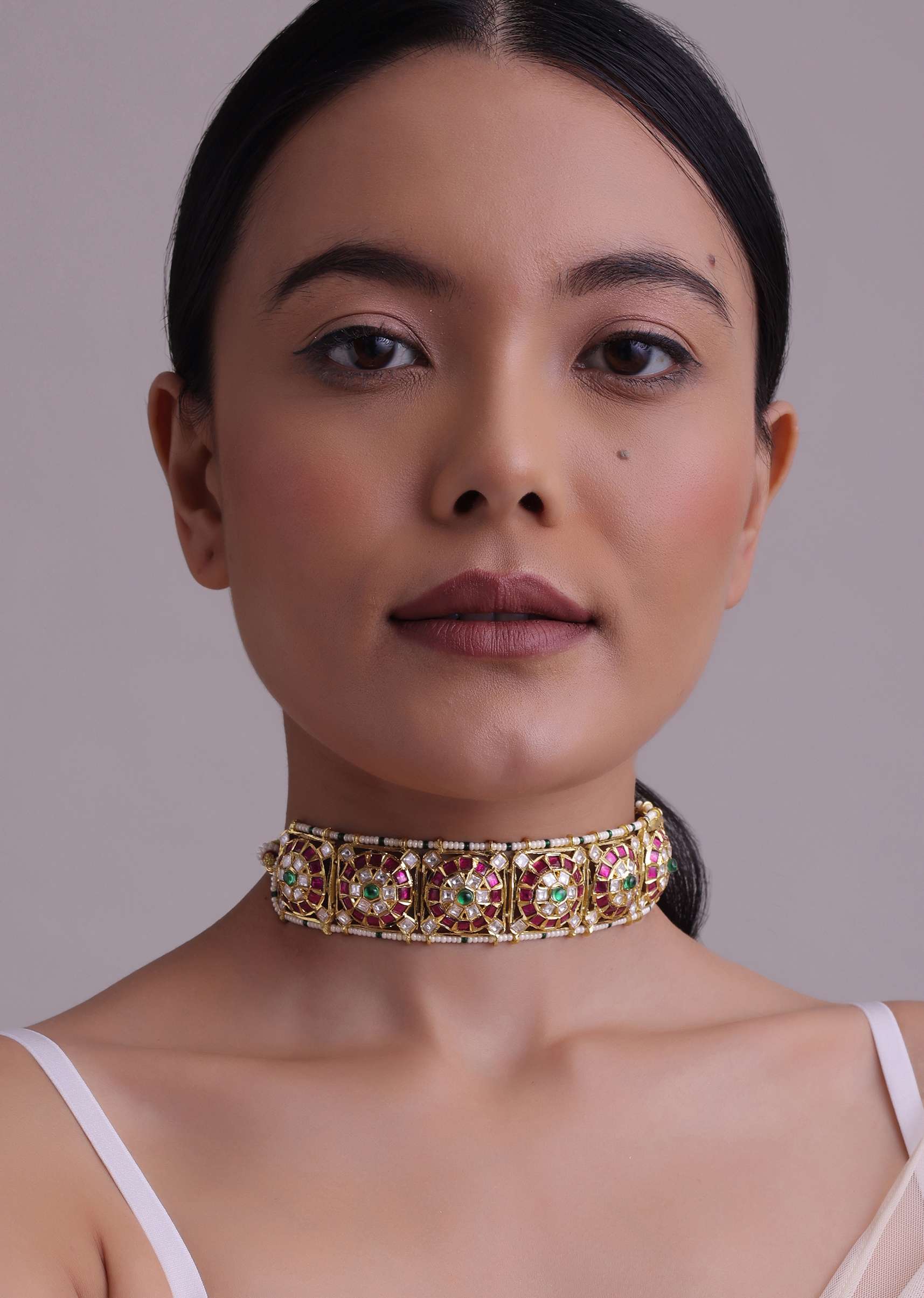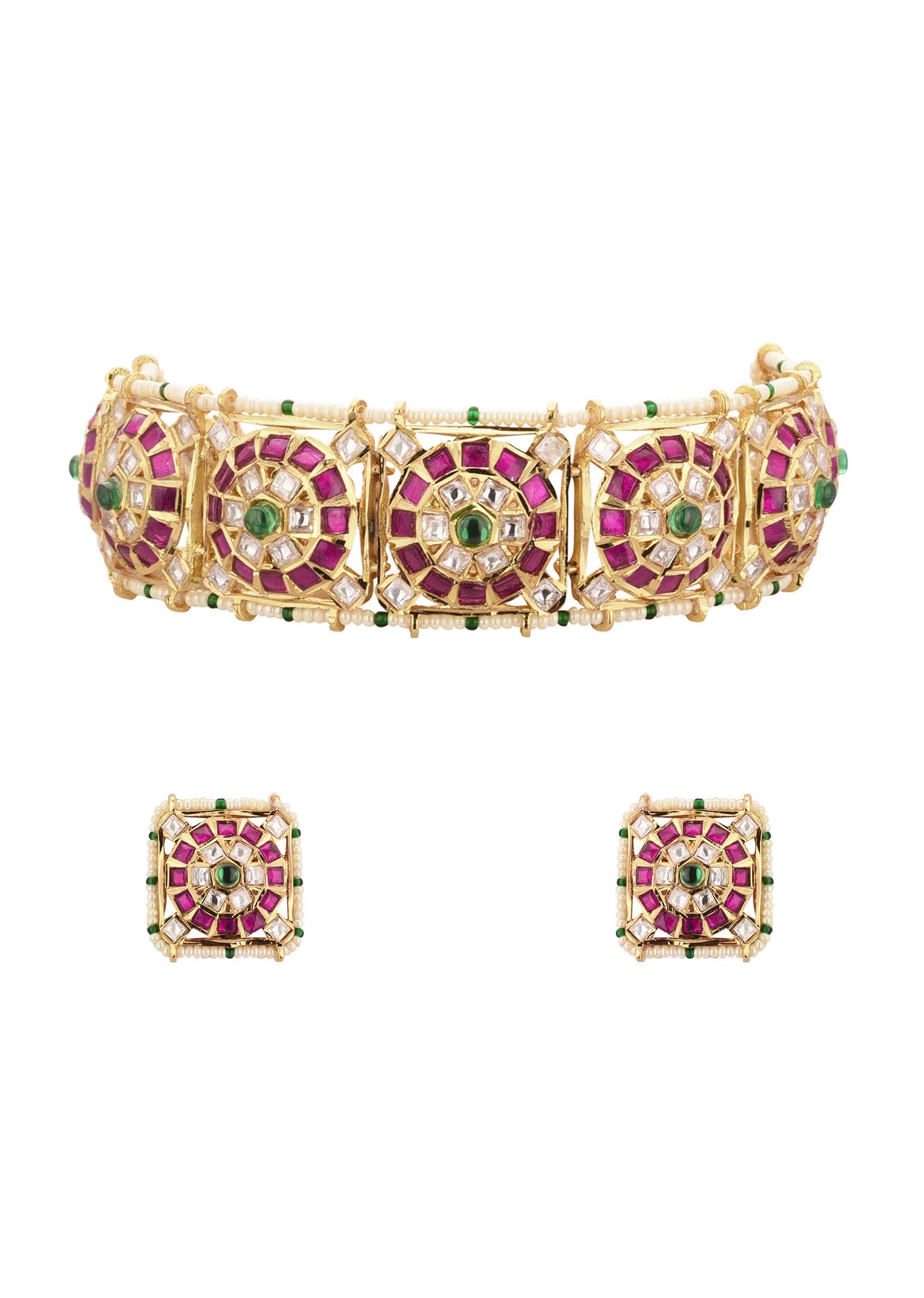 Introducing our gorgeous gold-finish jadau choker and earring set in mixed metal. The set is adorned with a beautiful array of red-green stones and elegant studs. This luxurious set will add an air of regal elegance to any outfit.EVENT - Perfect for weddings, engagements, or parties.Avoid contact with water, chemicals, harsh liquids, perfumes, etc.Do not wear this piece of jewelry while showering, gymming, swimming, etc.Hard contact must be avoided completely.Please keep the product away from moisture and humidity when not in use.Baroque pearls and Natural stones can range from minor aberrations to distinctly ovoid, curved, pinched, or lumpy shapes.Slight variations in design may vary. Awarded as the Most Trusted Brand, we're delivering styles you love, just as promised.