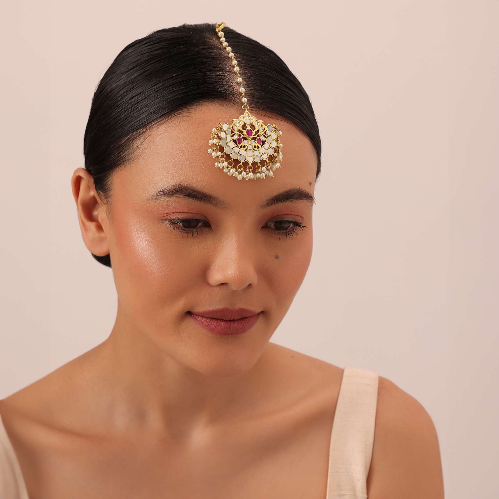 A traditional jadau kundan piece that's sure to take your entire look a notch higher. The jewelry piece is perfect when paired with some traditional and festive outfits, for an ecstatic Indian look with minimal makeup, traditional sarees, or suits to create a breathtaking ethnic look for your upcoming festivities.