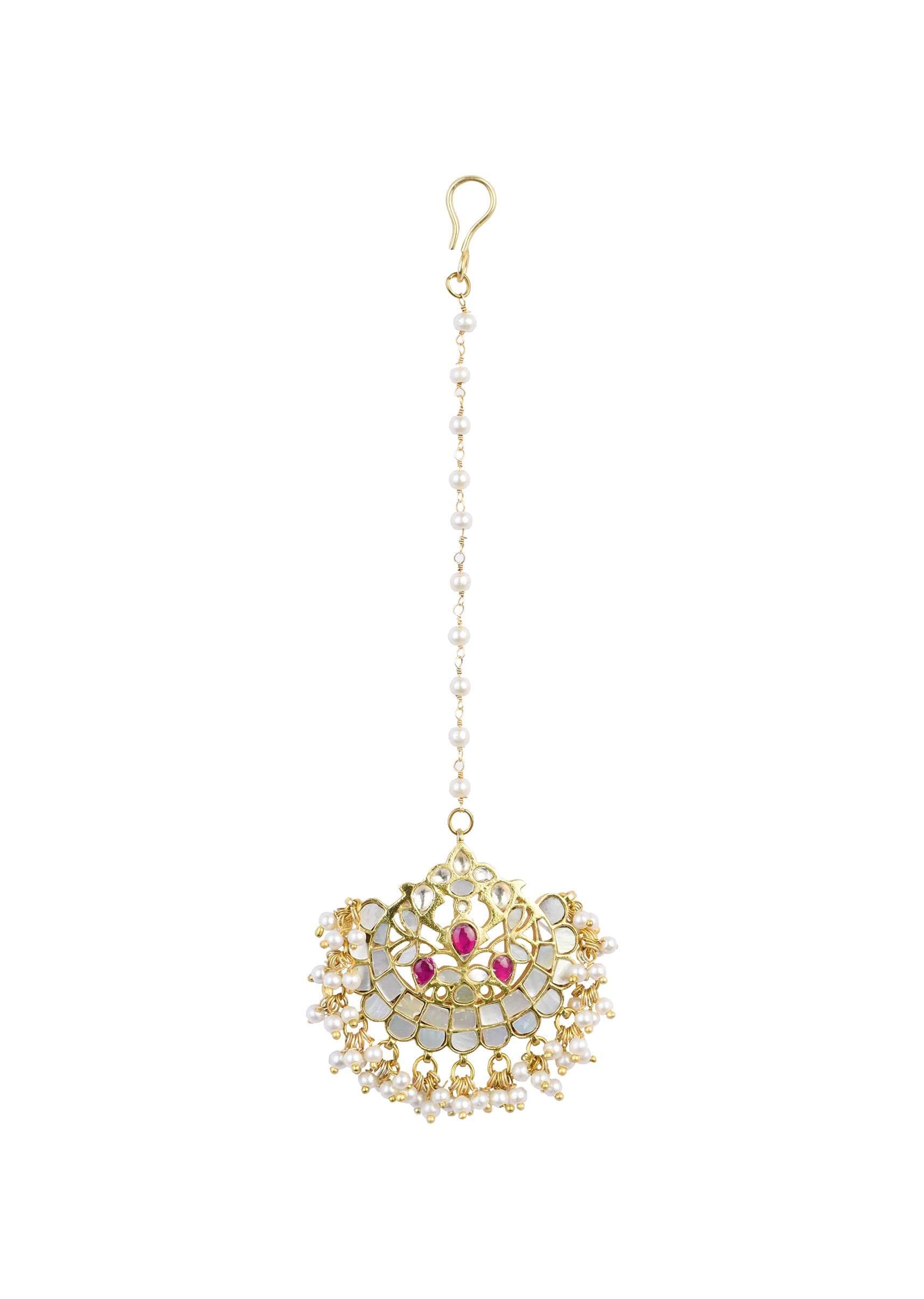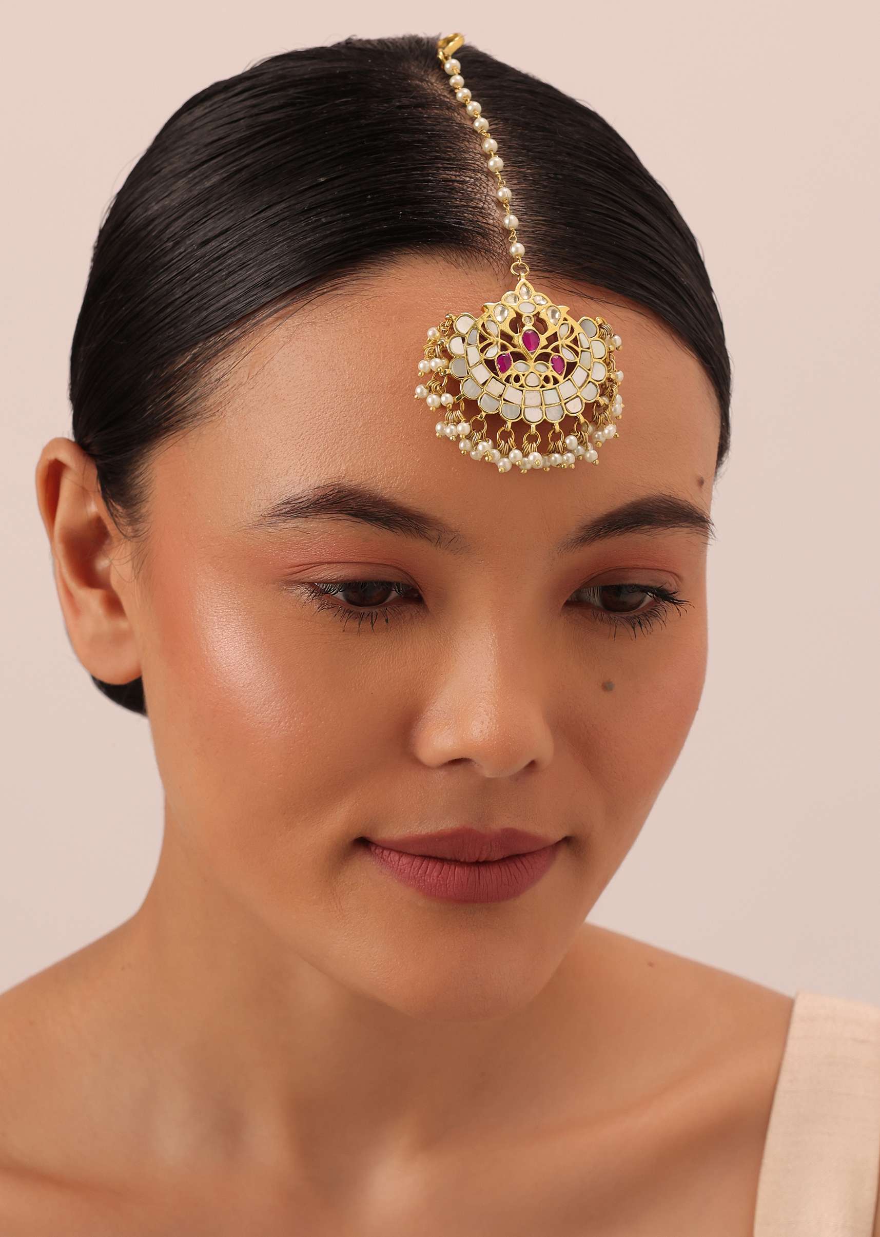 Gold Finish Jadau Kundan Multicolor Maangteeka With Synthetic Stones And Beads