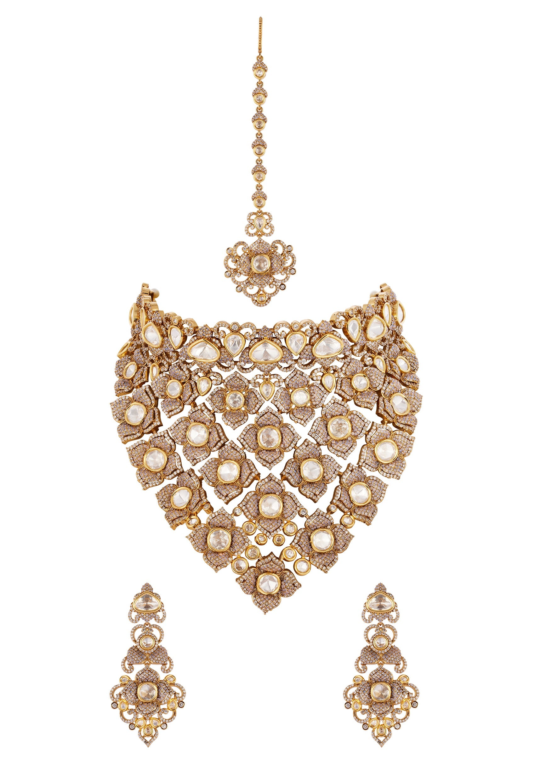A handcrafted gold jewellery set created using the traditional Kundan/Jadau technique, featuring Polki uncut diamonds and semi precious stones with delicate drops. The exquisite craftsmanship reflects classic Indian jewelry traditions... More Product Details