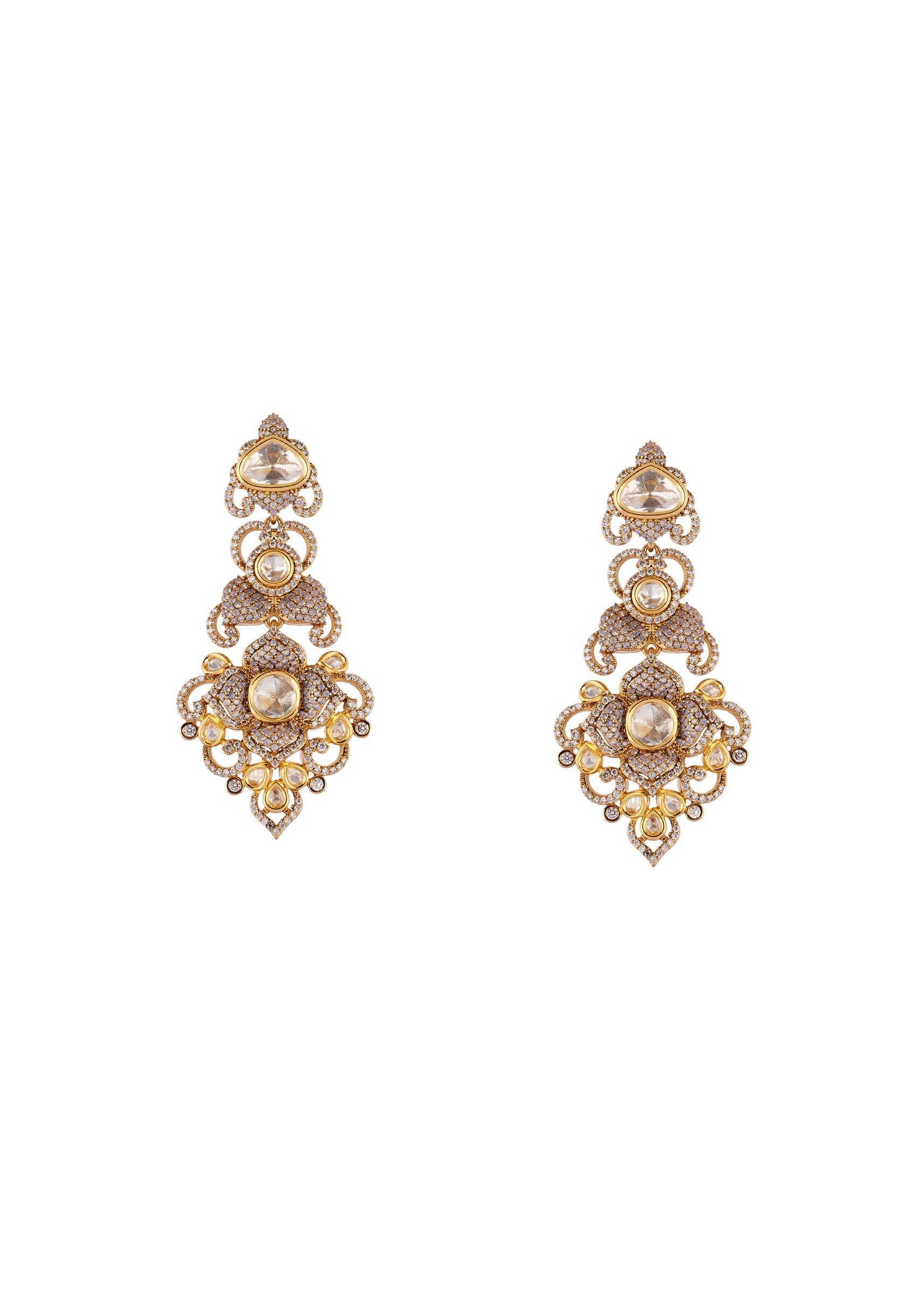 A handcrafted gold jewellery set created using the traditional Kundan/Jadau technique, featuring Polki uncut diamonds and semi precious stones with delicate drops. The exquisite craftsmanship reflects classic Indian jewelry traditions while offering a regal and festive appeal, perfect for weddings and special celebrations.