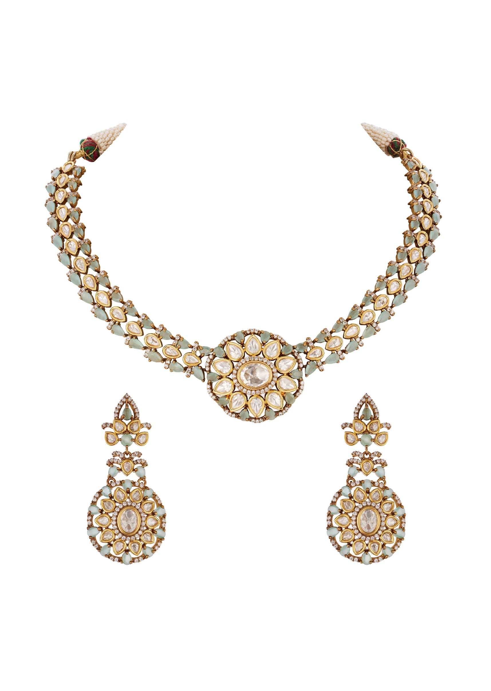 A handcrafted gold white jewellery set created using the traditional Kundan Jadau technique. It features semi precious stones with delicate drops reflecting exquisite craftsmanship and classic Indian jewelry traditions. Perfect... More Product Details