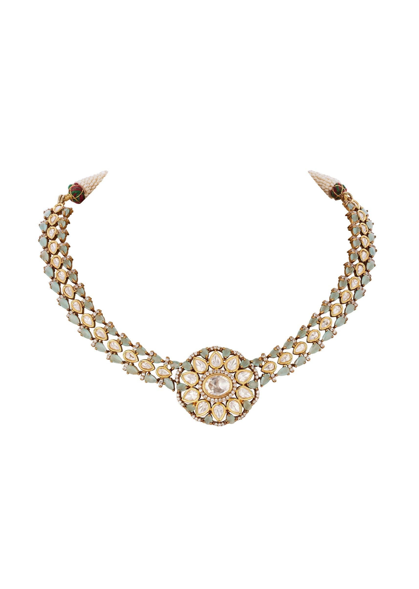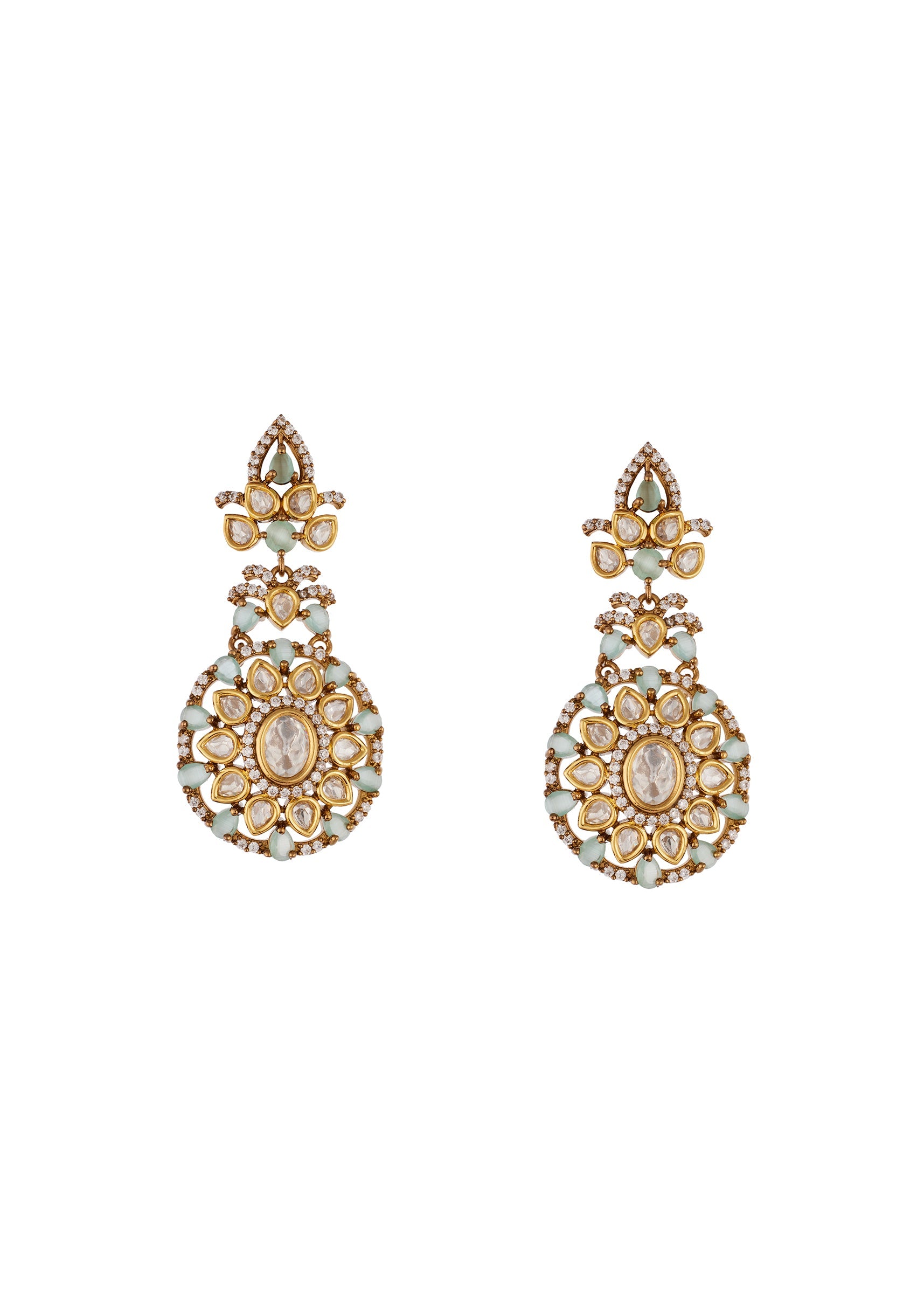 Pair with a richly embroidered lehenga or saree to highlight the semi precious stones and delicate drops.