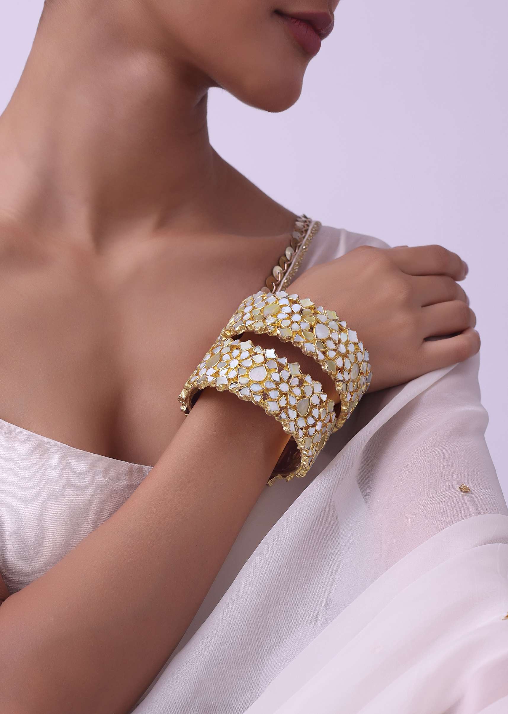 Enhance your elegance with our exquisite gold finish kundan bangles crafted in mix metal. These stunning bangles feature intricate kundan work and a luxurious gold finish creating a regal and timeless design.EVENT - Perfect for all festive and formal occasions.Avoid contact with water chemicals harsh liquids perfumes etc. Do not wear this piece of jewelry while showering gym swimming etc. Please keep the product away from moisture and humidity when not in use. Slight variations in design may vary. Being rewarded as the most trusted brand our customers believe we deliver the same styles as promised on the website. Awarded as the Most Trusted Brand, we're delivering styles you love, just as promised.