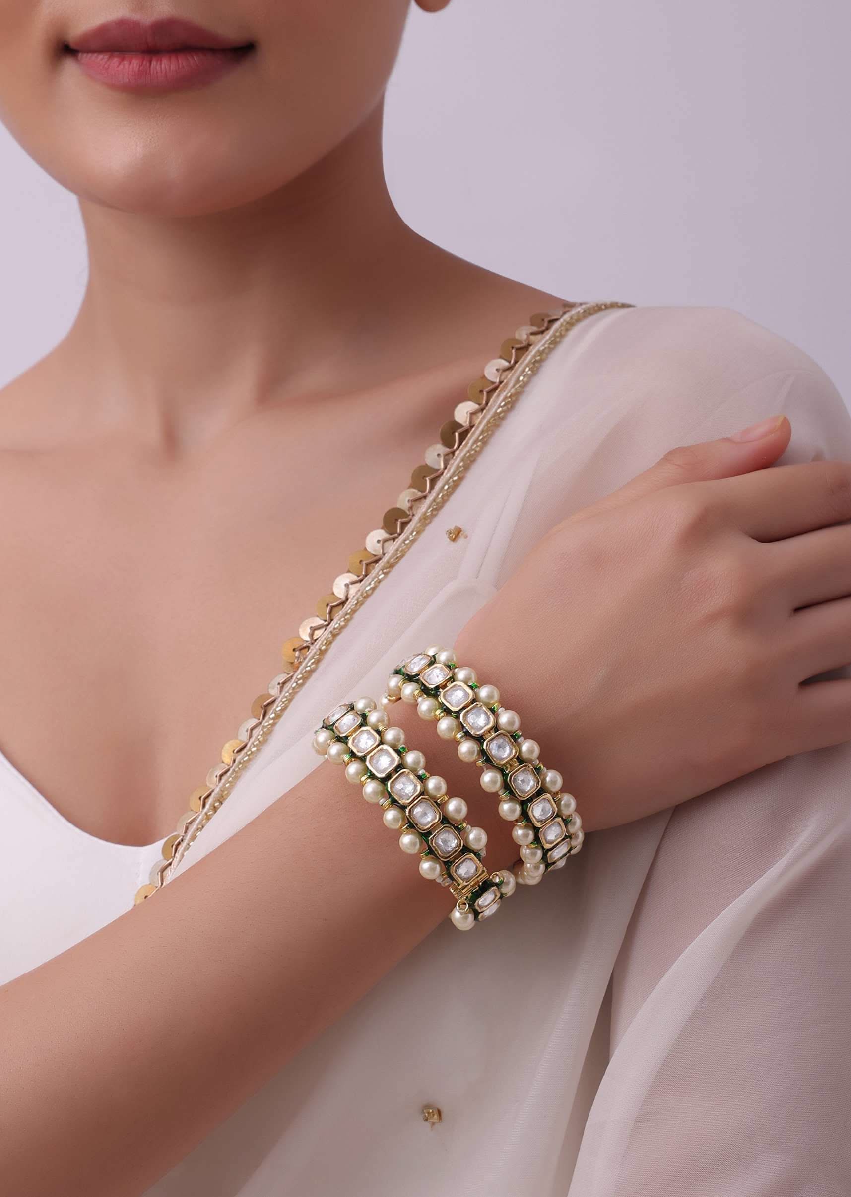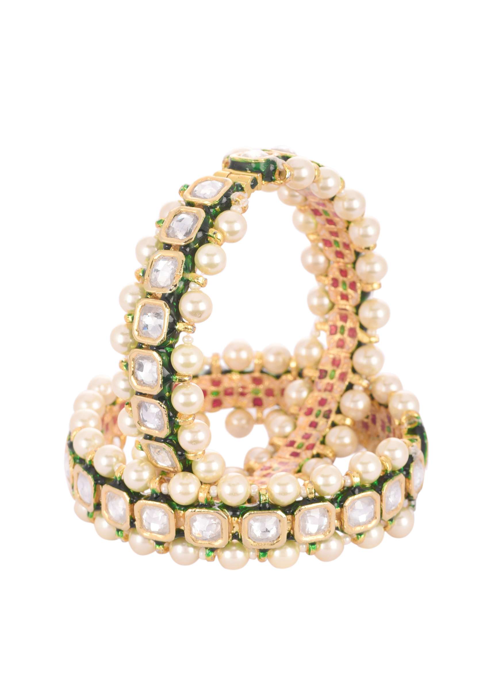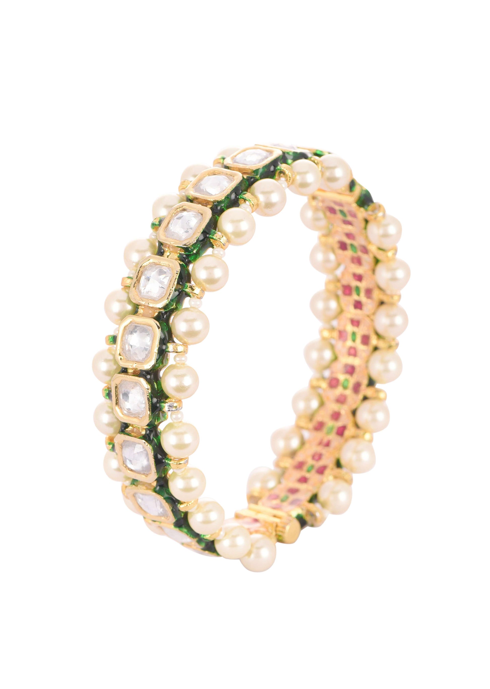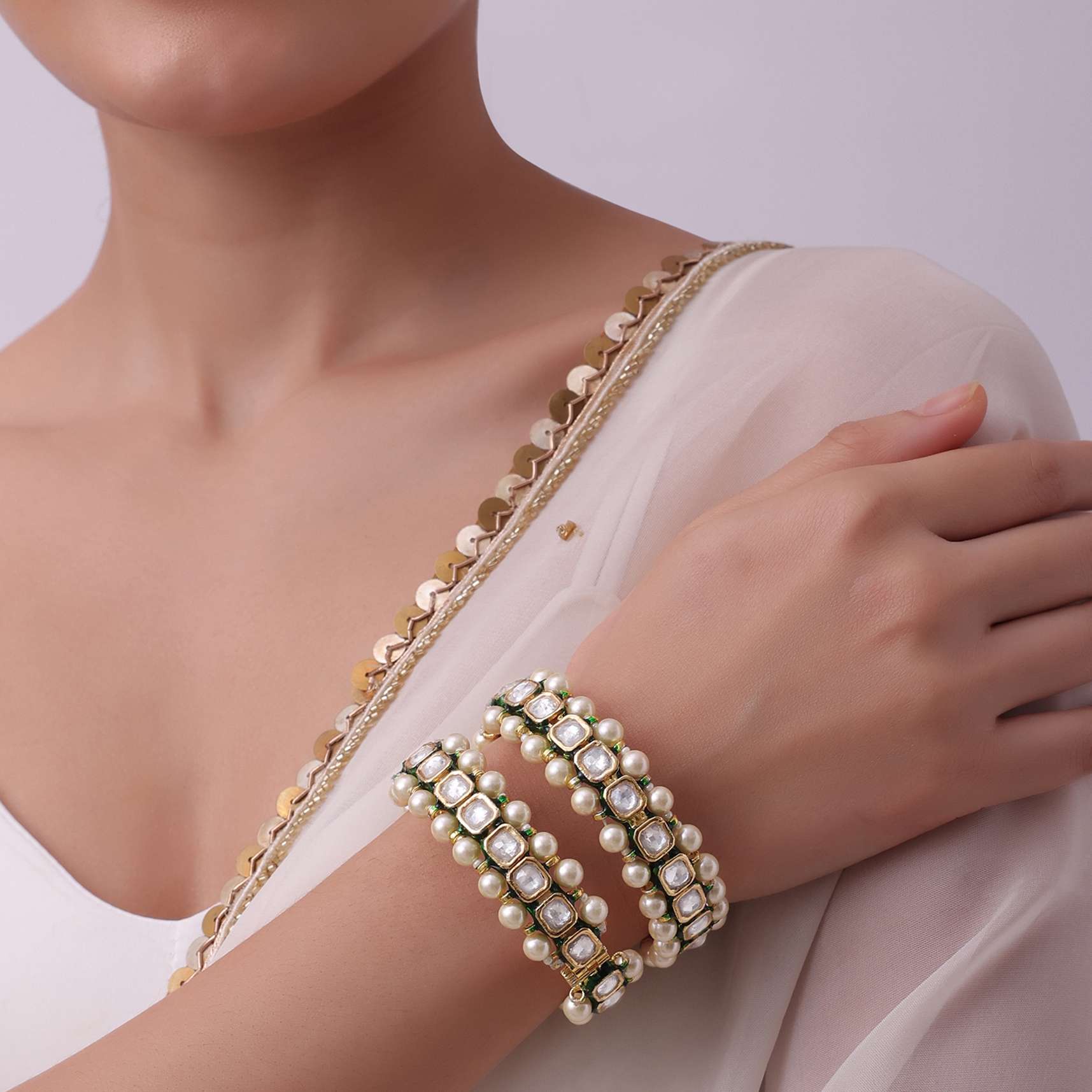Elevate your festive attire with our gold-finish kundan bangles adorned with green meenakari and pearls. This set of two bangles is a masterpiece of craftsmanship, crafted in mix metal. EVENT - Perfect for weddings and festive occasions. Store in a dust bag. Keep away from moisture, perfume, alcohol, and harsh chemicals. Spot clean only. Keep away from sharp objects. A. Awarded as the Most Trusted Brand, we're delivering styles you love, just as promised.