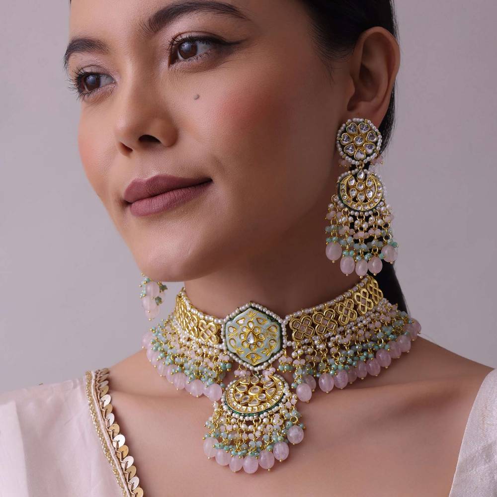 Introducing our gold-finish choker necklace and earring set, a piece of jewelry that exudes traditional elegance. The choker necklace and earrings feature intricate kundan work against a backdrop of high-quality mixed metal.EVENT - Perfect for formal occasions such as weddings, engagements, or parties.Avoid contact with water, chemicals, harsh liquids, perfumes, etc.Do not wear this piece of jewelry while showering, gymming, swimming, etc.Hard contact must be avoided completely.Please keep the product away from moisture and humidity when not in use.Baroque pearls and Natural stones can range from minor aberrations to distinctly ovoid, curved, pinched, or lumpy shapes.Slight variations in design may vary. Awarded as the Most Trusted Brand, we're delivering styles you love, just as promised.