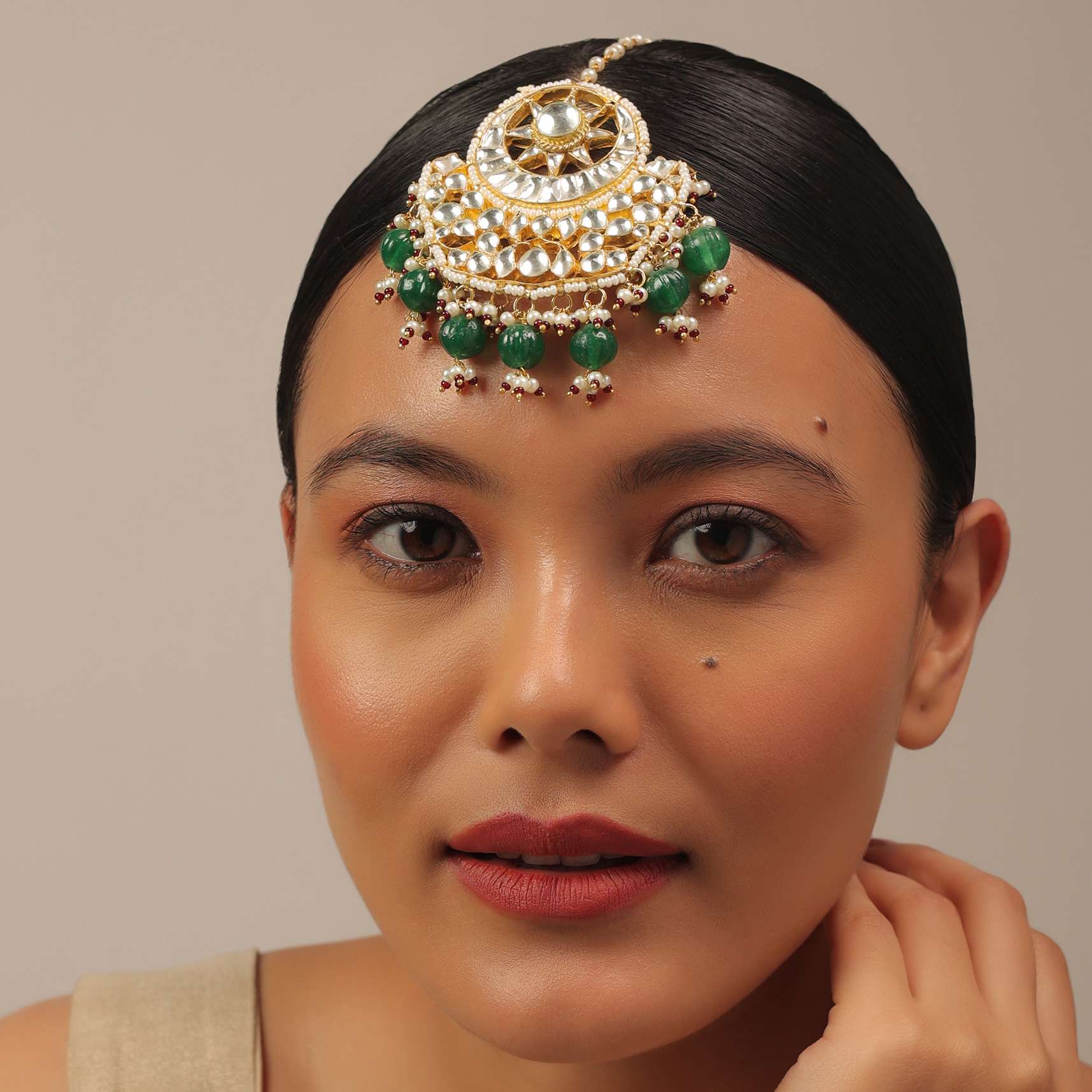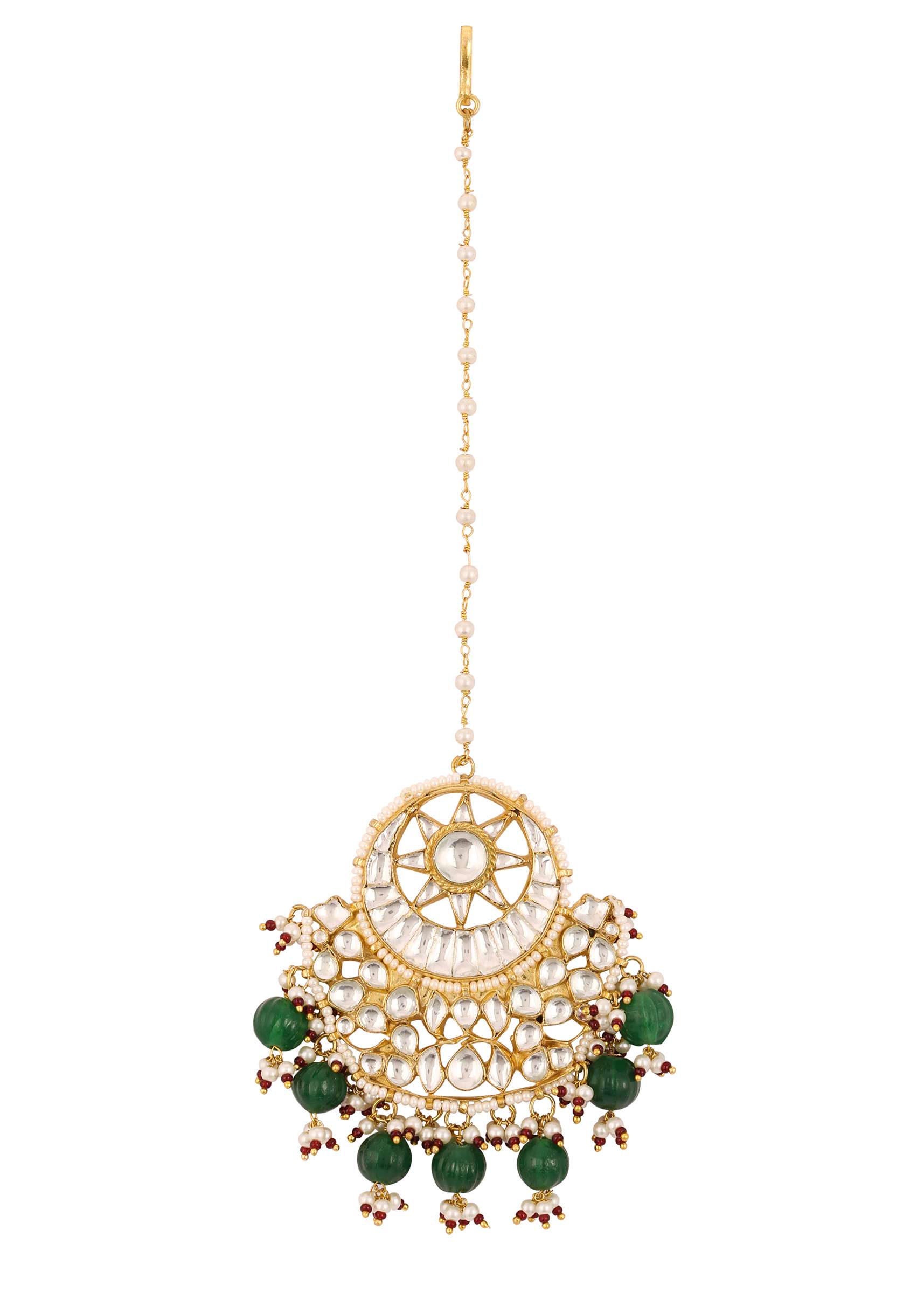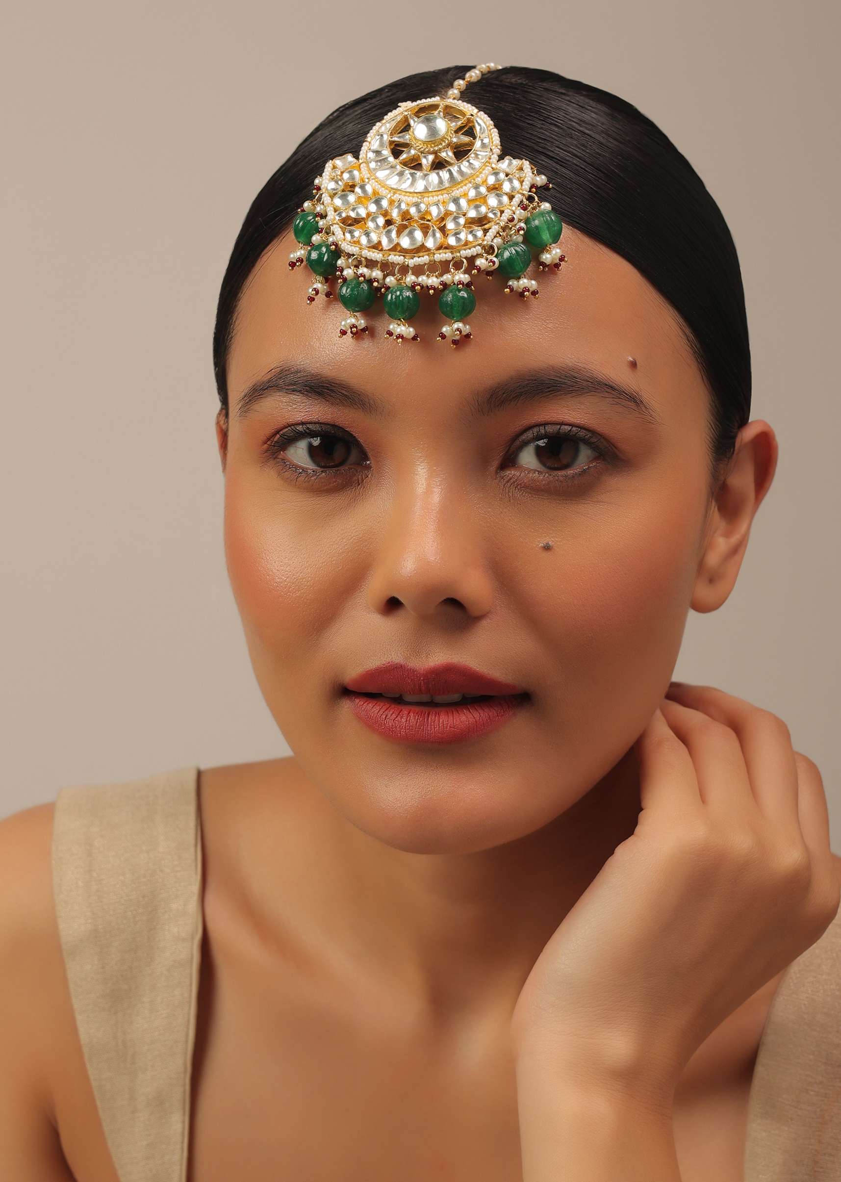 Gold Finish Kundan Floral Maangtika With Synthetic Emerald Stones And Beads