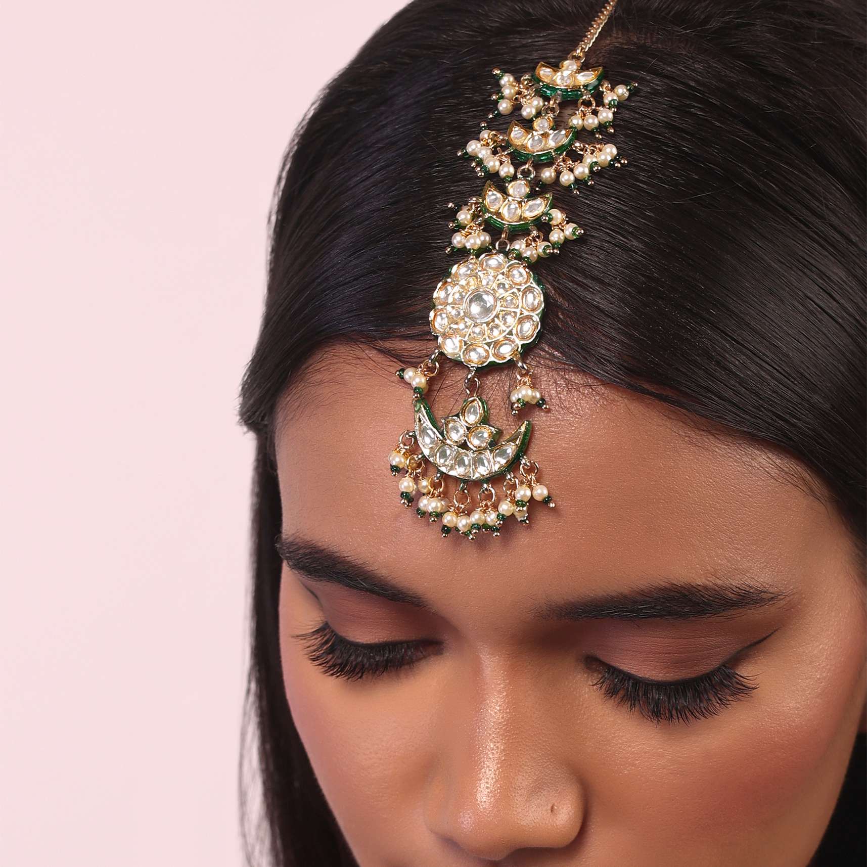 An enigmatic maangteeka with gold finish kundan and pearls. Made with intricate detailing and craftsmanship. Handcrafted using best quality material. The jewellery piece is polished and anti-tarnish. Avoid contact with... More Product Details