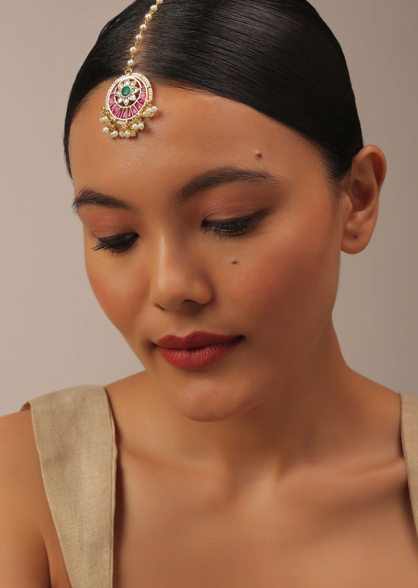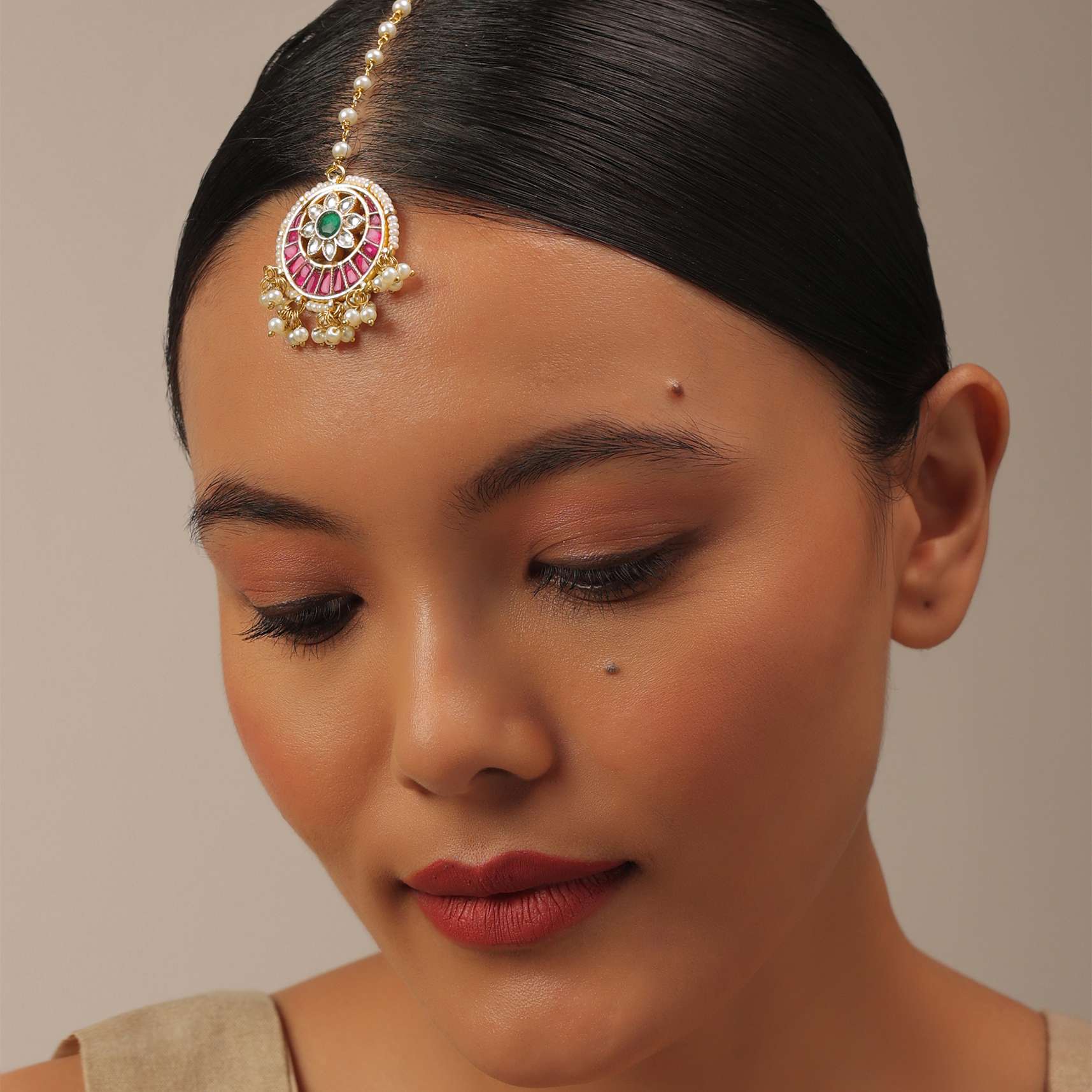 A gorgeous gold finish kundan piece in mixed metal, synthetic stones, and beads, crafted in a floral design that accentuates the piece's beauty. This is an opulent traditional piece with delicate bead hangings and the string is made in a bead chain style. The maangteekaka has a fish hook and speaks royalty with sheer tradition. Avoid contact with water, chemicals, harsh liquids, perfumes, etc. Hard contact must be avoided completely. Slight variations in design may vary. Awarded as the Most Trusted Brand, we're delivering styles you love, just as promised.