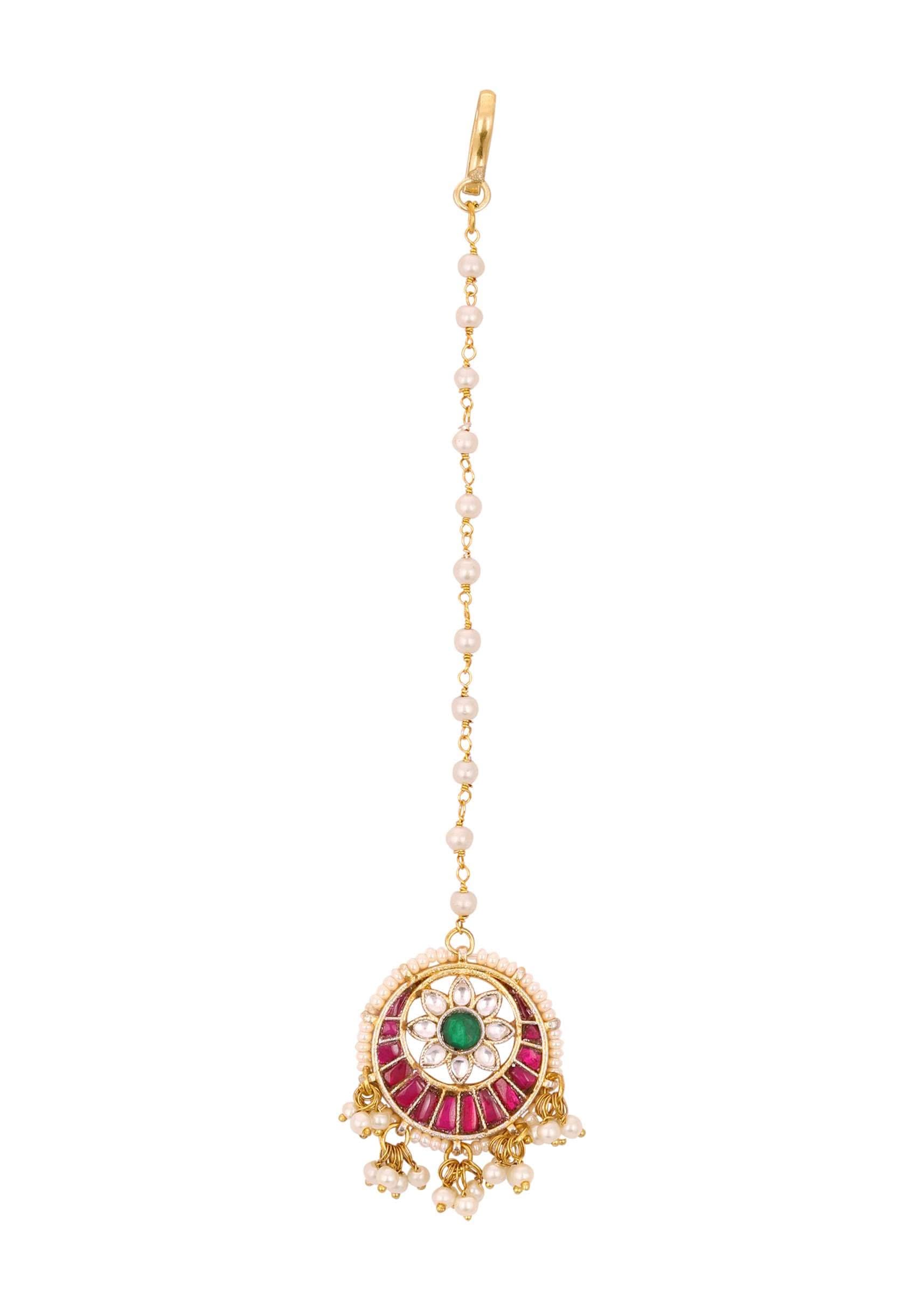 Gold Finish Kundan Multicolor Floral Maangtika With Synthetic Beads And Stones