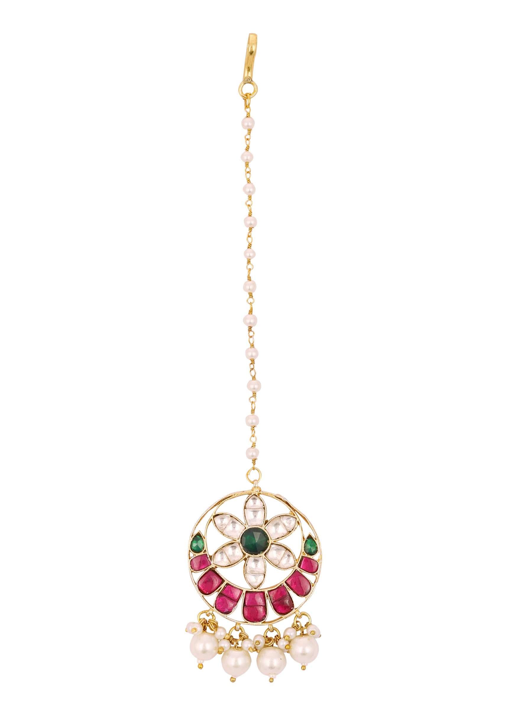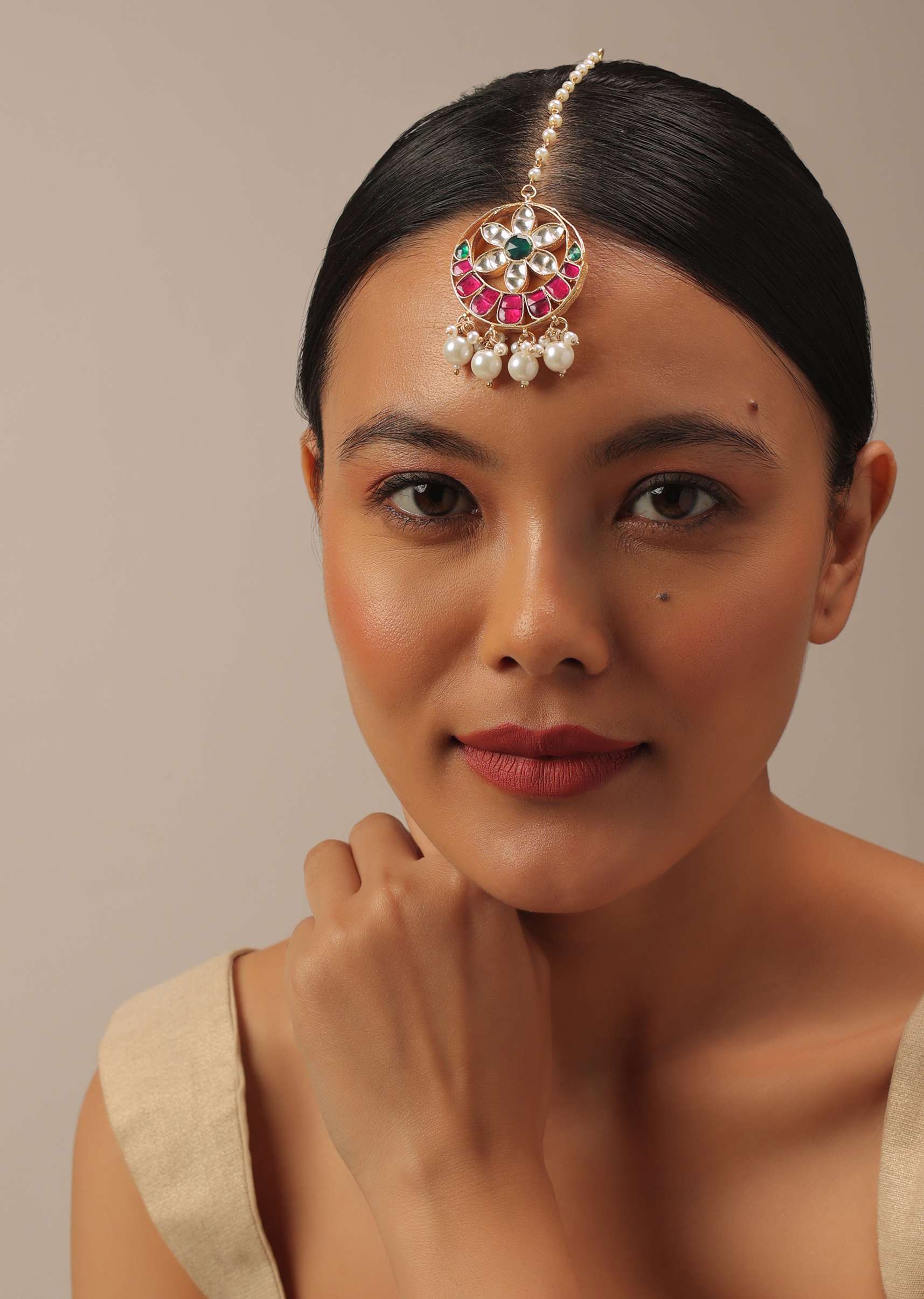 Gold Finish Kundan Multicolor Maangtika With Synthetic Stones And Beads