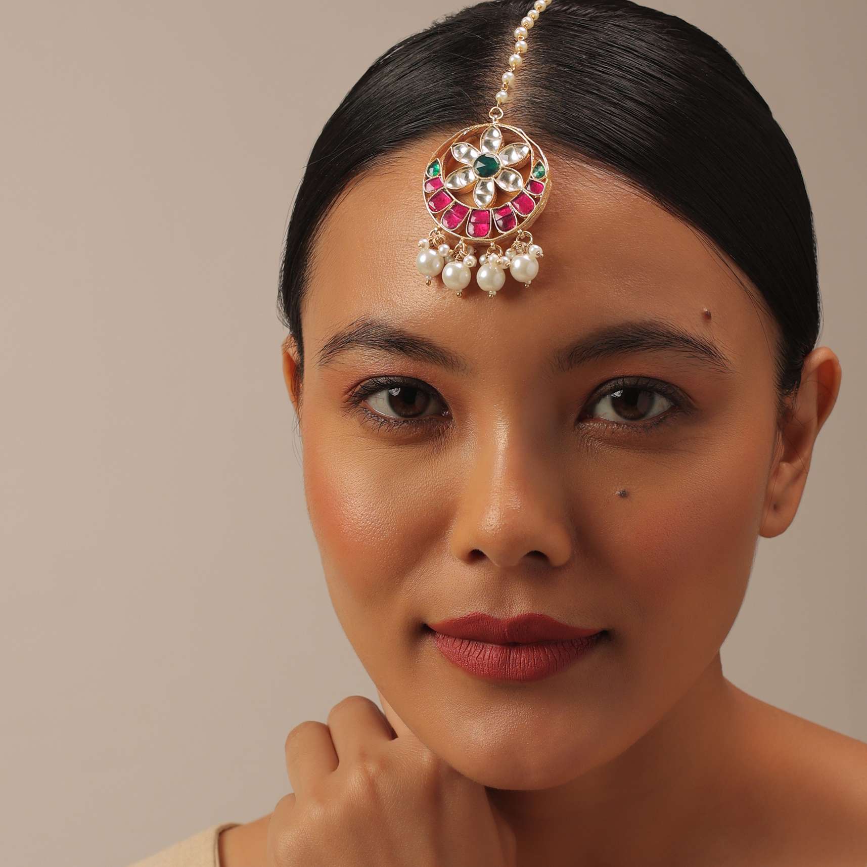A gorgeous gold finish kundan polki piece in mixed metal, and synthetic stones, crafted in a floral design that accentuates the piece's beauty. An opulent traditional piece that comes with delicate pearl hangings and a string made in a bead chain style. The maangteeka has a fish hook and speaks royalty with sheer tradition. Avoid contact with water, chemicals, harsh liquids, perfumes, etc. Hard contact must be avoided completely. Slight variations in design may vary. Awarded as the Most Trusted Brand, we're delivering styles you love, just as promised.