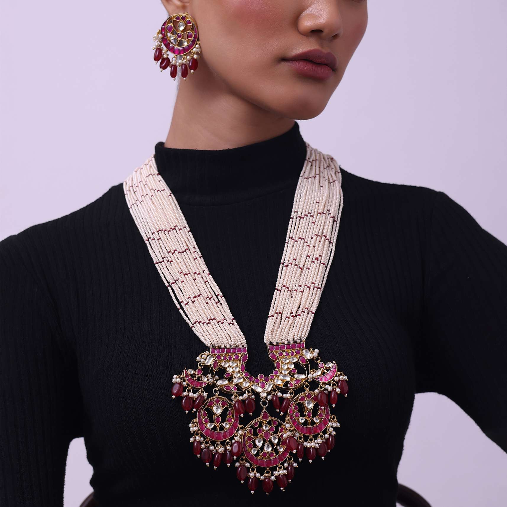 Make a statement at any function by pairing this necklace and earring set with a traditional Indian ensemble such as a saree or a lehenga.